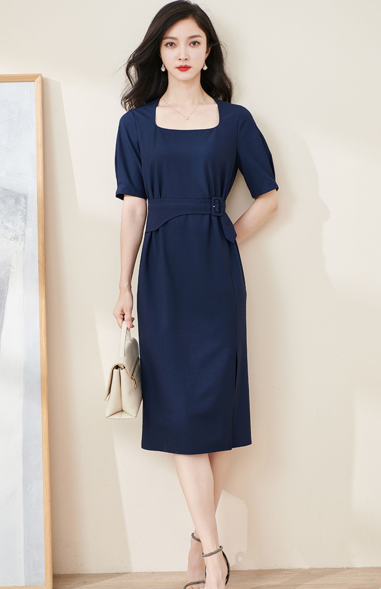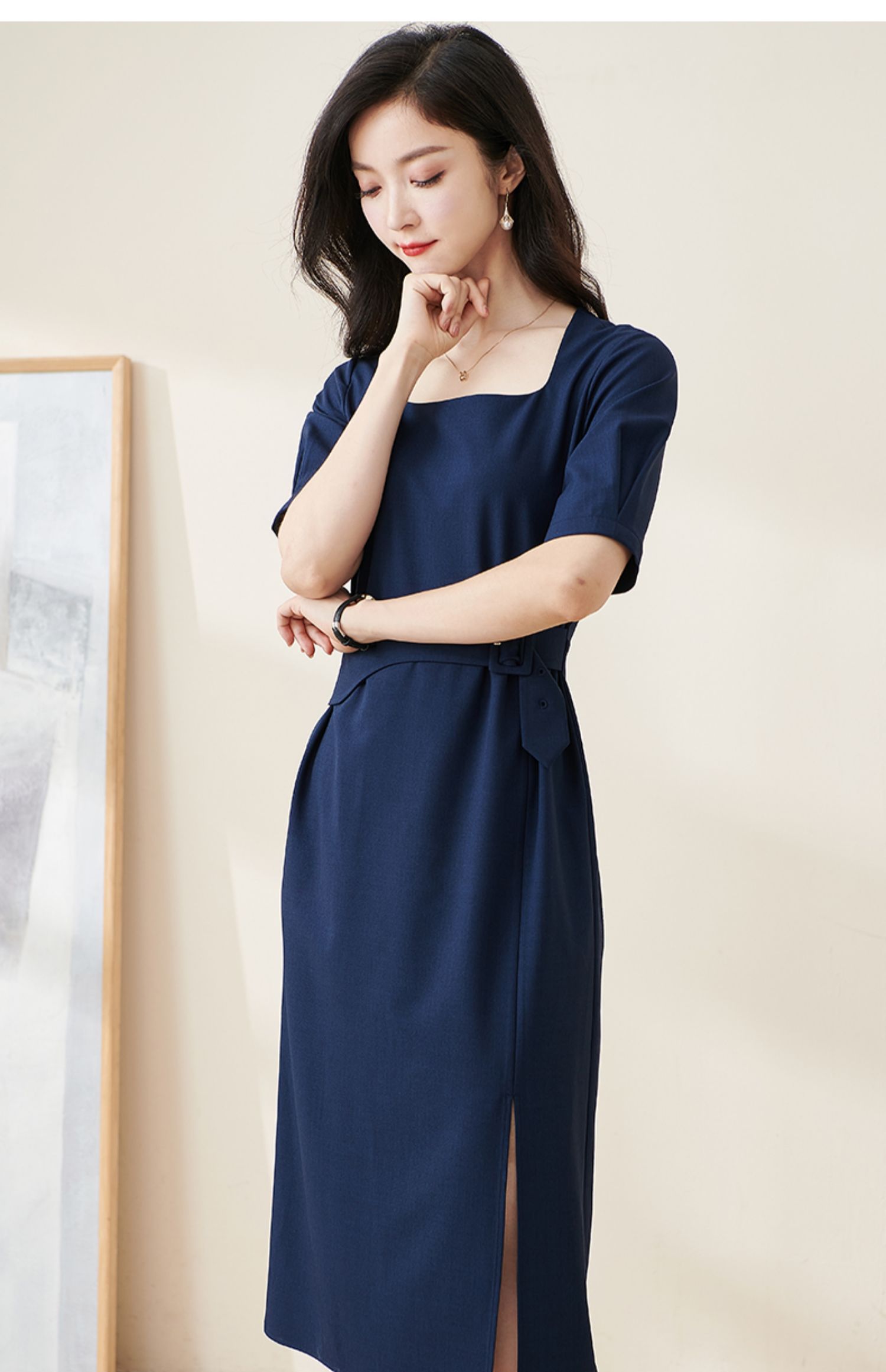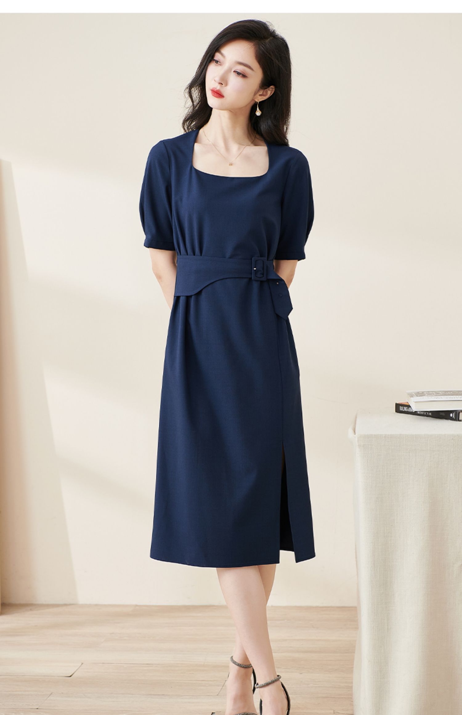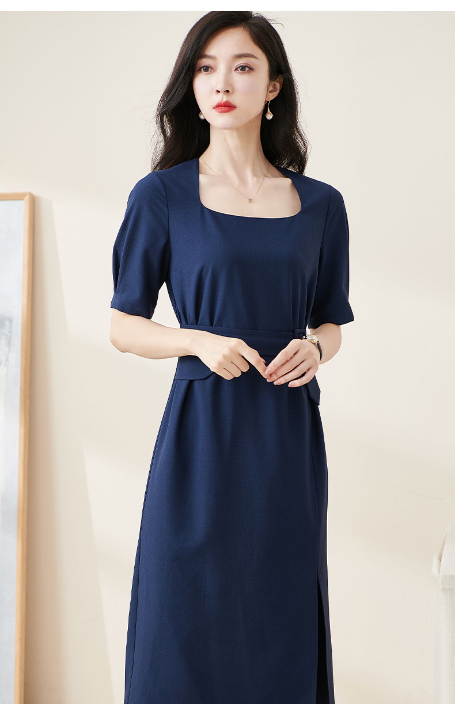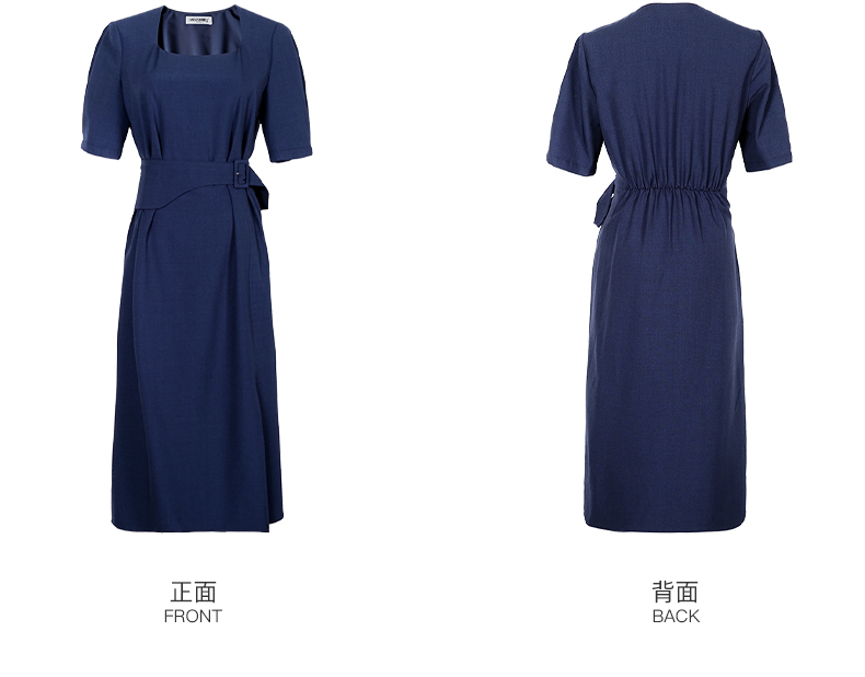 米思阳2024夏季新款气质复古方领五分袖连衣裙薄款收腰中长裙2064