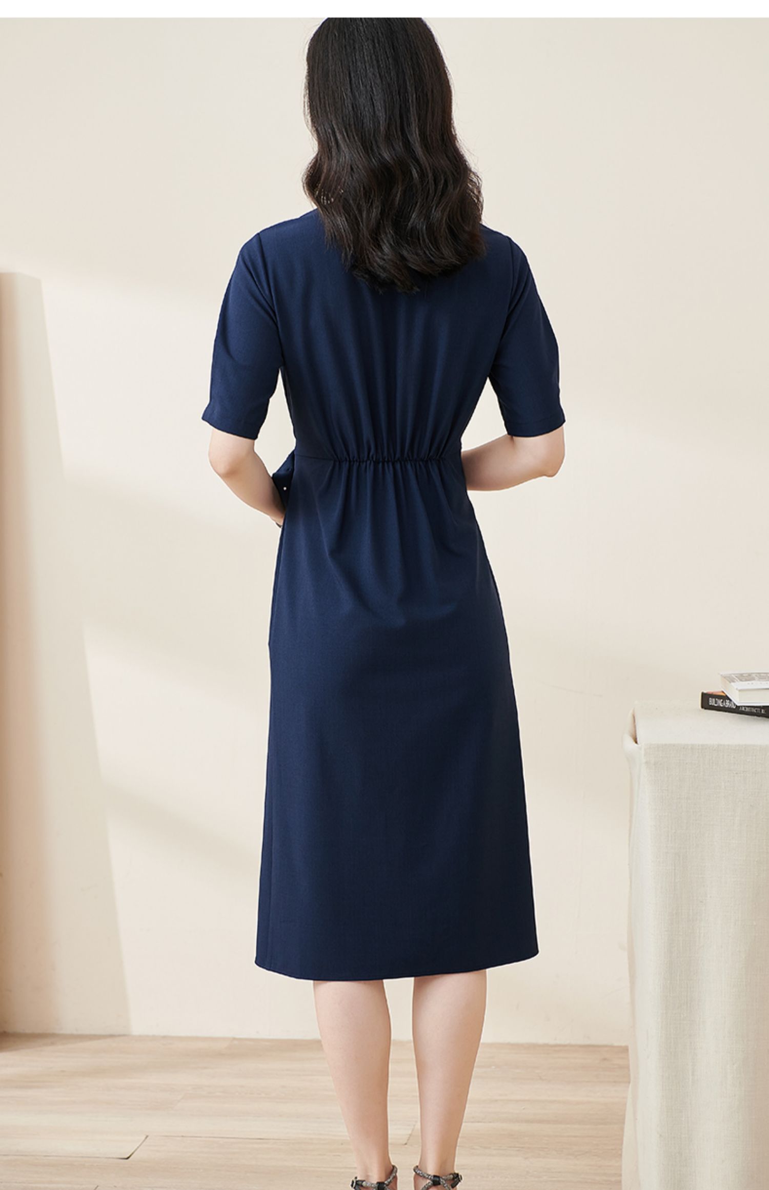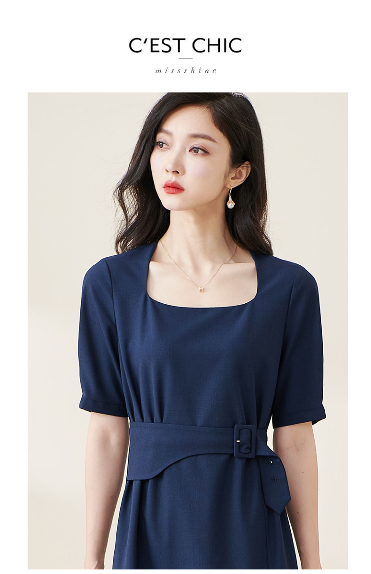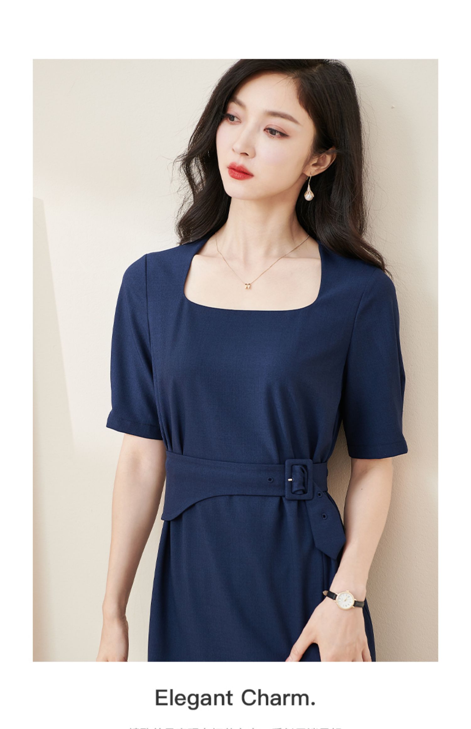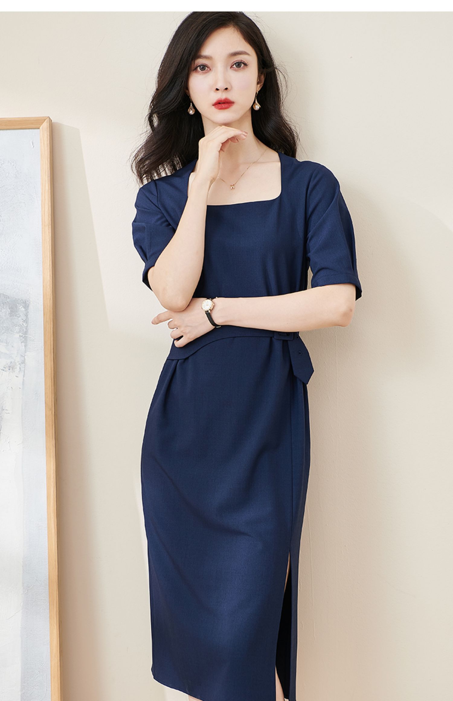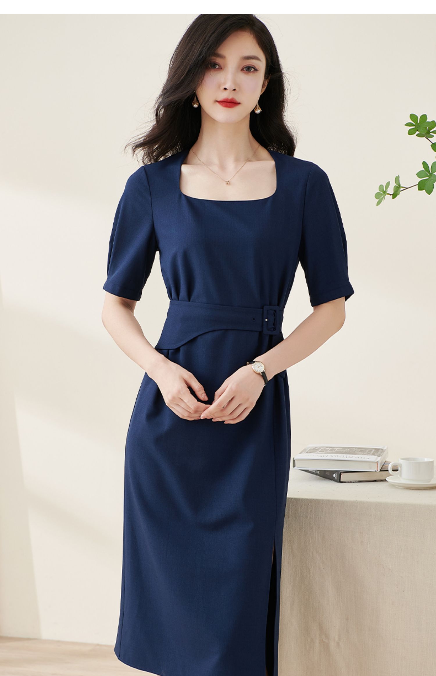 米思阳2024夏季新款气质复古方领五分袖连衣裙薄款收腰中长裙2064