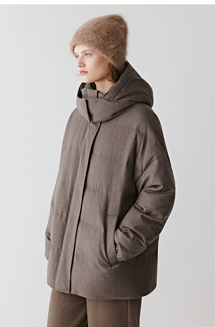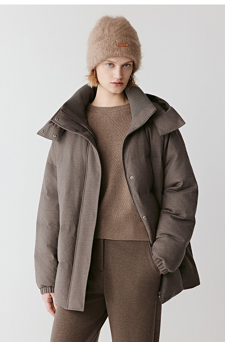 用饱满充绒撑起圆润轮廓,却以落肩剪裁化解厚重