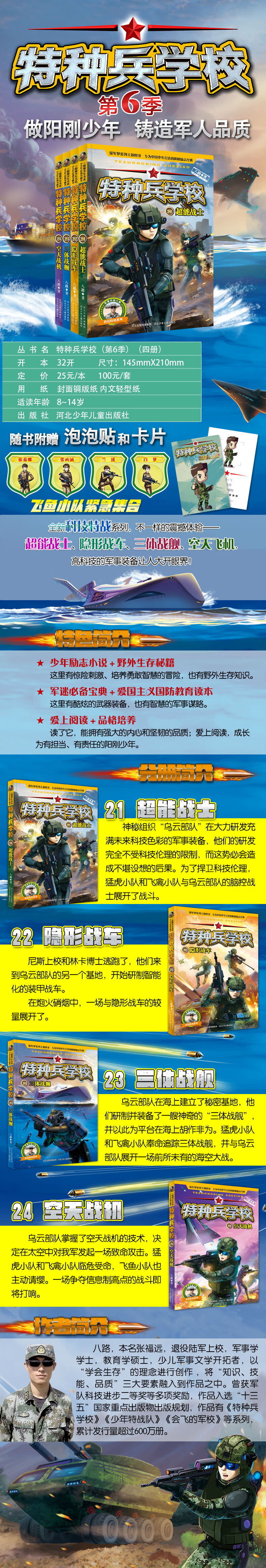 八路,本名张福远,退役军人,陆军上校,军事学学士,教育学硕士,少儿军事文学开拓者,以“学会生存”的理念进行创作 ,将“知识、技能、品质”三大要素融入到作品之中。曾获军队科技进步二等奖等多项奖励,作品入选“十三五”国家重点出版物出版规划,作品有《特种兵学校》《少年特战队》《会飞的军校》等系列,累计发行量超过700万册。