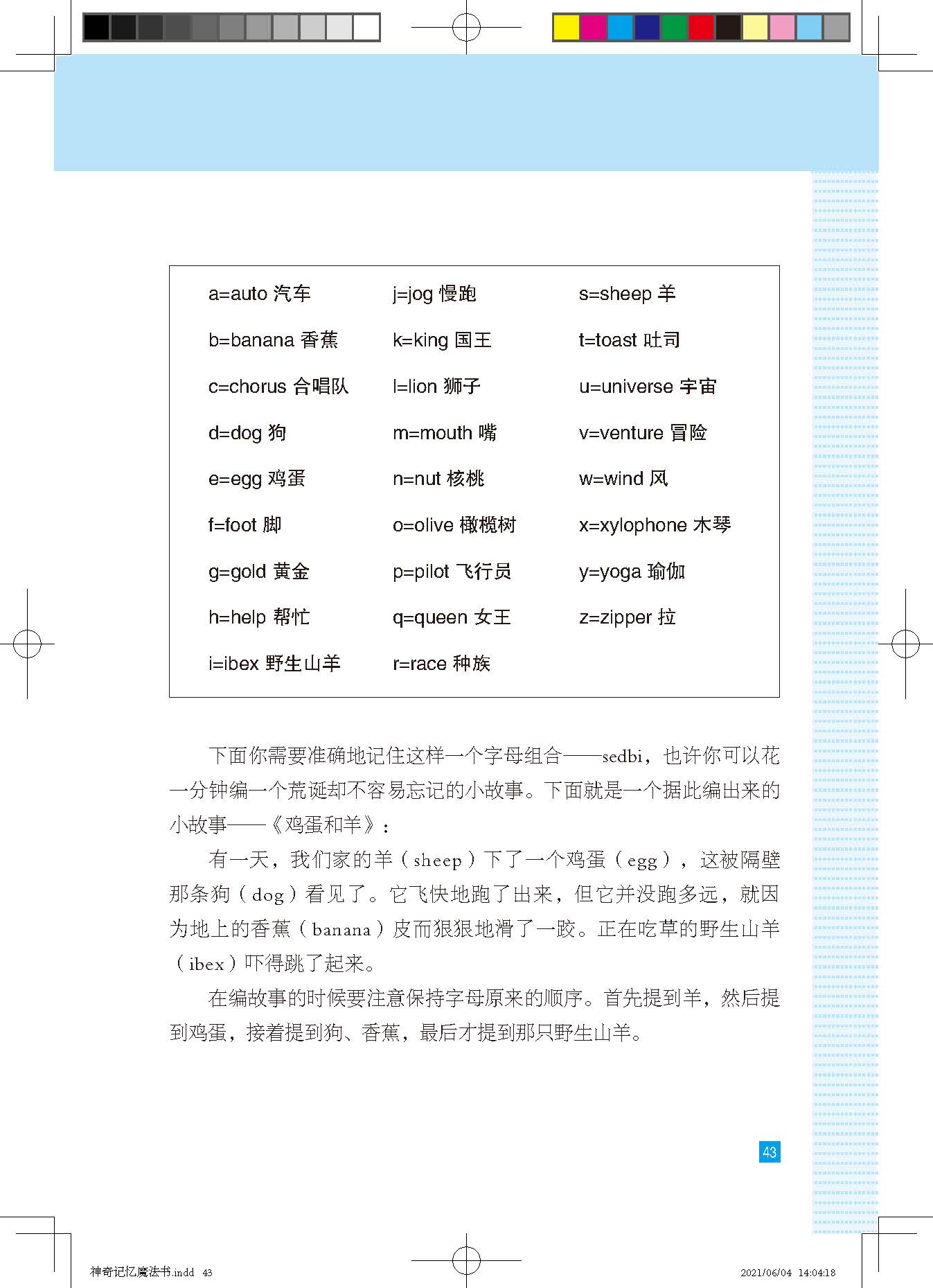 下面你需要准确地记住这样一个字母组合—sedbi,也许你可以花一分钟编一个荒诞却不容易忘记的小故事。下面就是一个据此编出来的小故事—《鸡蛋和羊》:
