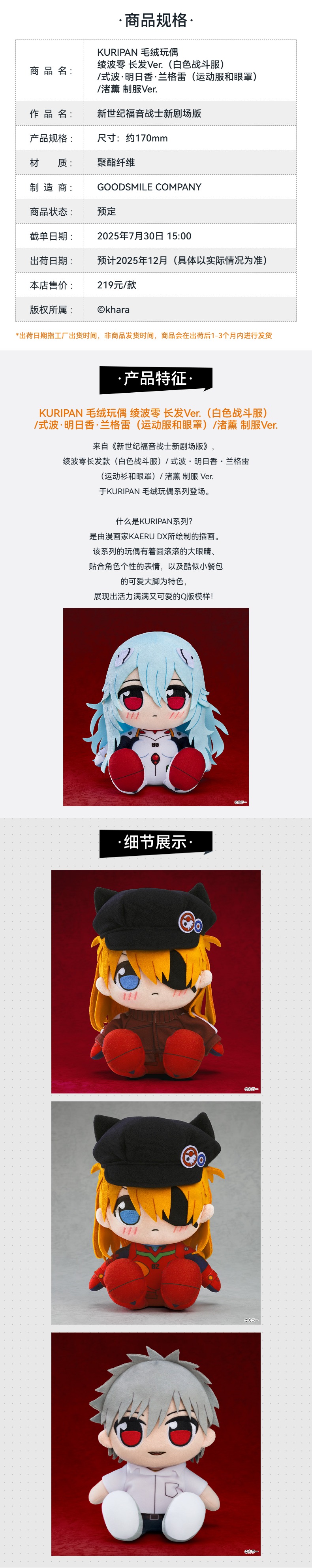 【GSC现货】KURIPAN 毛绒玩偶 绫波零 长发Ver.(白色战斗服)/式波·明日香·兰格雷(运动服和眼罩)/渚薰 制服Ver. 新世纪福音战士新剧场版