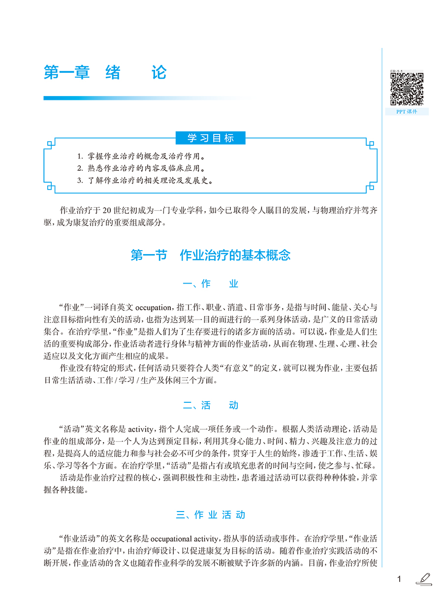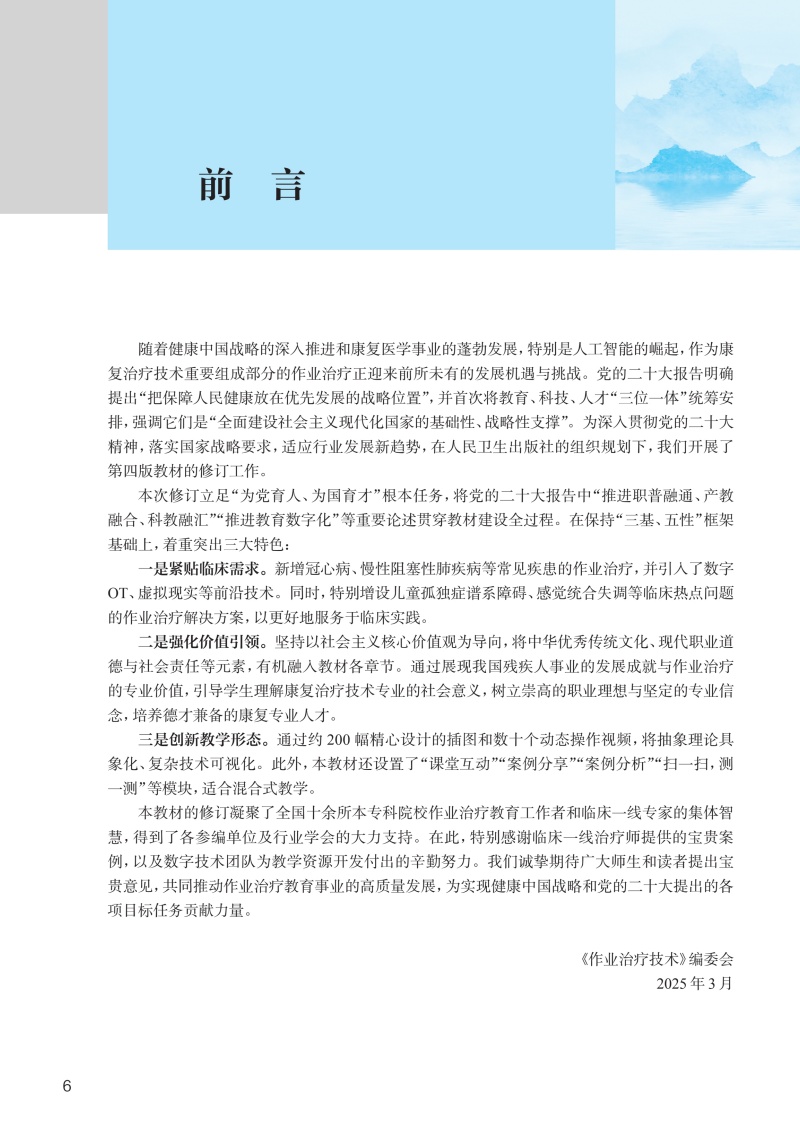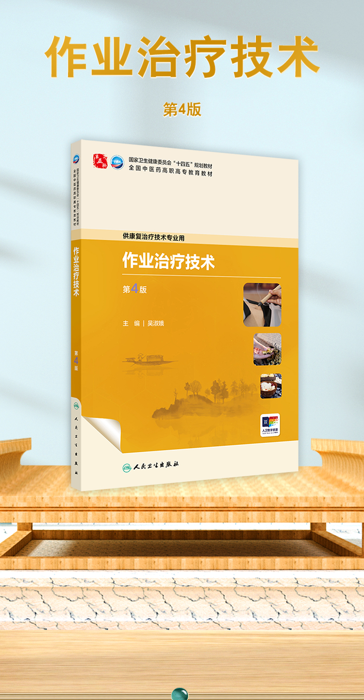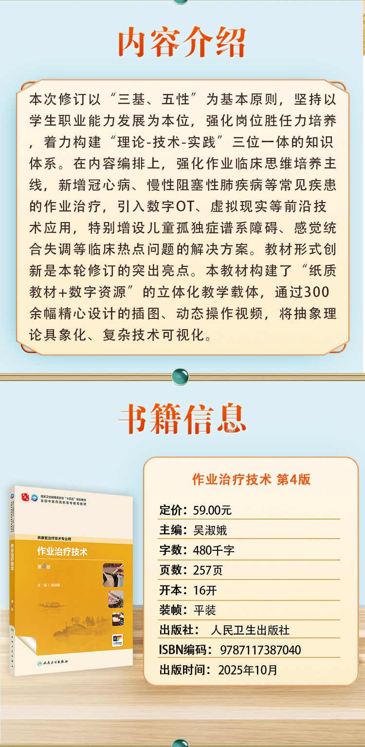 本次修订以“三基、五性”为基本原则,坚持以学生职业能力发展为本位,强化岗位胜任力培养,着力构建“理论-技术-实践”三位一体的知识体系。在内容编排上,强化作业临床思维培养主线,新增冠心病、慢性阻塞性肺疾病等常见疾患的作业治疗,引入数字OT、虚拟现实等前沿技术应用,特别增设儿童孤独症谱系障碍、感觉统合失调等临床热点问题的解决方案。教材形式创新是本轮修订的突出亮点。本教材构建了“纸质教材+数字资源”的立体化教学载体,通过300余幅精心设计的插图、动态操作视频,将抽象理论具象化、复杂技术可视化。