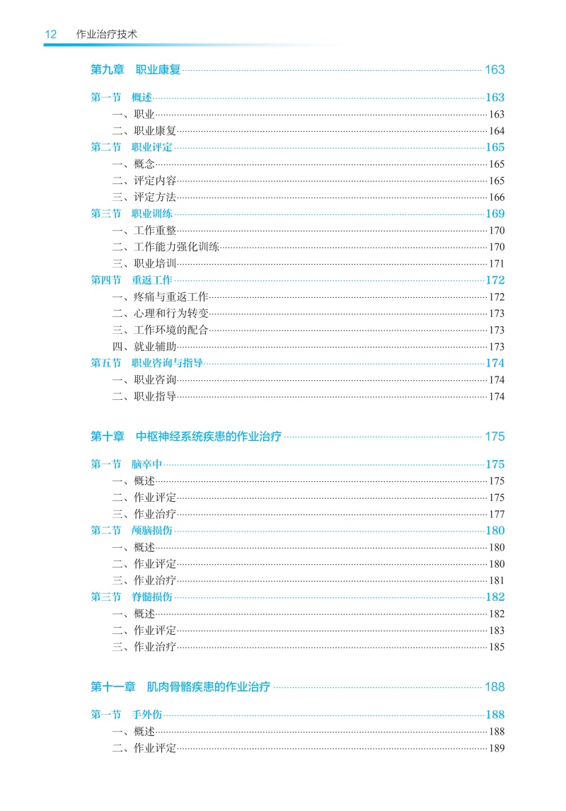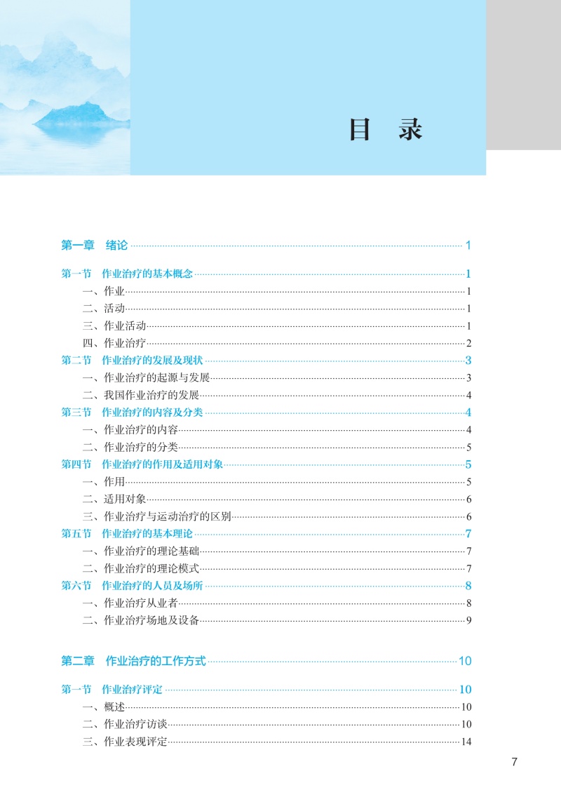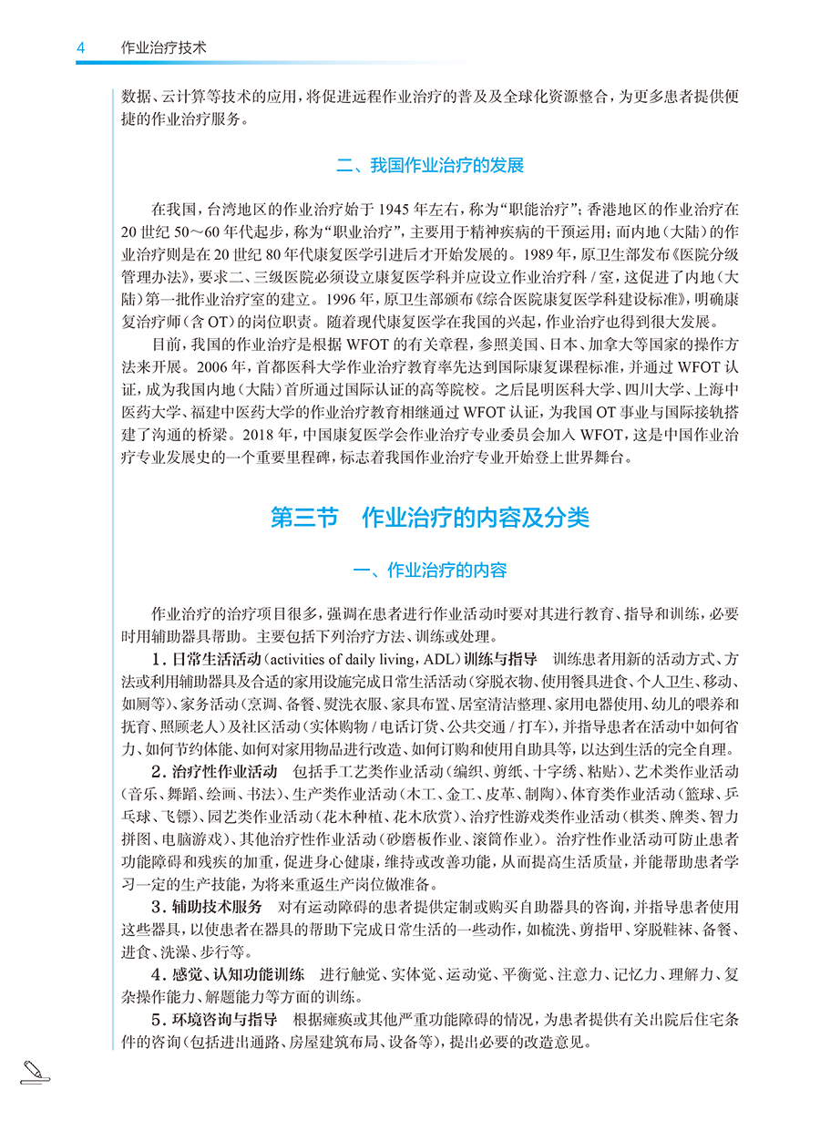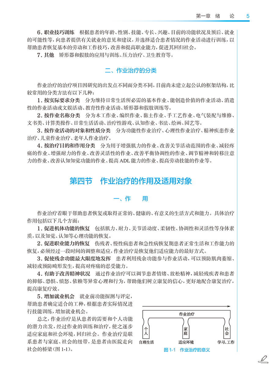 本次修订以“三基、五性”为基本原则,坚持以学生职业能力发展为本位,强化岗位胜任力培养,着力构建“理论-技术-实践”三位一体的知识体系。在内容编排上,强化作业临床思维培养主线,新增冠心病、慢性阻塞性肺疾病等常见疾患的作业治疗,引入数字OT、虚拟现实等前沿技术应用,特别增设儿童孤独症谱系障碍、感觉统合失调等临床热点问题的解决方案。教材形式创新是本轮修订的突出亮点。本教材构建了“纸质教材+数字资源”的立体化教学载体,通过300余幅精心设计的插图、动态操作视频,将抽象理论具象化、复杂技术可视化。