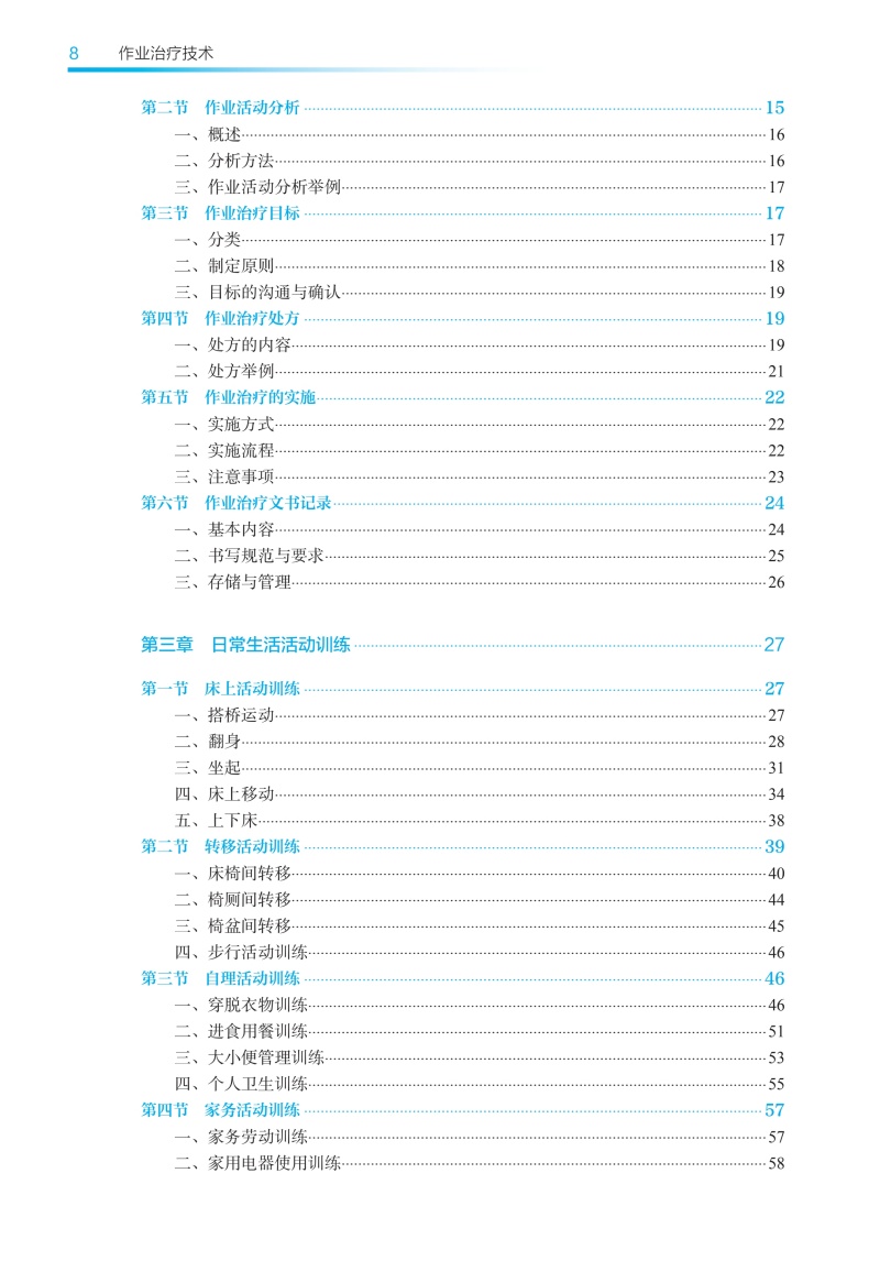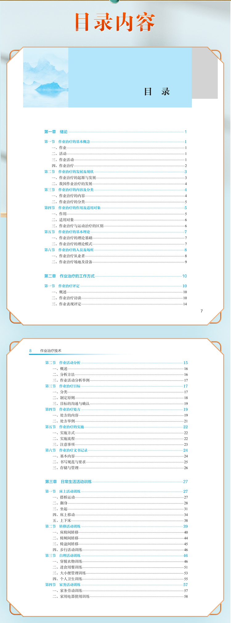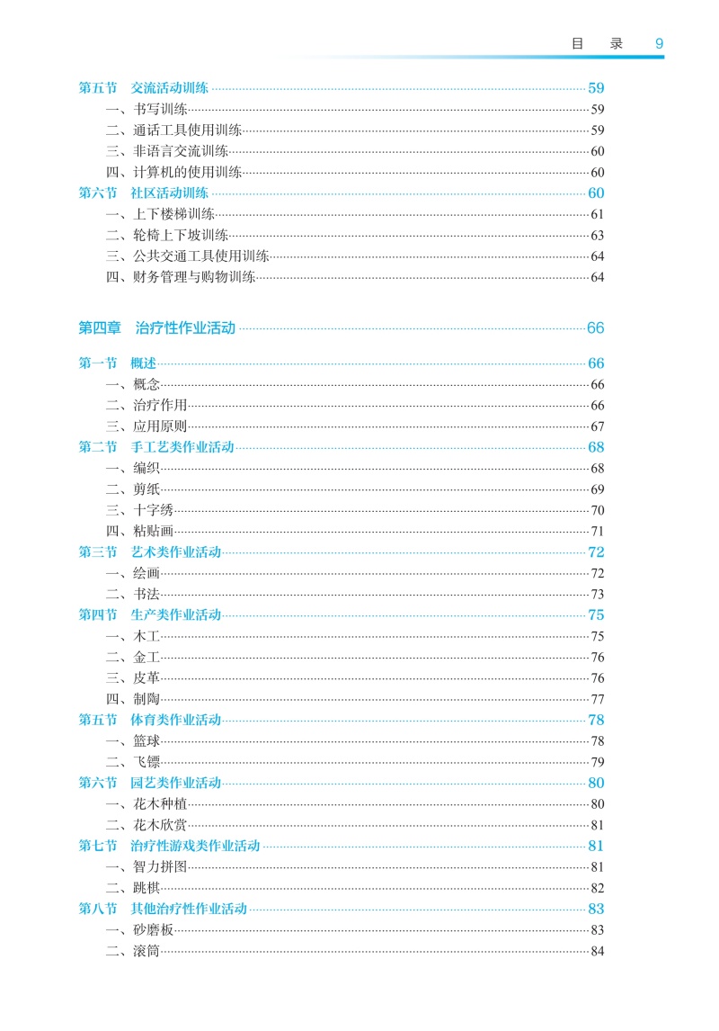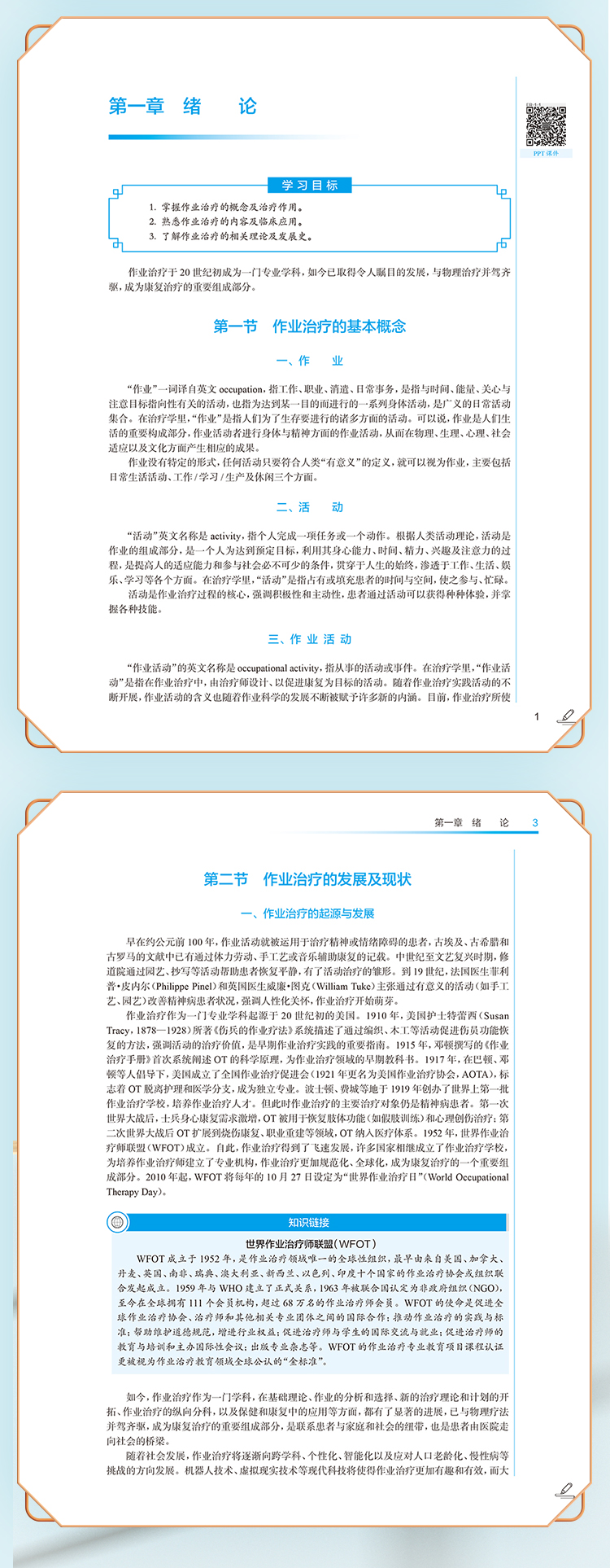 本次修订以“三基、五性”为基本原则,坚持以学生职业能力发展为本位,强化岗位胜任力培养,着力构建“理论-技术-实践”三位一体的知识体系。在内容编排上,强化作业临床思维培养主线,新增冠心病、慢性阻塞性肺疾病等常见疾患的作业治疗,引入数字OT、虚拟现实等前沿技术应用,特别增设儿童孤独症谱系障碍、感觉统合失调等临床热点问题的解决方案。教材形式创新是本轮修订的突出亮点。本教材构建了“纸质教材+数字资源”的立体化教学载体,通过300余幅精心设计的插图、动态操作视频,将抽象理论具象化、复杂技术可视化。