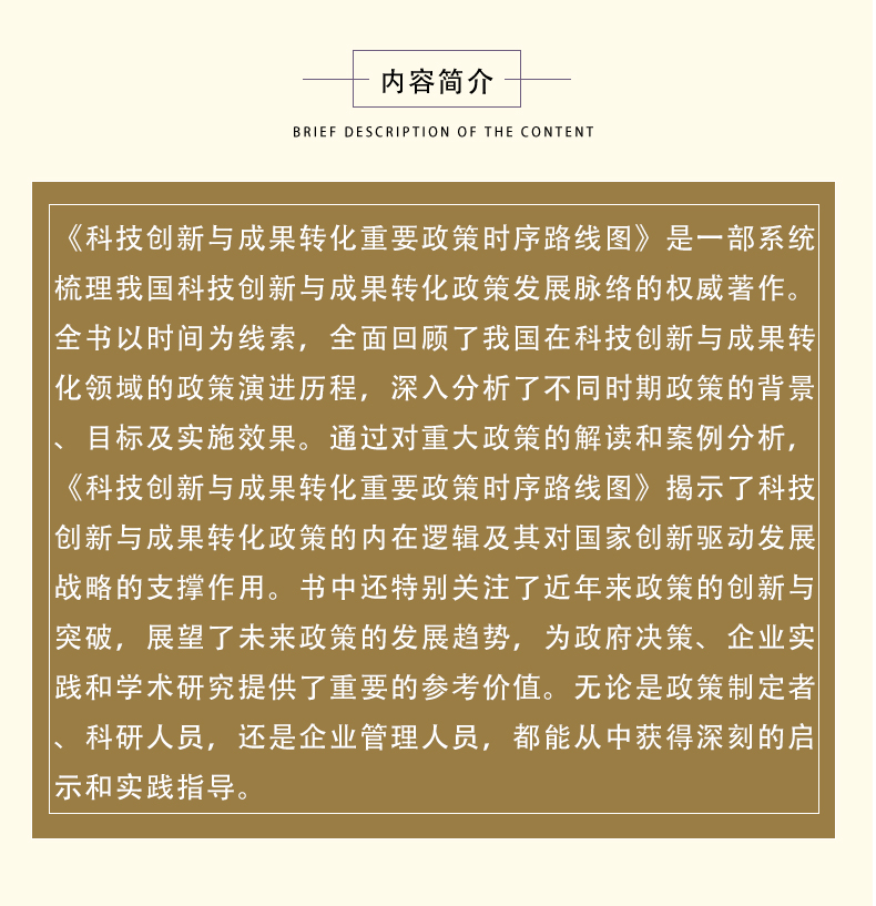 《科技创新与成果转化重要政策时序路线图》是一部系统梳理我国科技创新与成果转化政策发展脉络的权威著作。全书以时间为线索,全面回顾了我国在科技创新与成果转化领域的政策演进历程,深入分析了不同时期政策的背景、目标及实施效果。通过对重大政策的解读和案例分析,《科技创新与成果转化重要政策时序路线图》揭示了科技创新与成果转化政策的内在逻辑及其对国家创新驱动发展战略的支撑作用。书中还特别关注了近年来政策的创新与突破,展望了未来政策的发展趋势,为政府决策、企业实践和学术研究提供了重要的参考价值。无论是政策制定者、科研人员,还是企业管理人员,都能从中获得深刻的启示和实践指导。