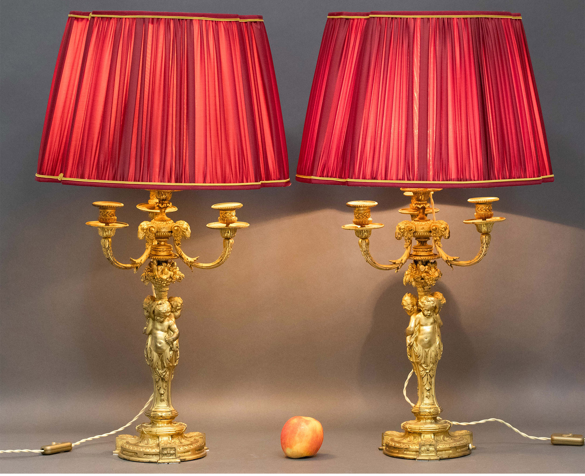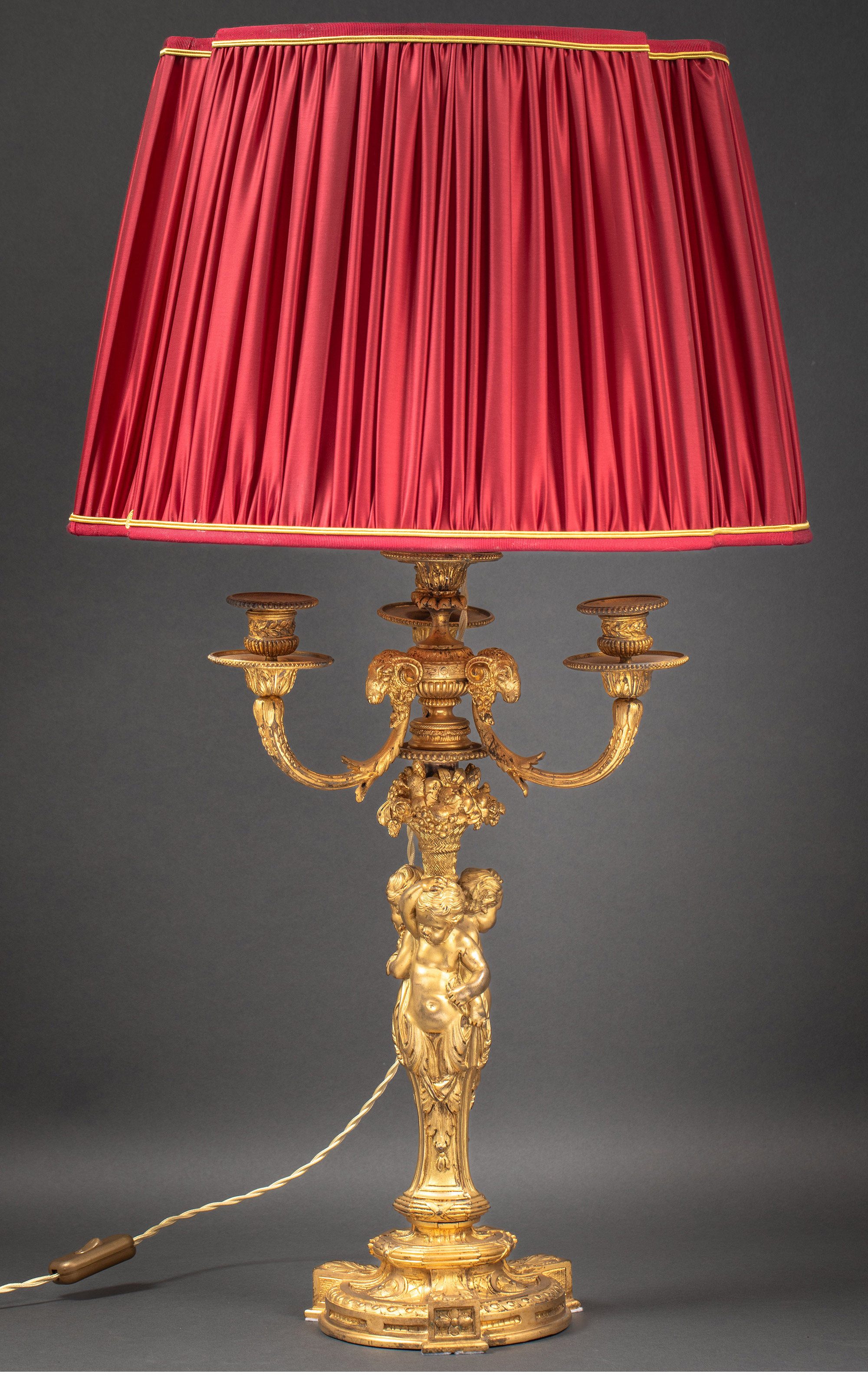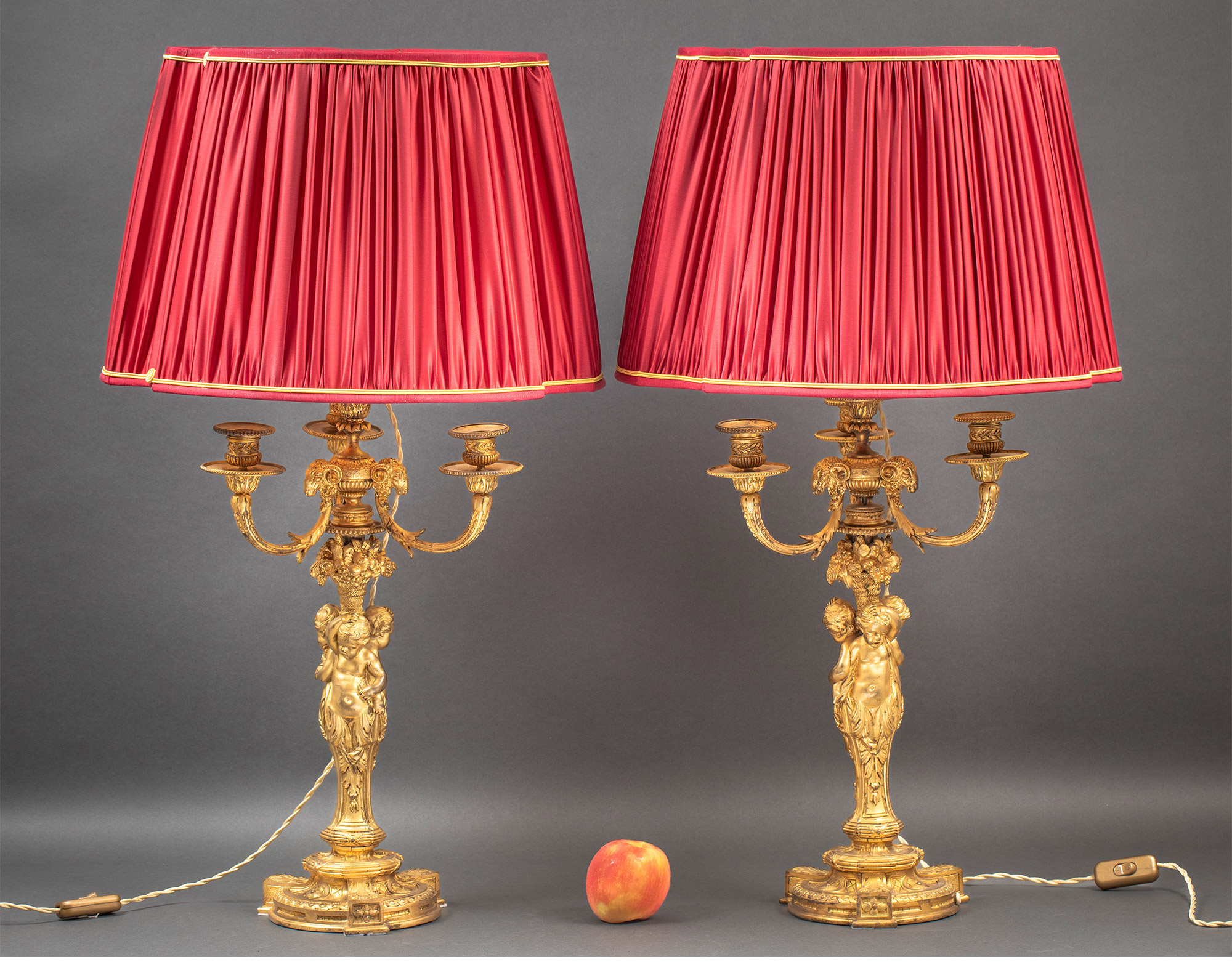 19世纪法国出品路易十六风格小天使主题铜鎏金精雕丝绸缎面百褶灯罩台灯一对