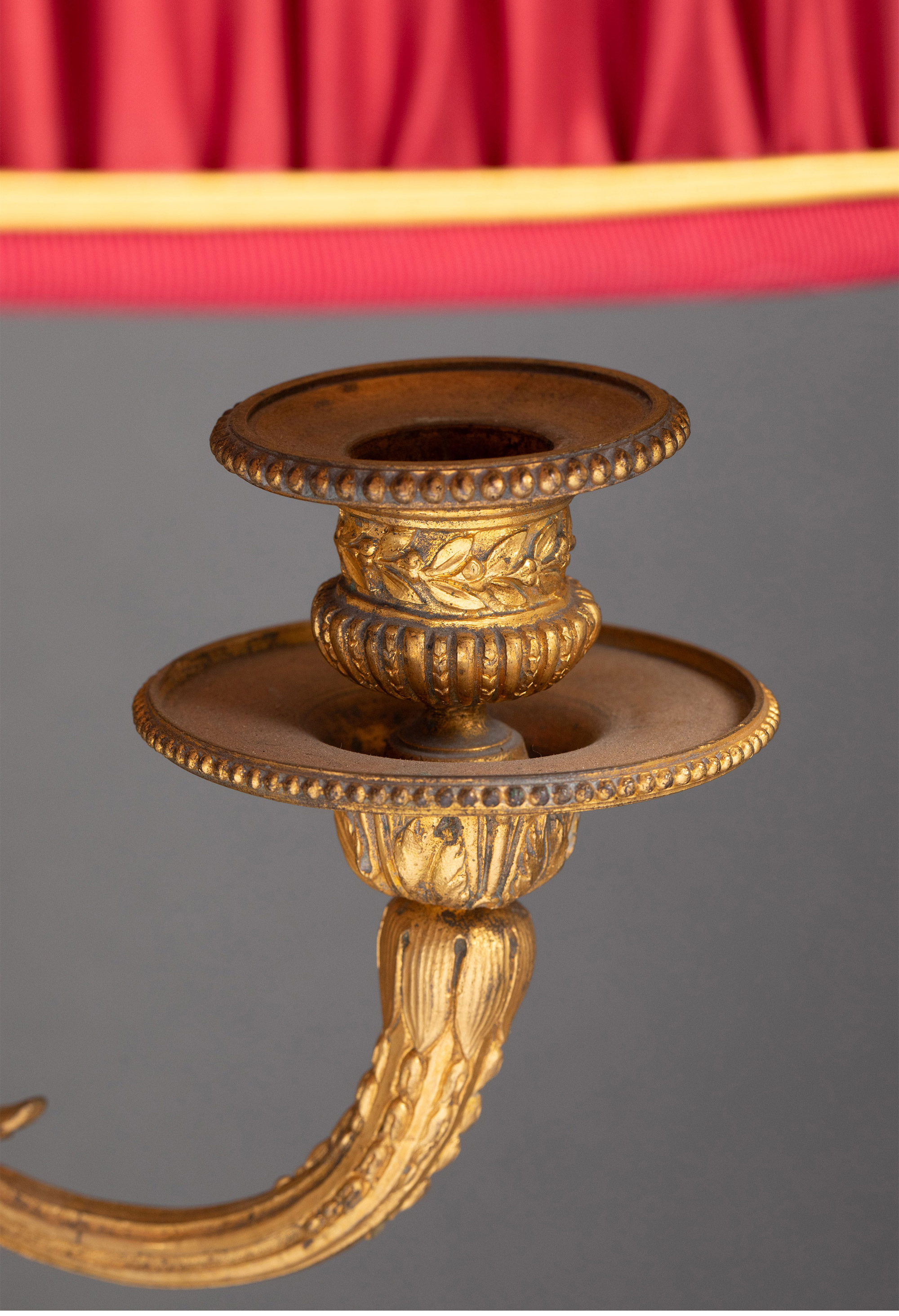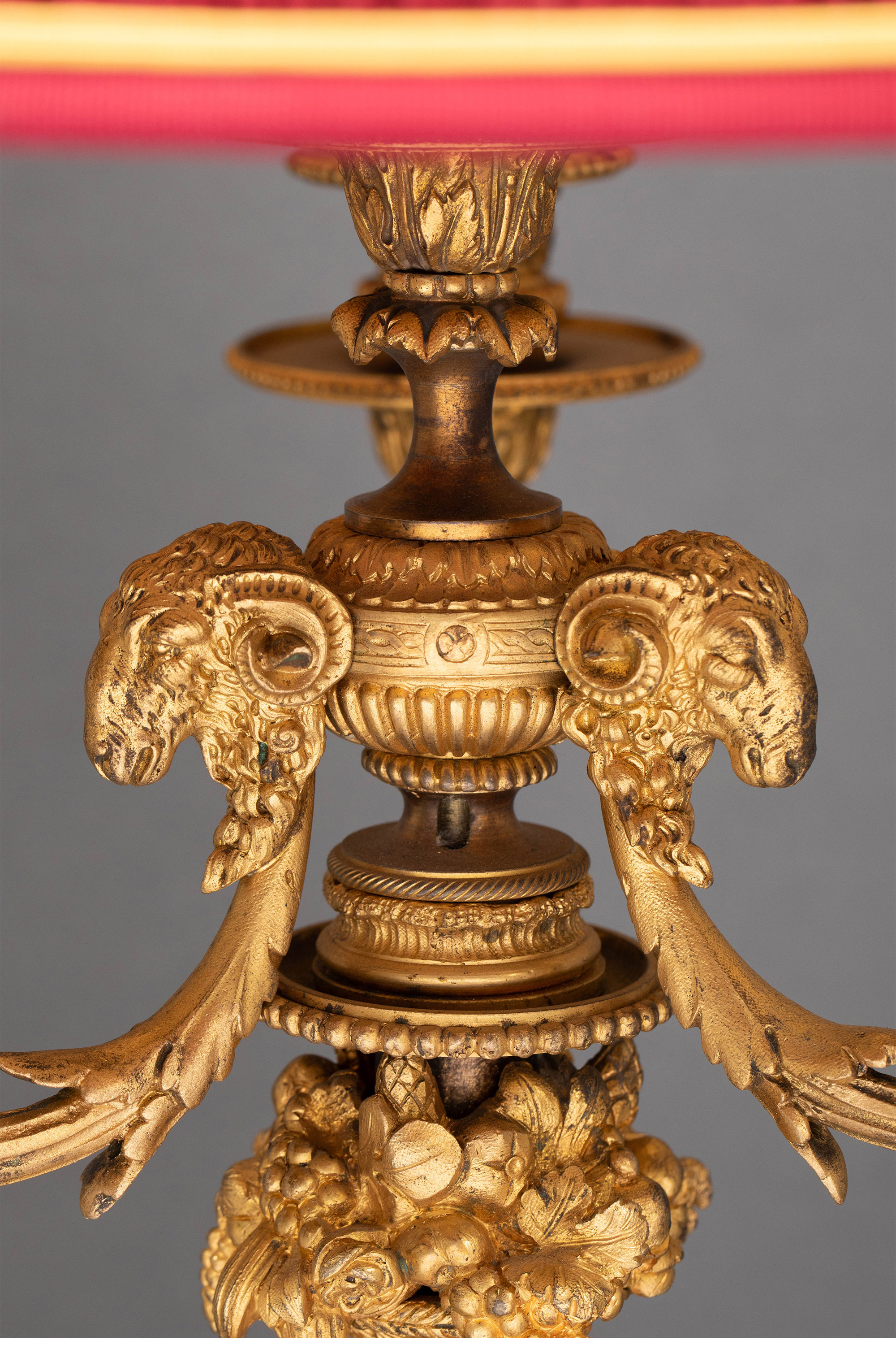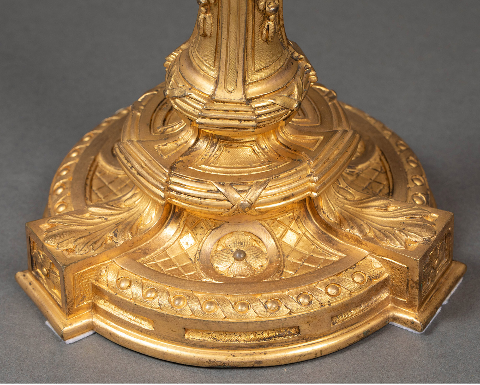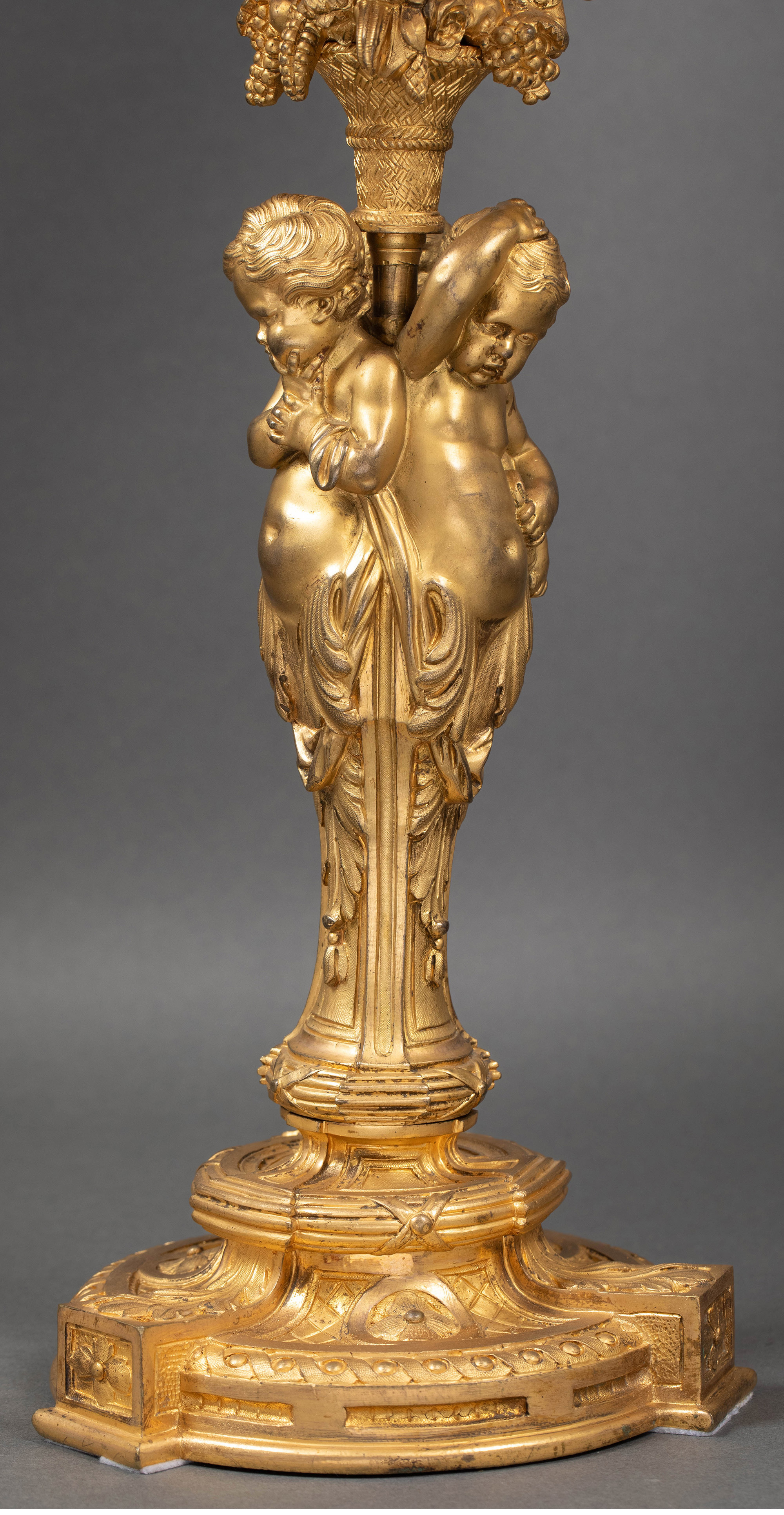 19世纪法国出品路易十六风格小天使主题铜鎏金精雕丝绸缎面百褶灯罩台灯一对