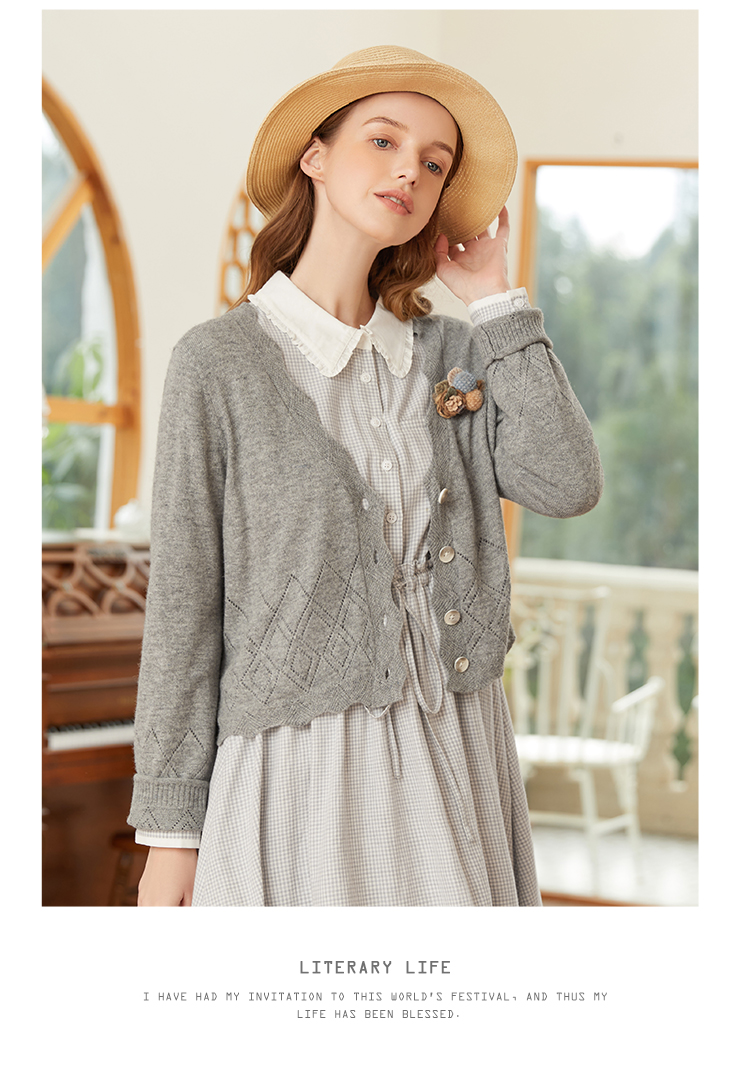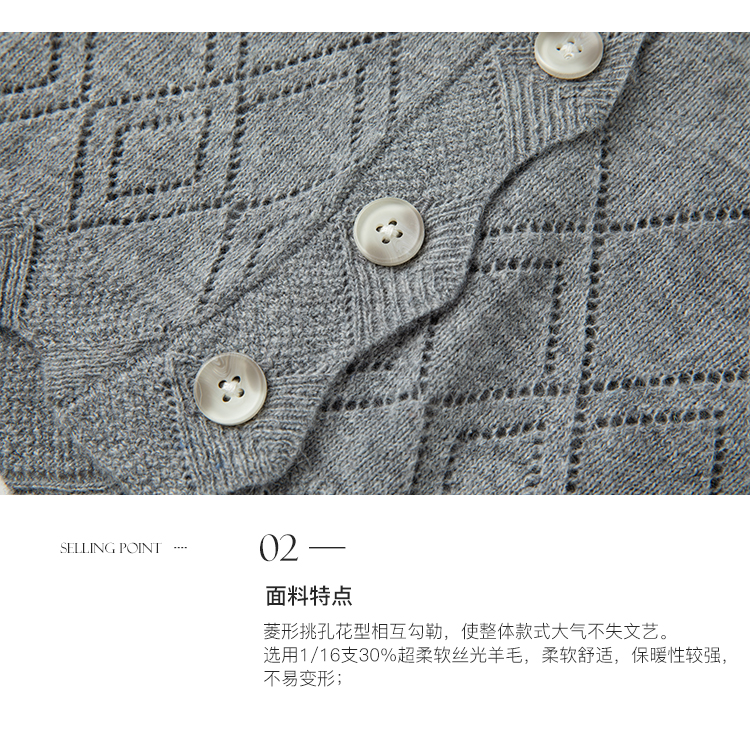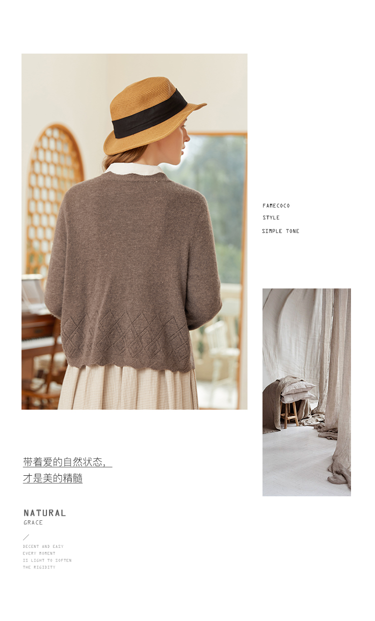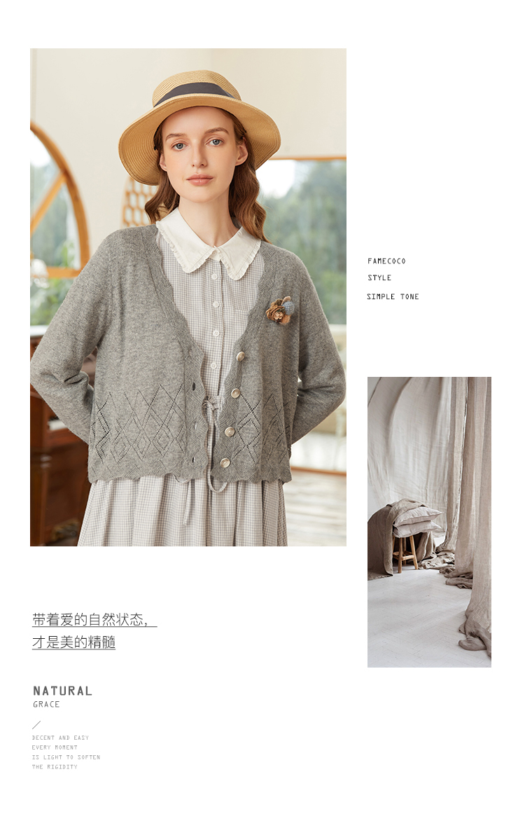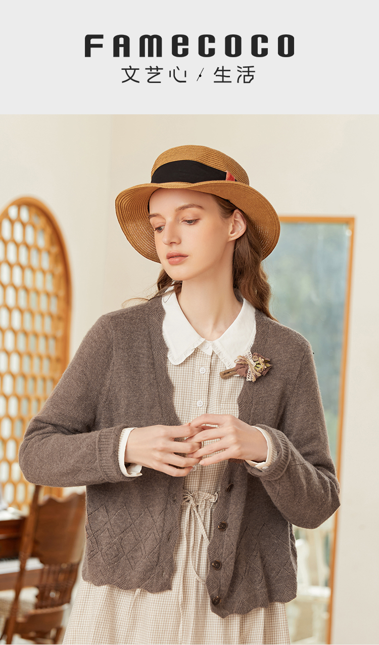 Famecoco范可儿V领针织开衫外套女春秋款短款镂空羊毛衫