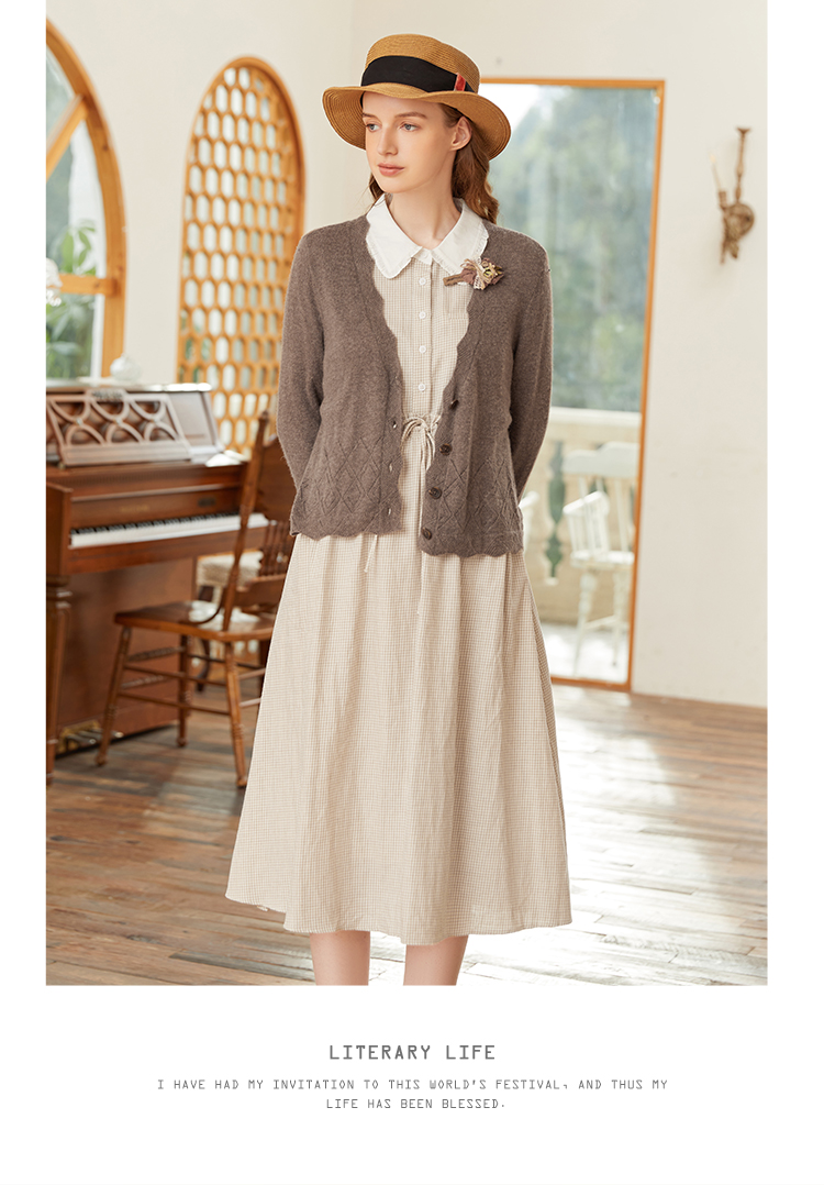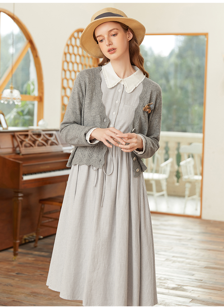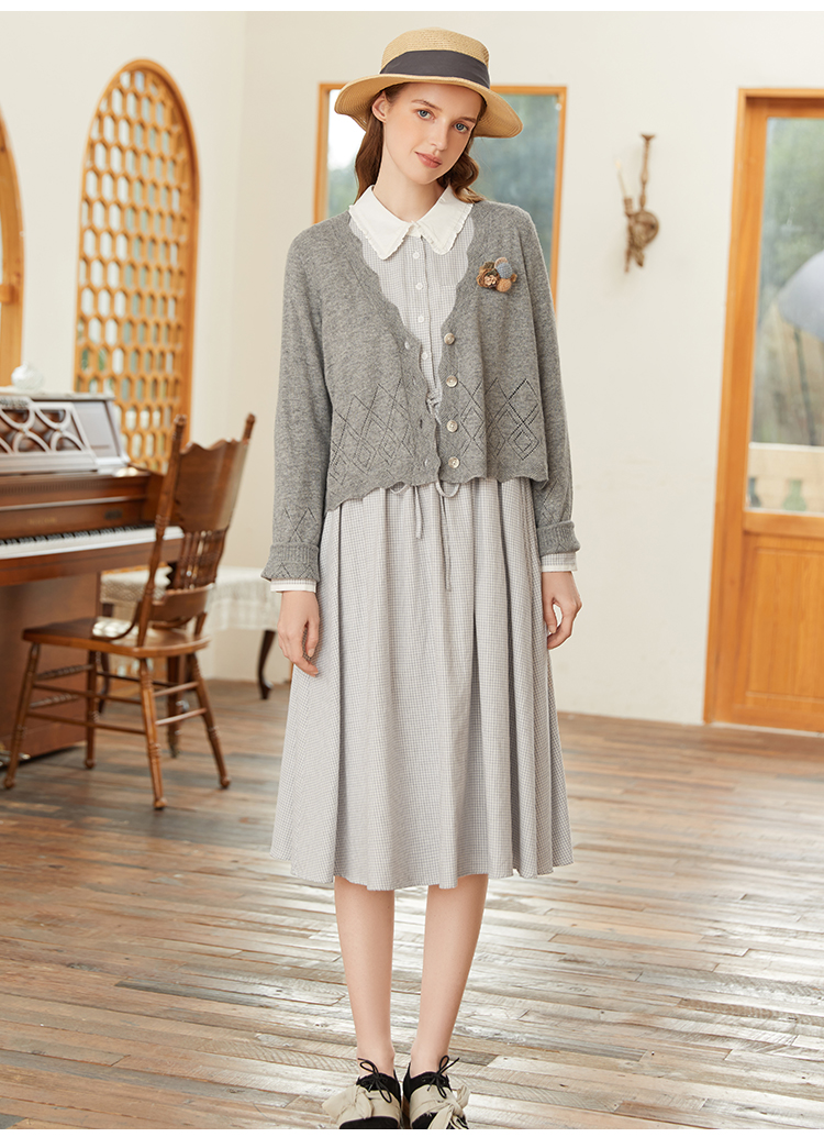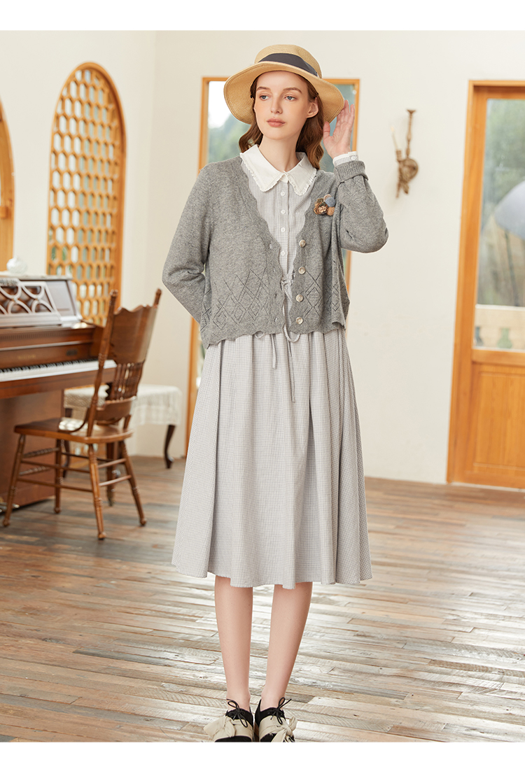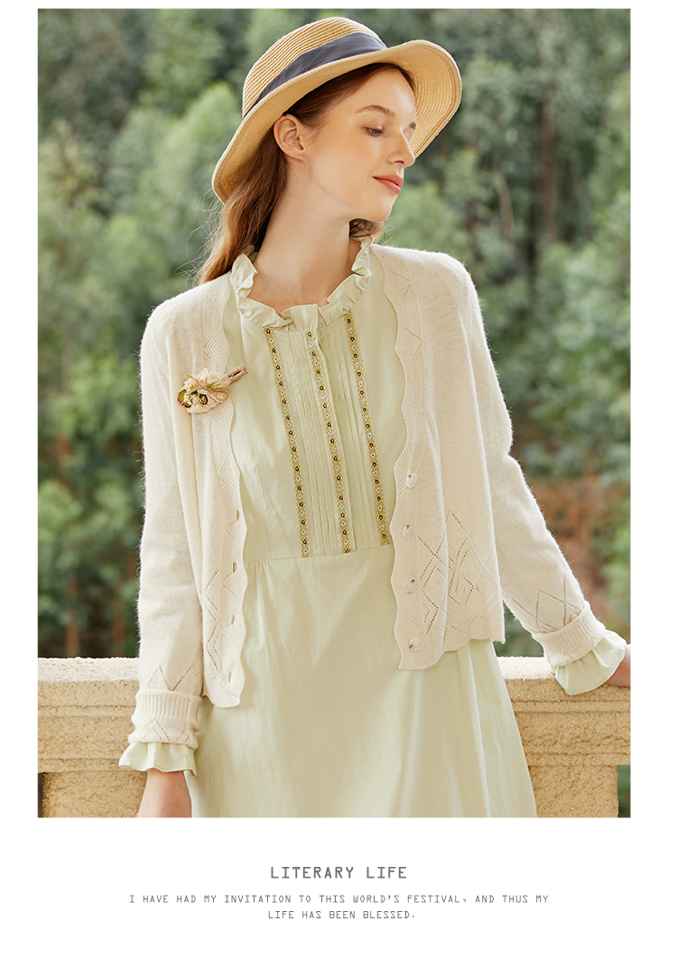 Famecoco范可儿V领针织开衫外套女春秋款短款镂空羊毛衫