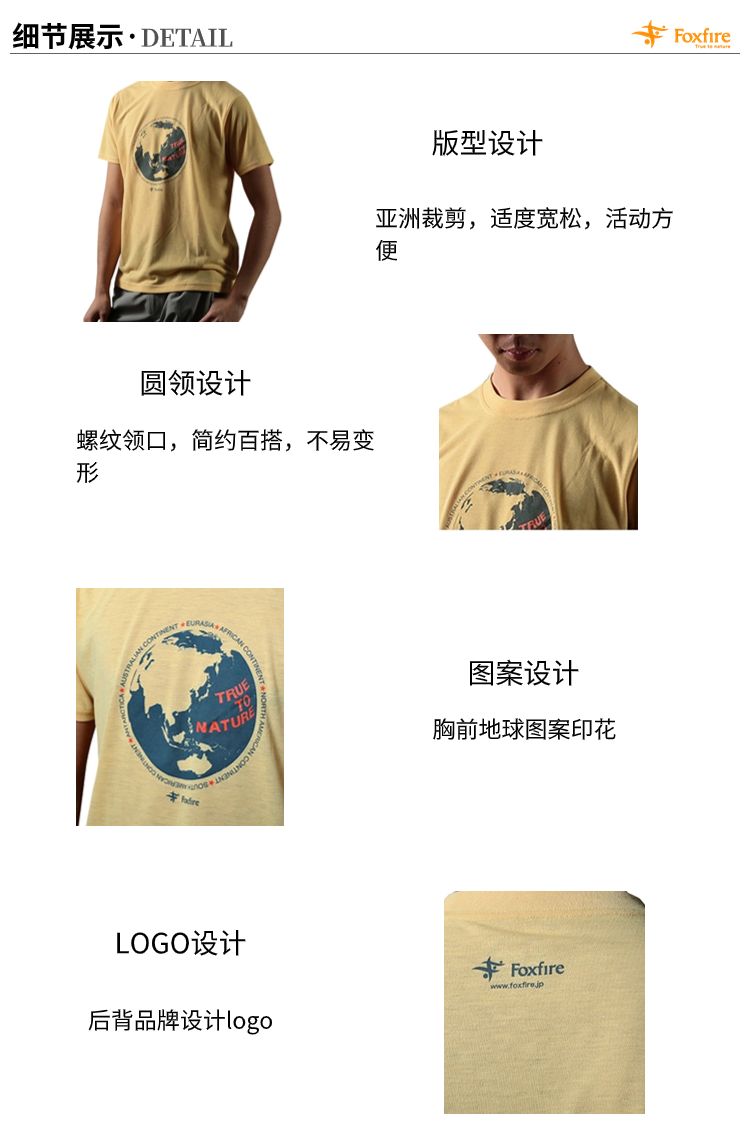 Foxfire夏季户外休闲运动男女T恤时尚百搭舒适上衣