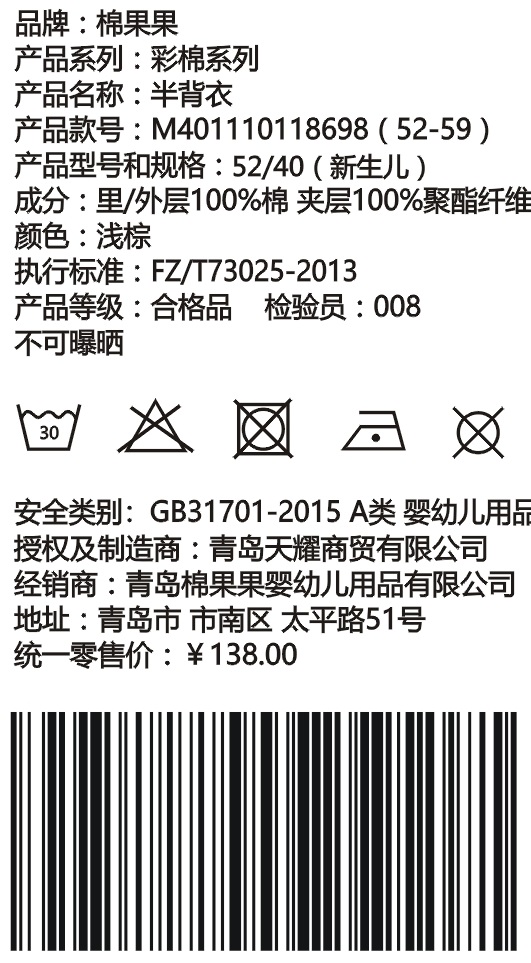 棉果果冬季新疆彩棉男童女童铺棉半背衣M401110118698