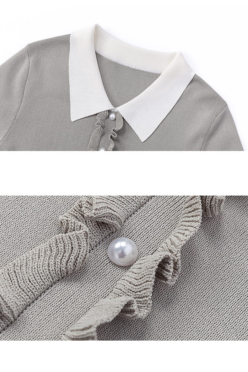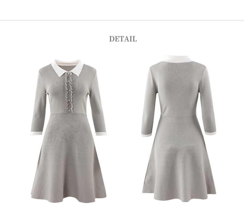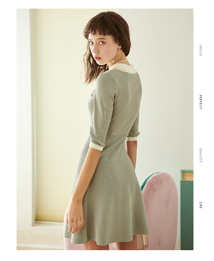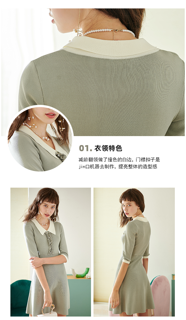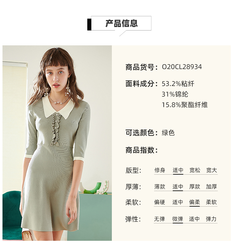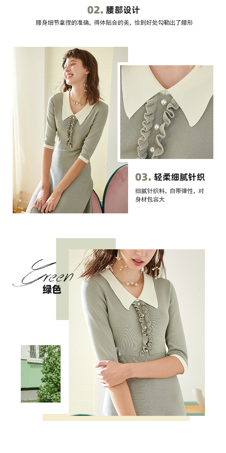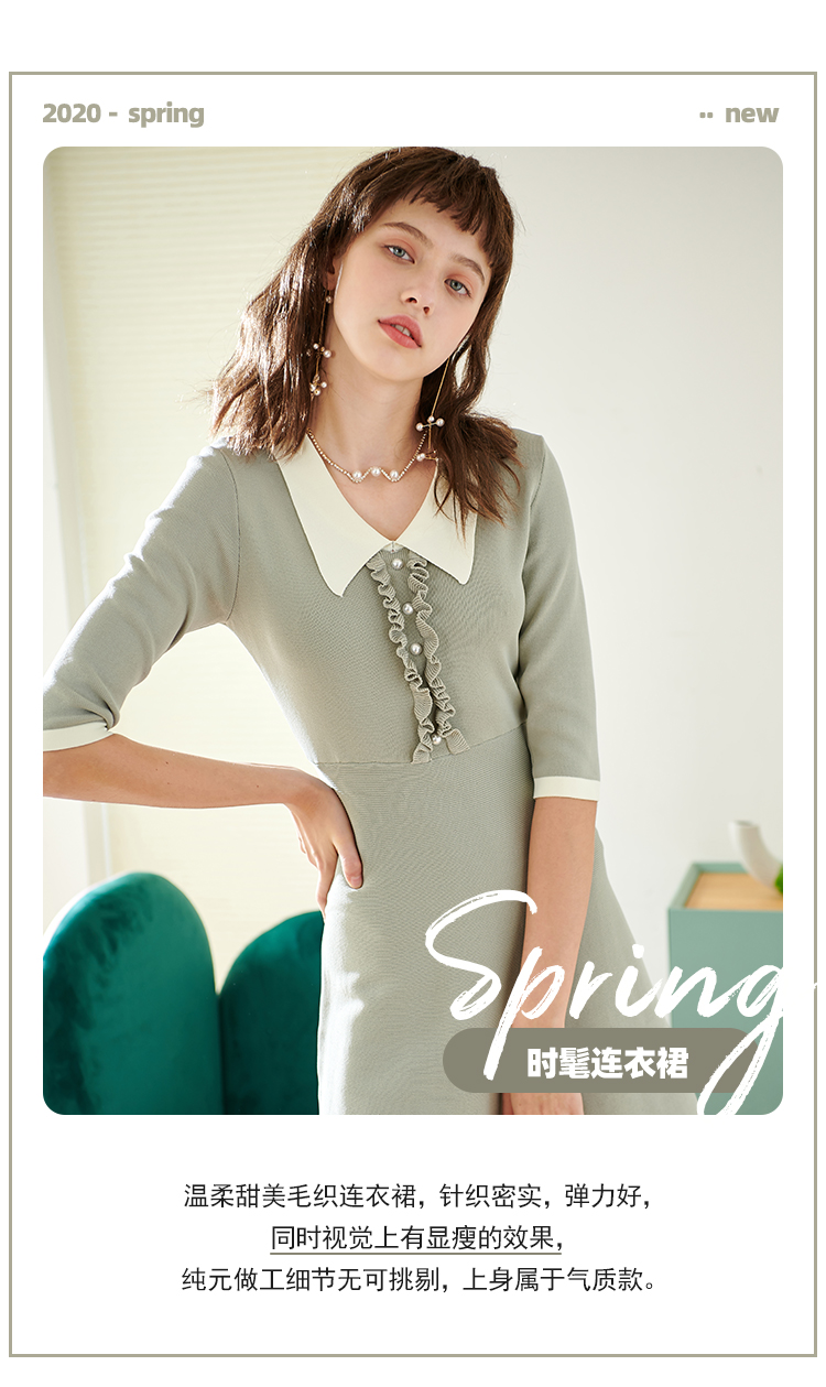欧芮儿春新款五分袖V领针织连衣裙女中长款木耳边收腰A字裙
