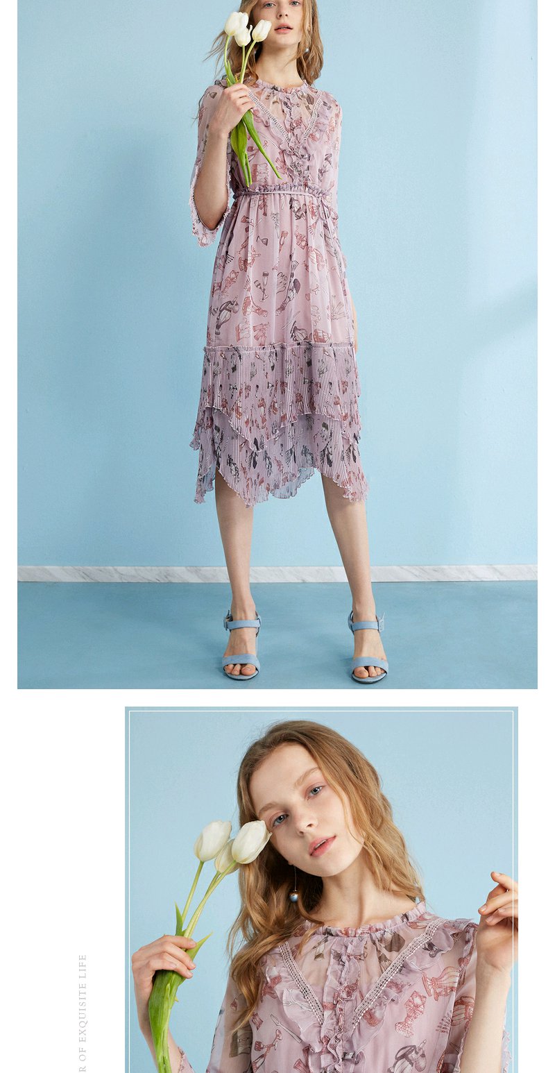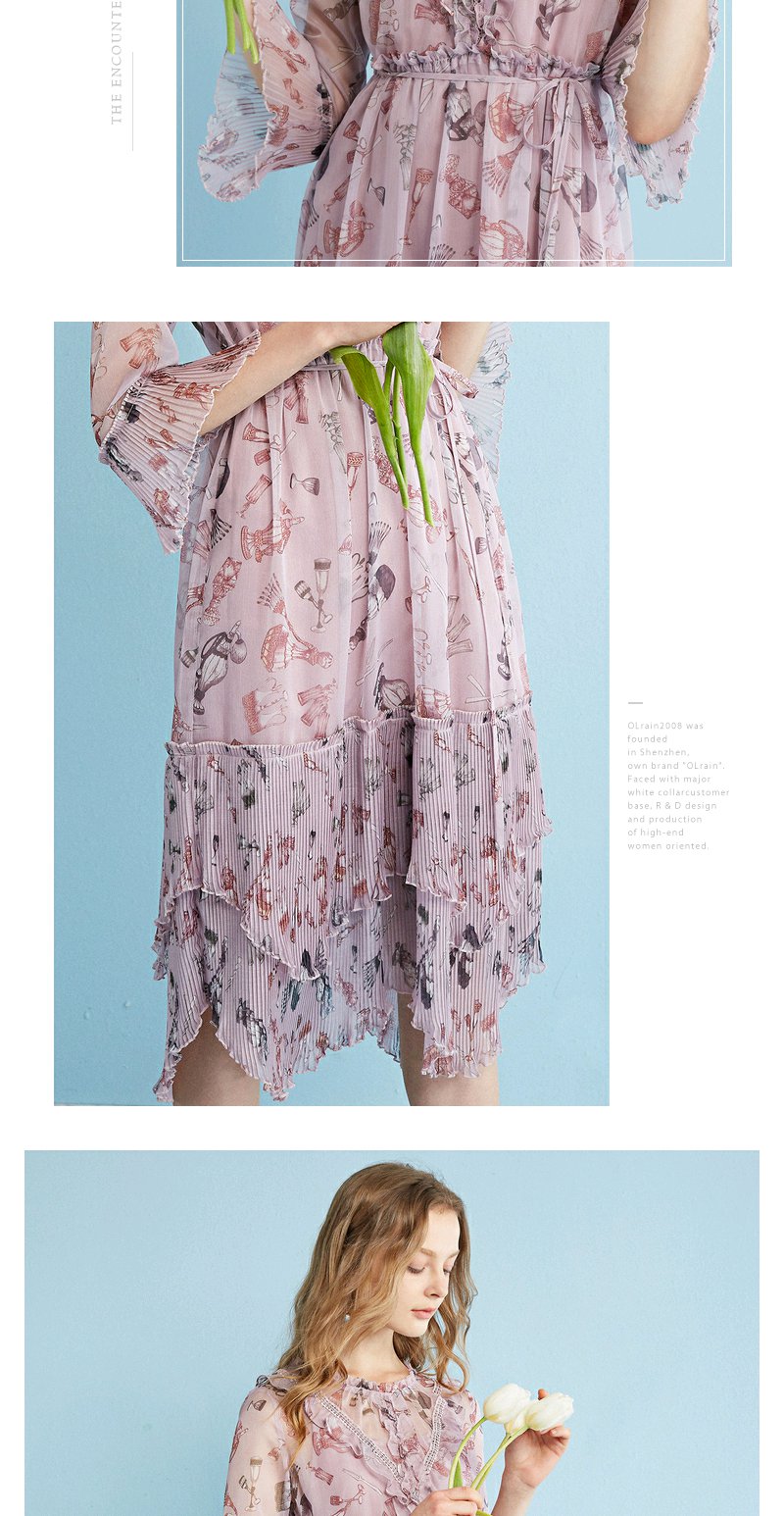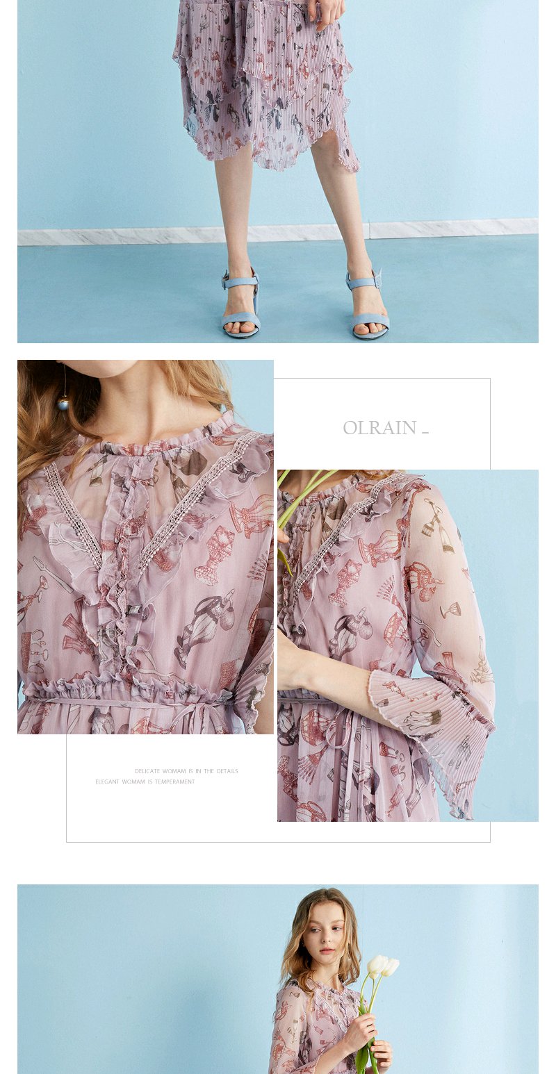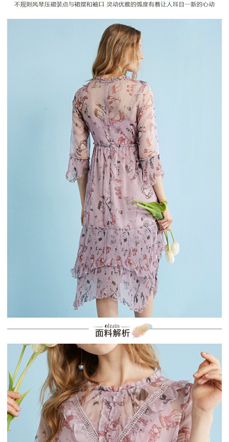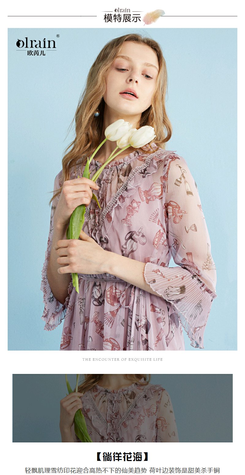欧芮儿 风琴百褶收腰印花荷叶边雪纺连衣裙女中袖裙子
