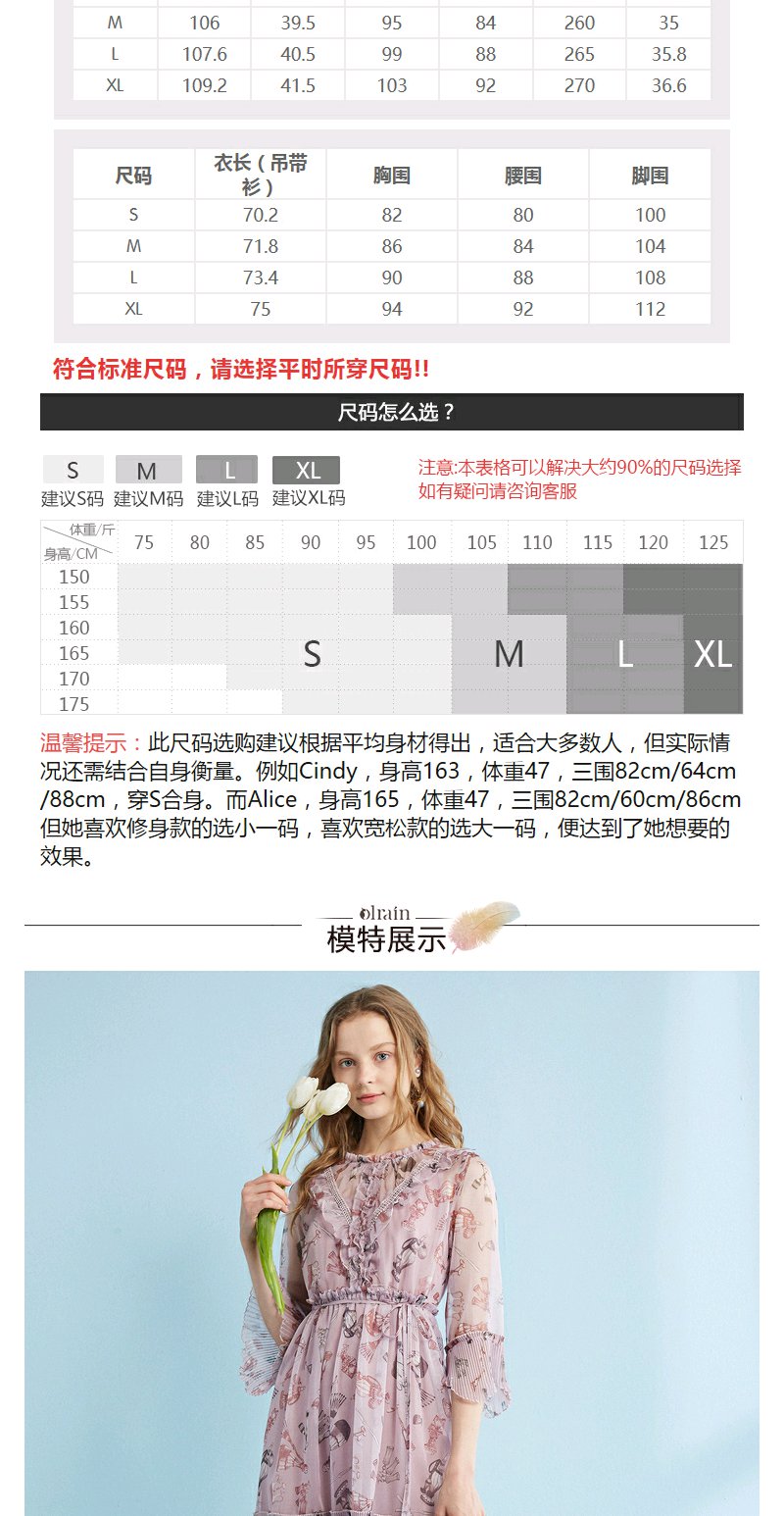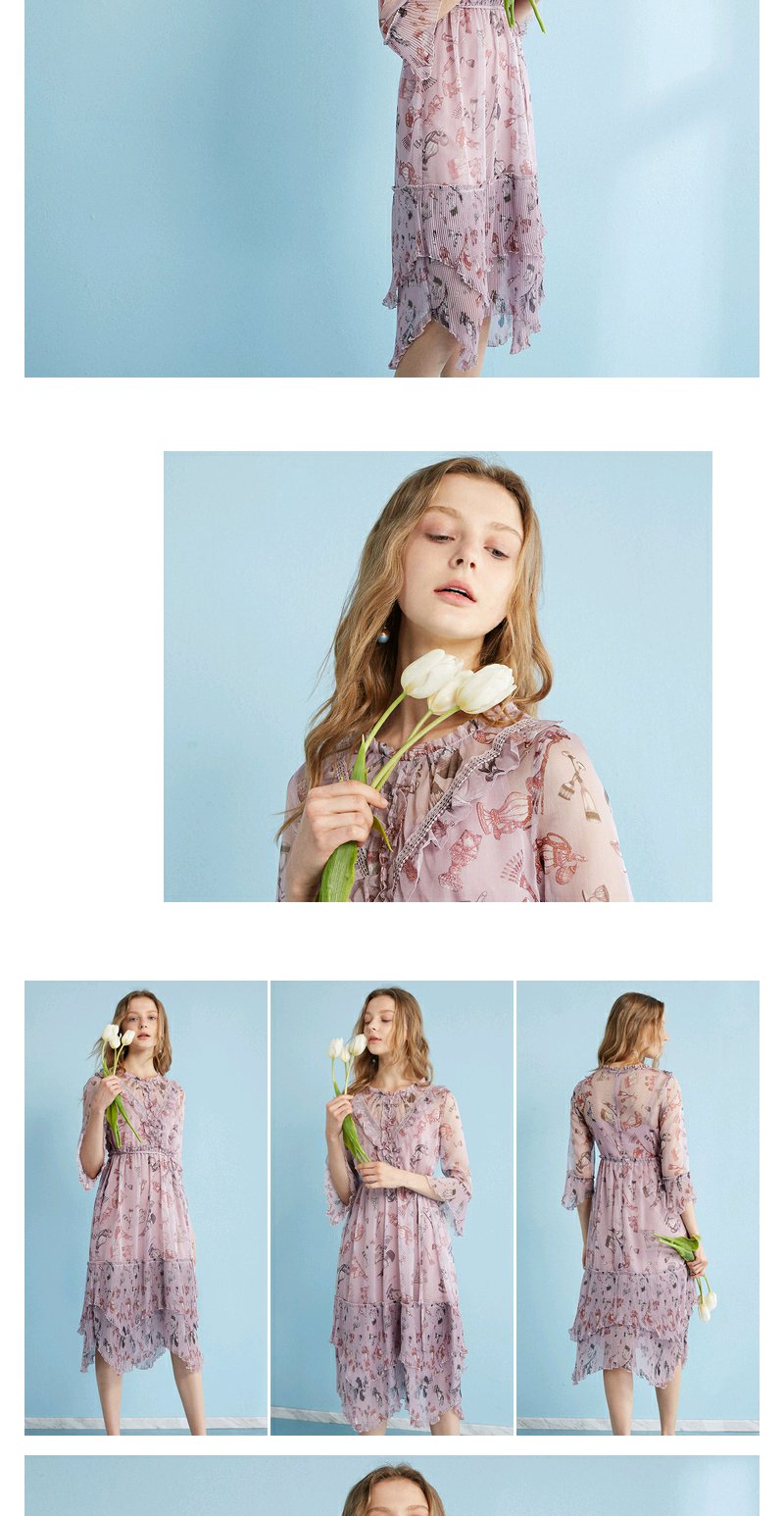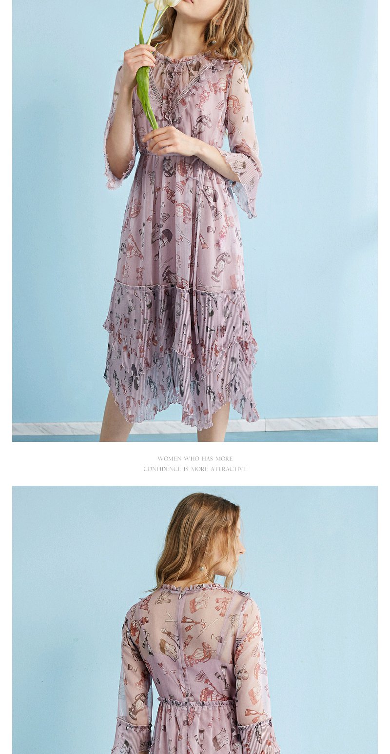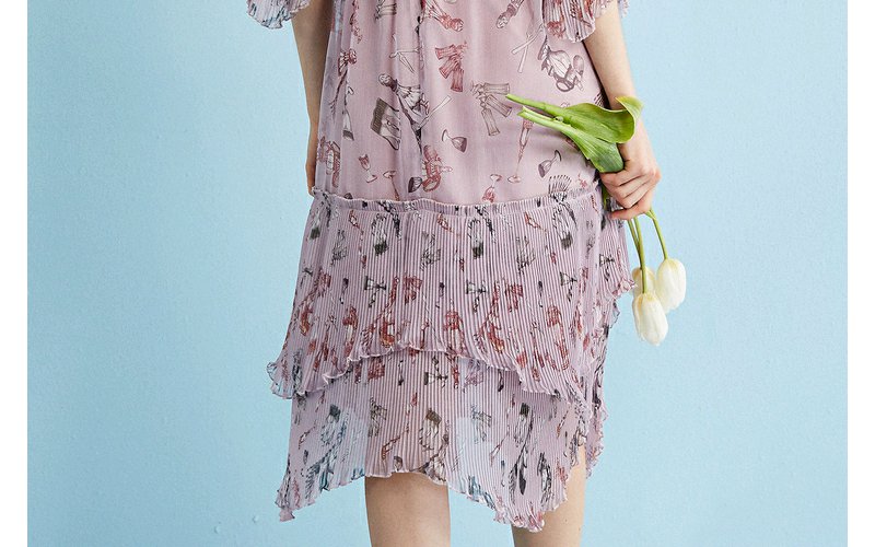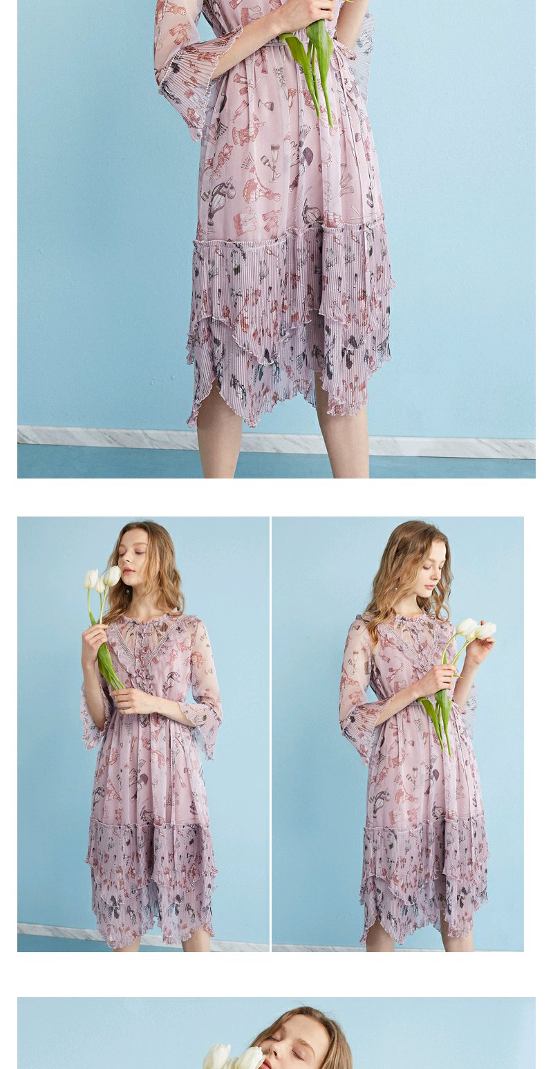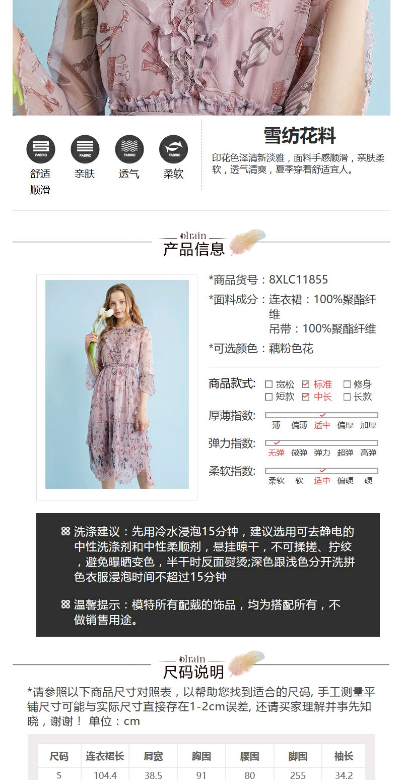 欧芮儿 风琴百褶收腰印花荷叶边雪纺连衣裙女中袖裙子