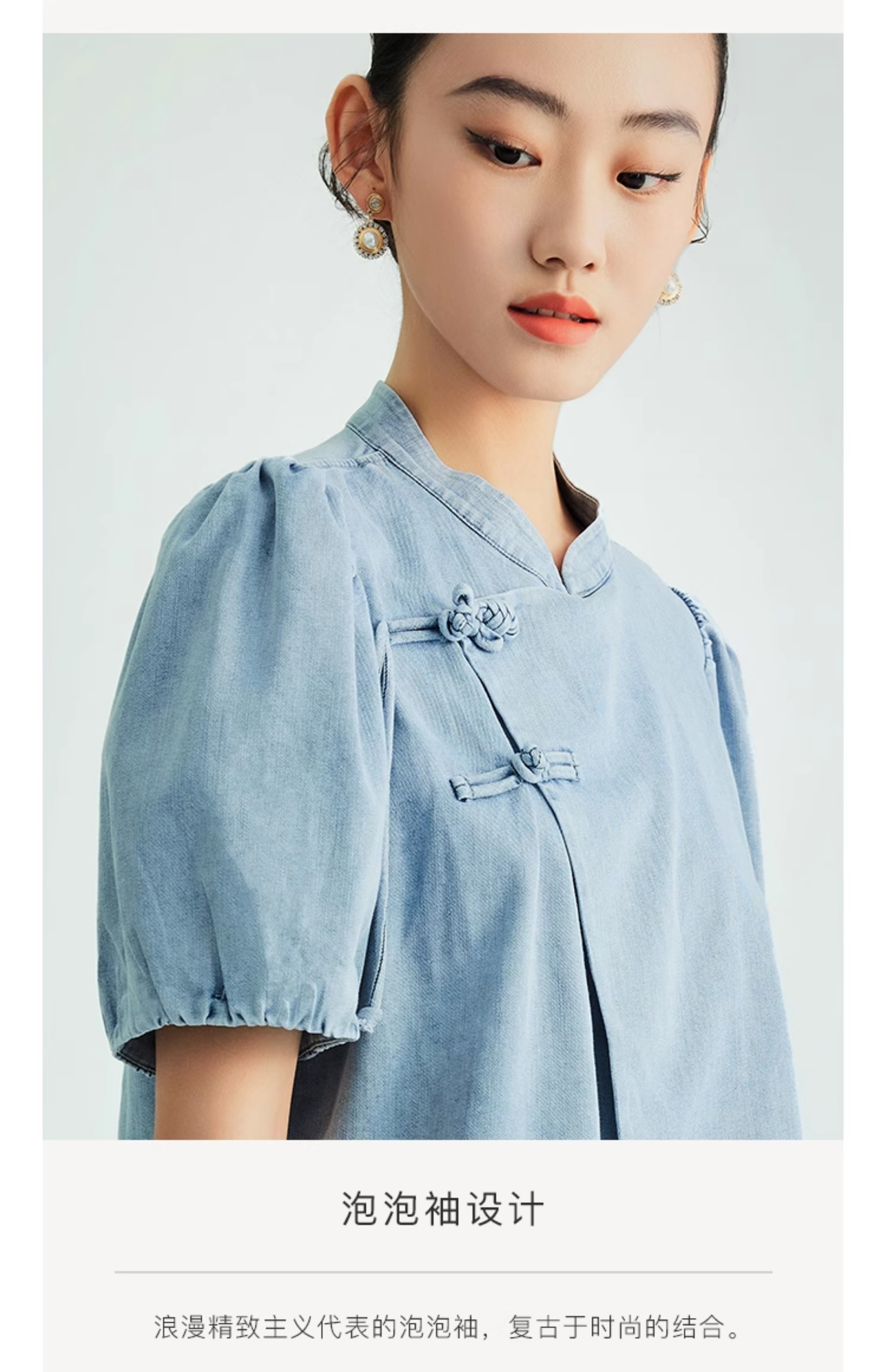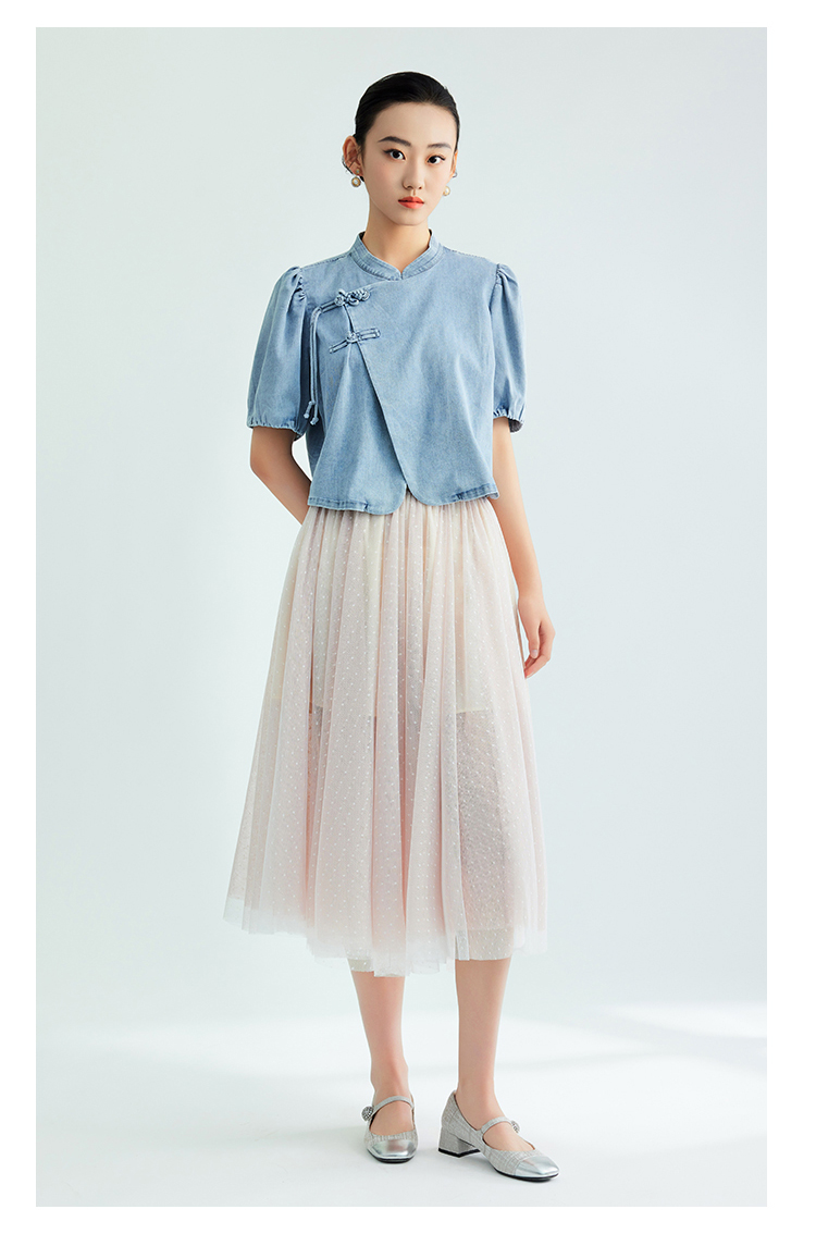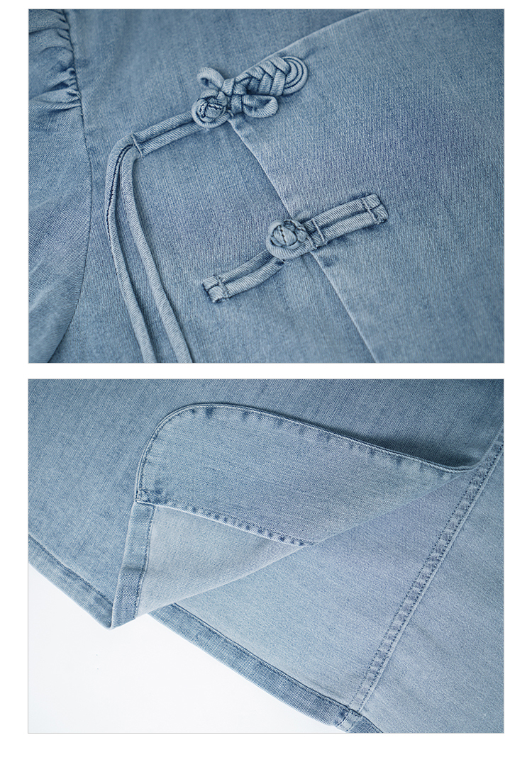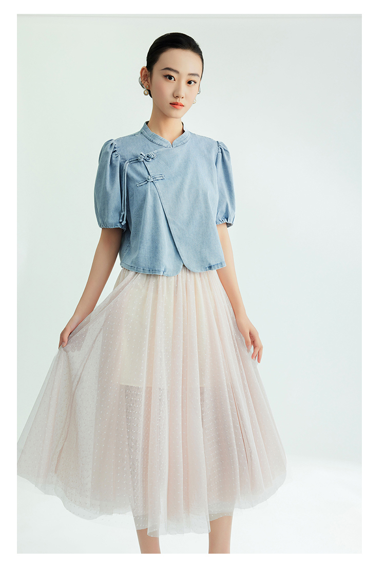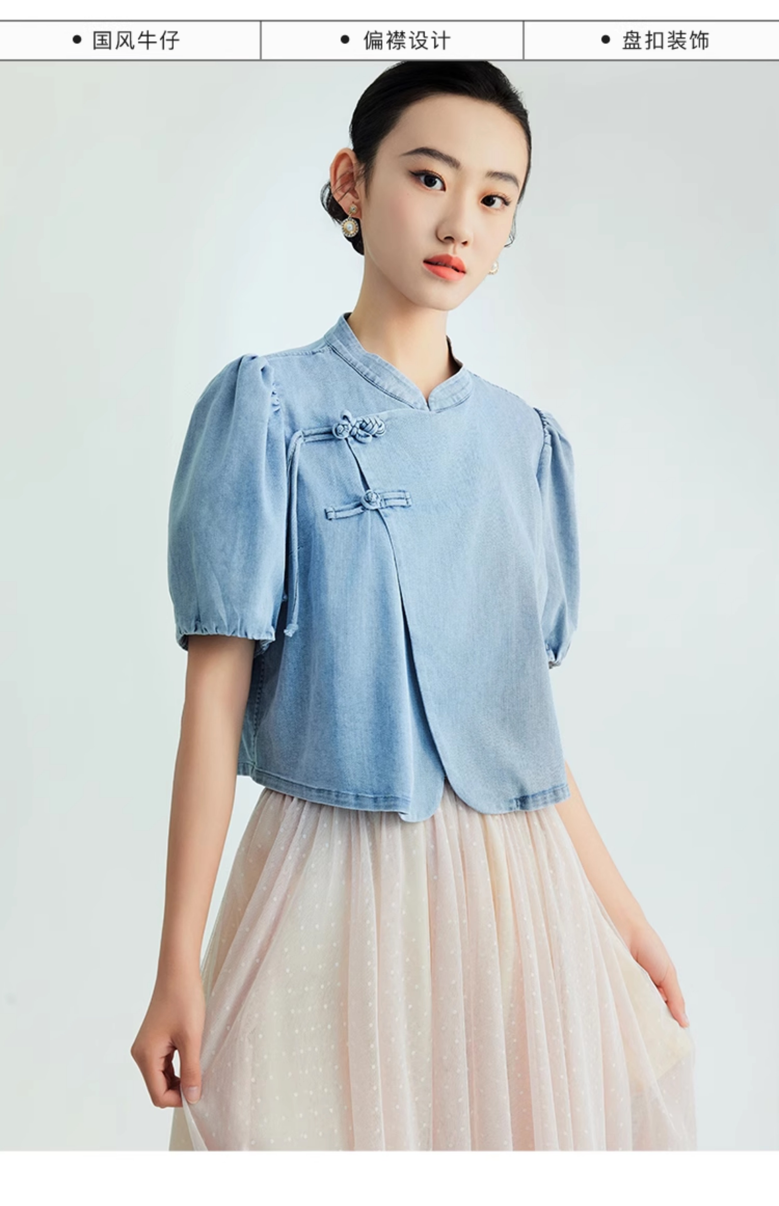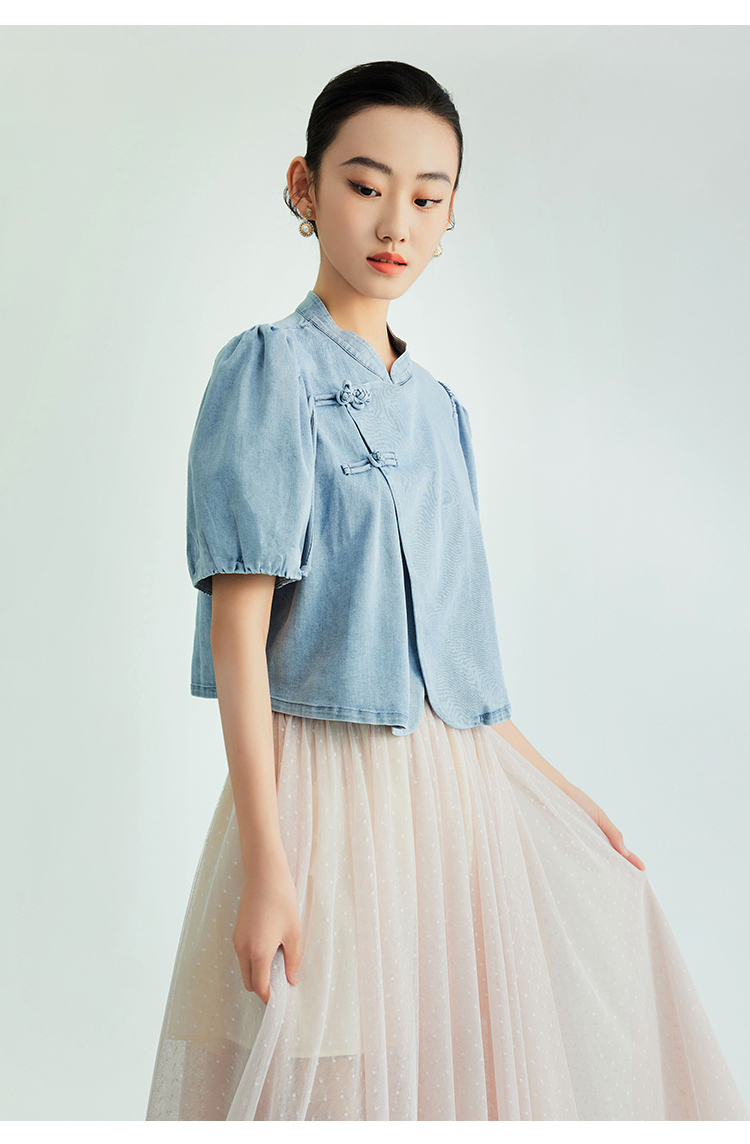 郭培成衣品牌新中式盘扣泡泡袖牛仔短袖上衣