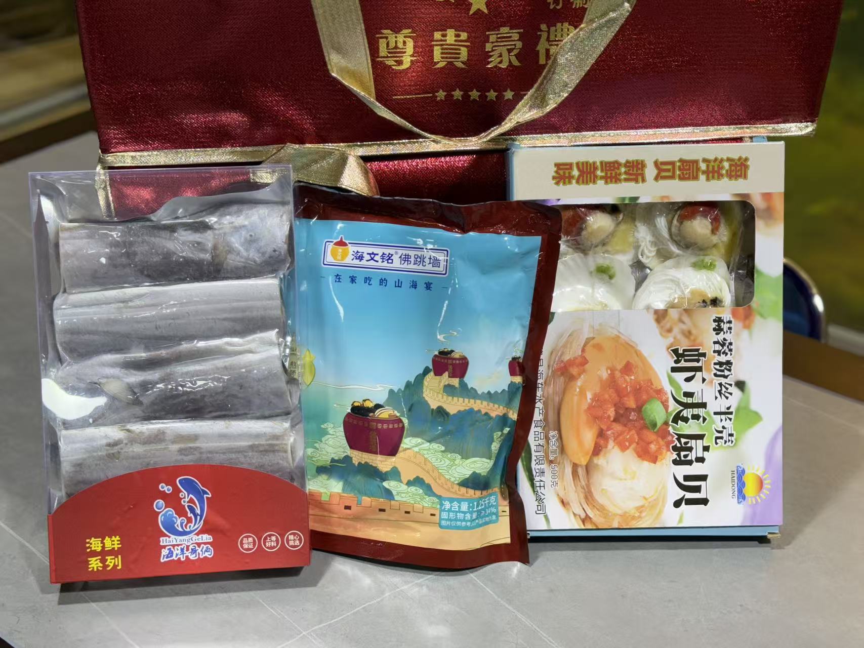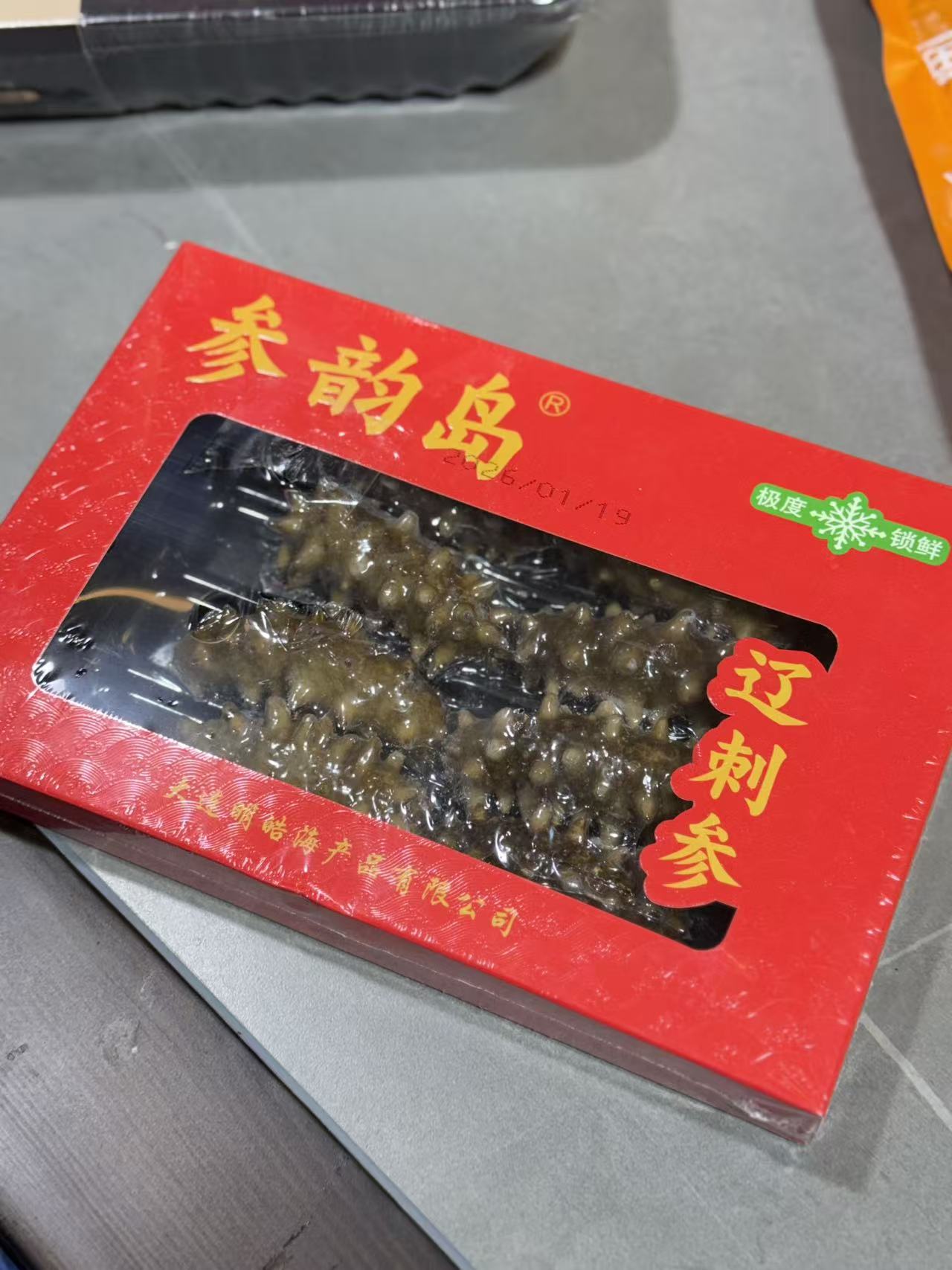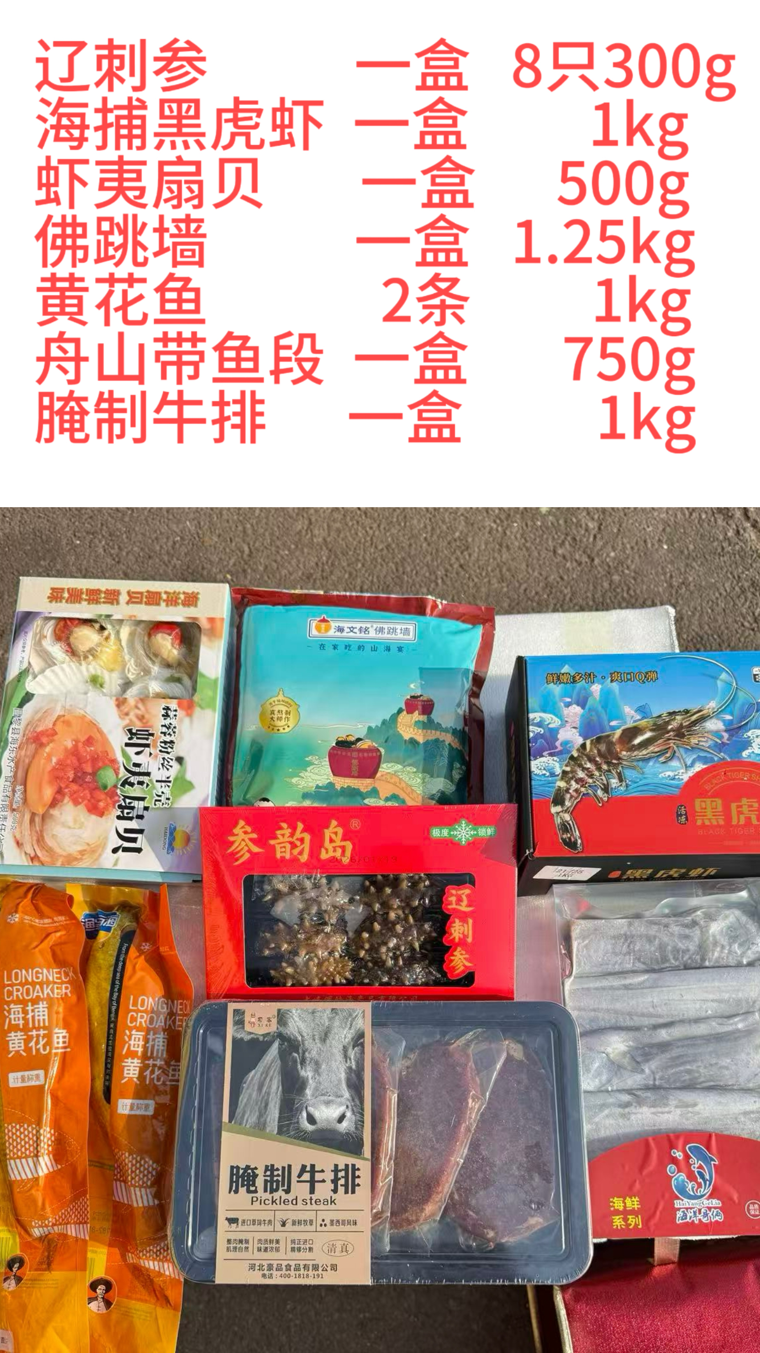 超大箱是真实惠,辽刺参8只300克,海捕黑虎虾虾1盒1千克,虾夷扇贝500g 海文铭佛跳墙1.25千克,黄花鱼2条1000克,舟山带鱼段一盒1.5斤 腌制牛排1千克
