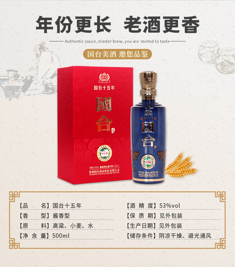 贵州国台酒 酱香型白酒53度500ml 国台十五年