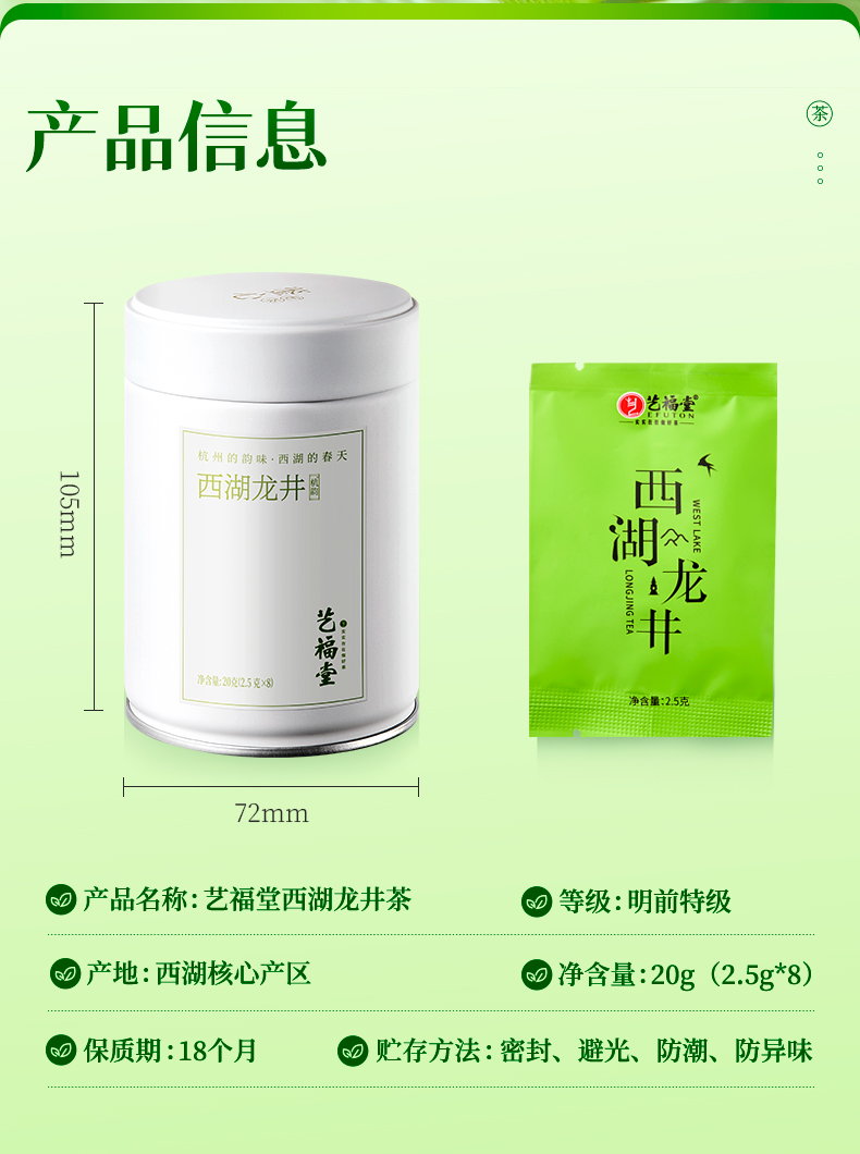 【新茶预售】艺福堂明前特级西湖龙井茶20g(2.5g*8)/罐