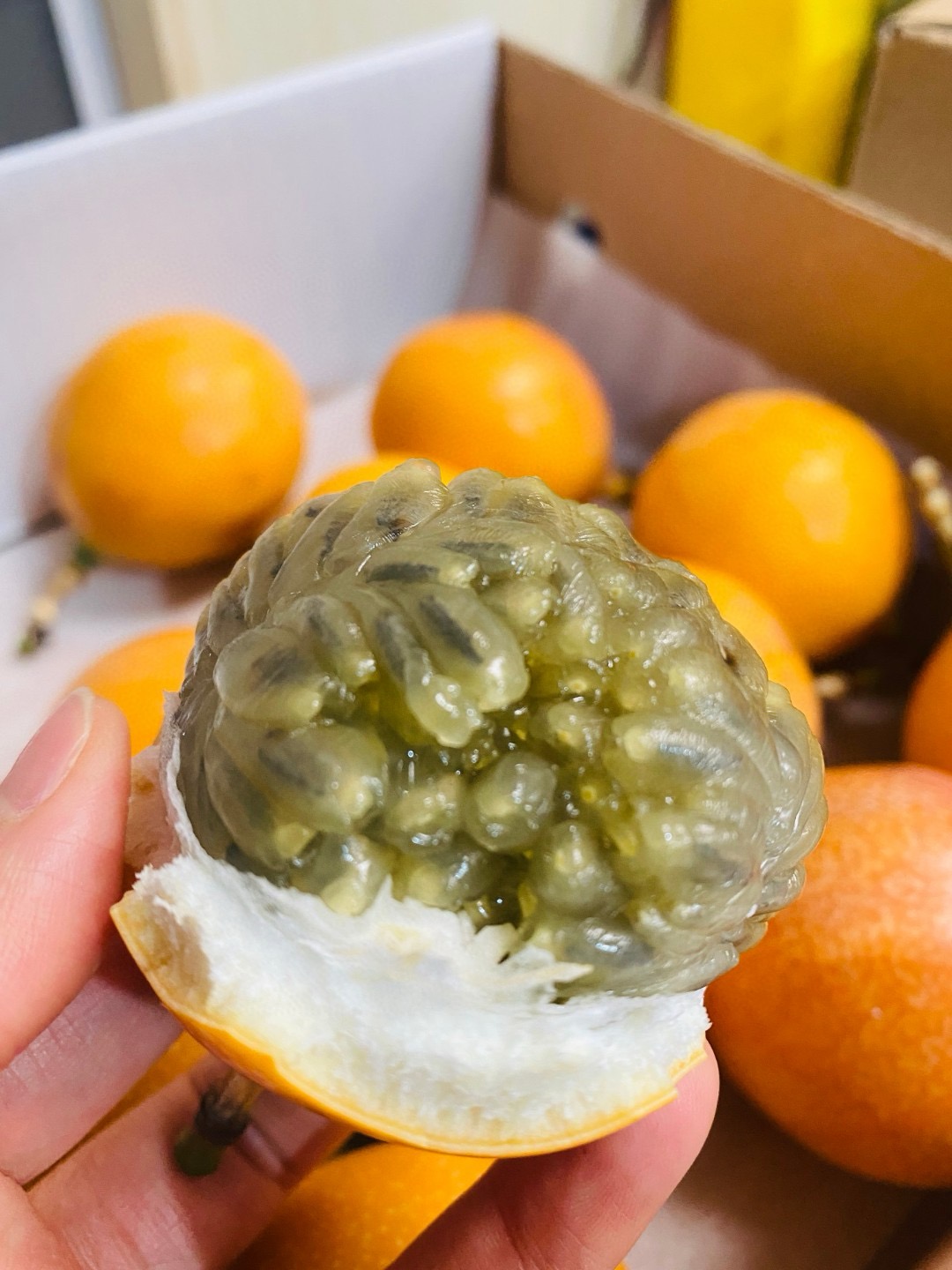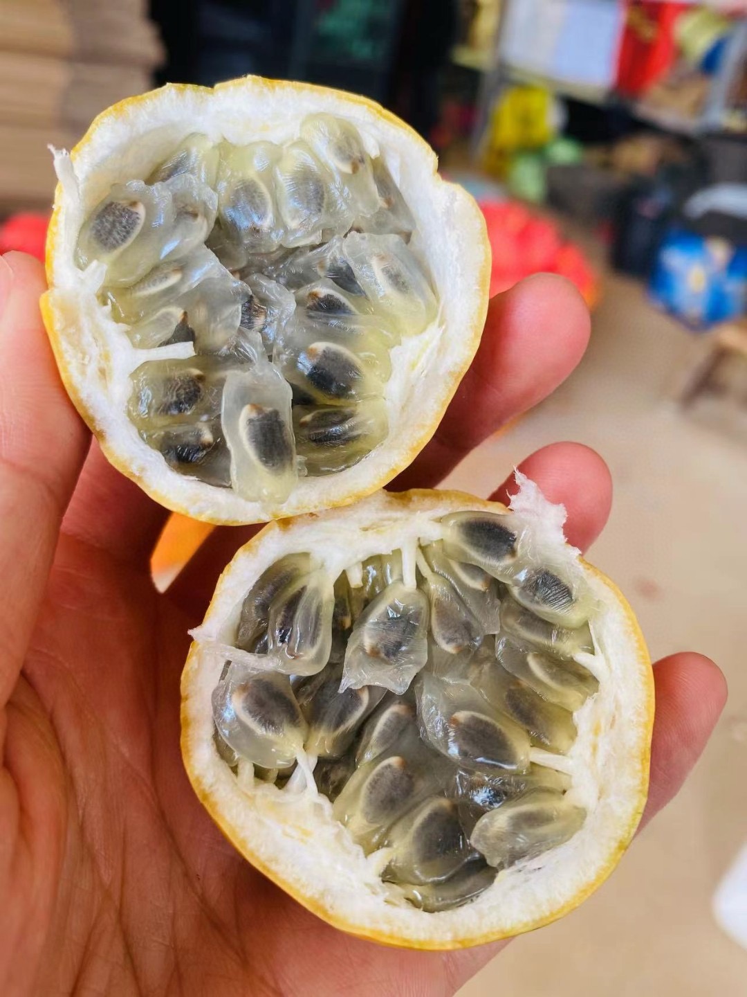 热情果果肉较为饱满,分量足。果皮内有淡黄色的绒状囊包覆果肉,果肉近乎透明,味道纯甜。其籽黑色,易咀嚼,热情果的果肉,果胶,籽富含人体必需氨基酸,多种维生素及锌、铁、钾等微量元素,有水果之王的美称。