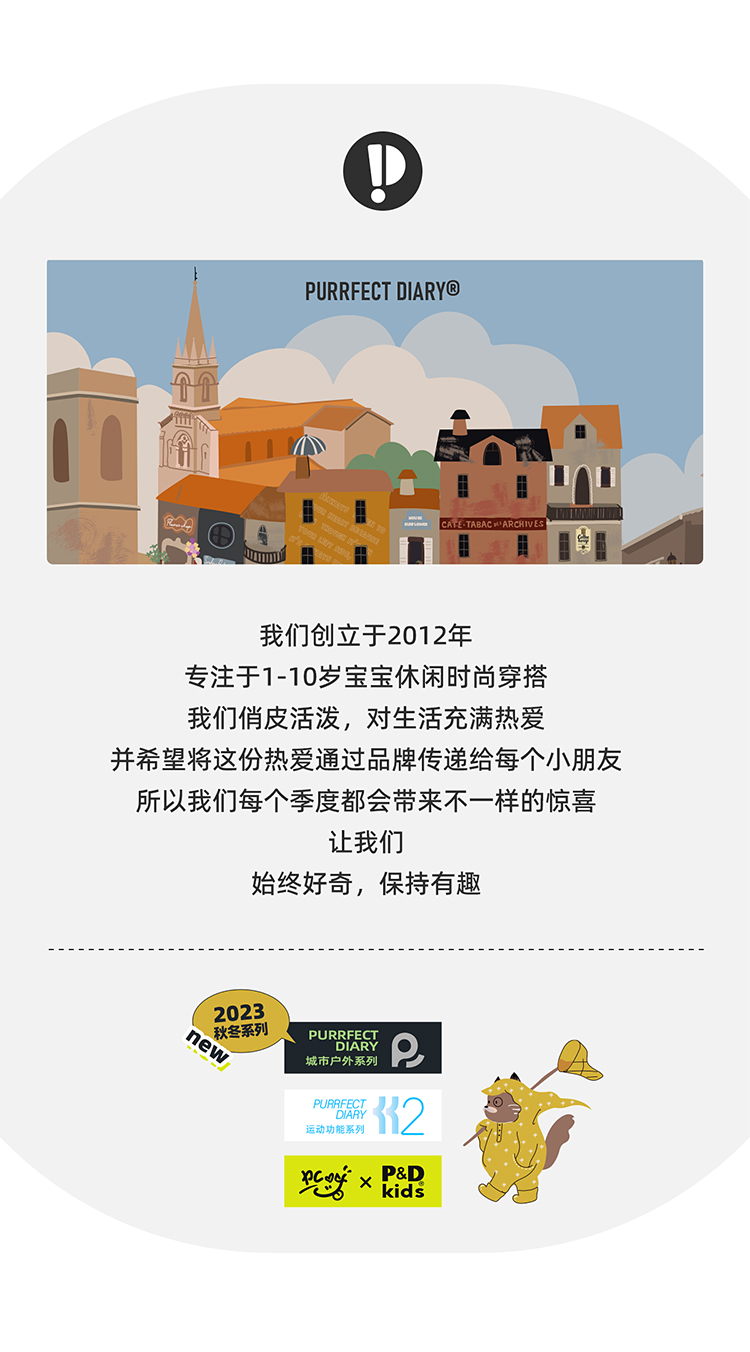 - Purrfect-Diary专注于贴近自然随性的穿着概念,轻奢平价的童装文化传播,在产品设计上更加注重婴童穿着的舒适性、安全性、更出众的国际化品牌,将欧美的育婴文化在中国进行深入的传播与推广。