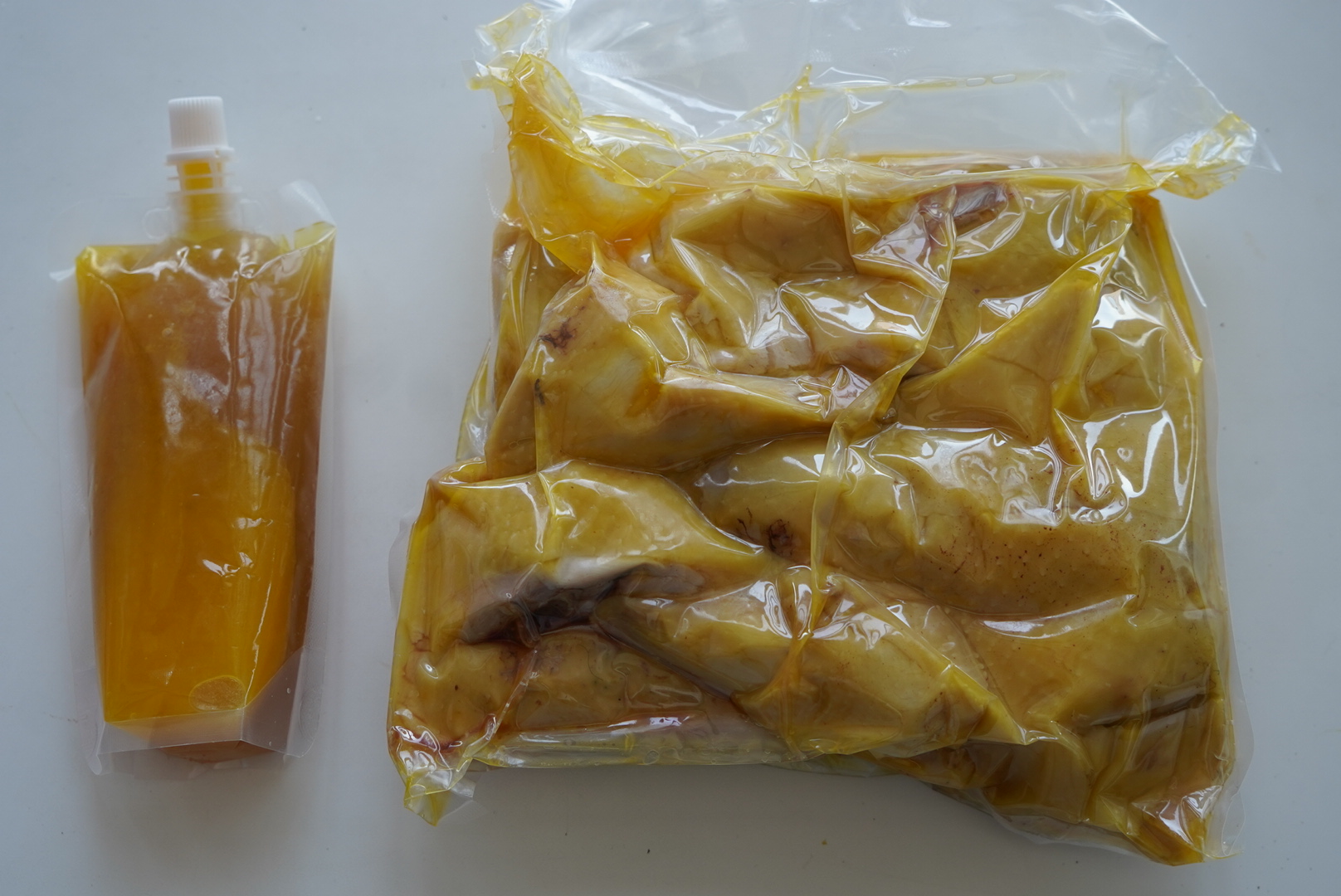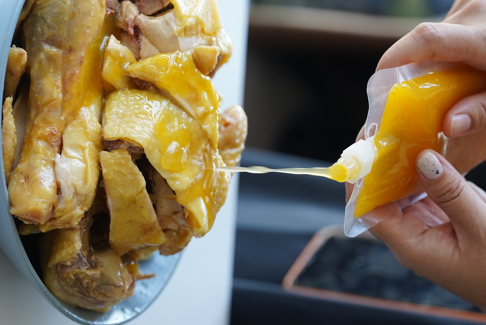 蒸鸡已经切好件,在家隔水蒸15分钟复热即可。最后最后,值得说明的是,这一整只河田鸡还会送一份鸡油和鸡汁,可以同蒸。没吃完的鸡油千万不要扔掉,经过我们的研究,最好的处理方式有两种,一个是用来煎松茸,或者蒸鸡的时候直接把松茸切片后垫在盘底。