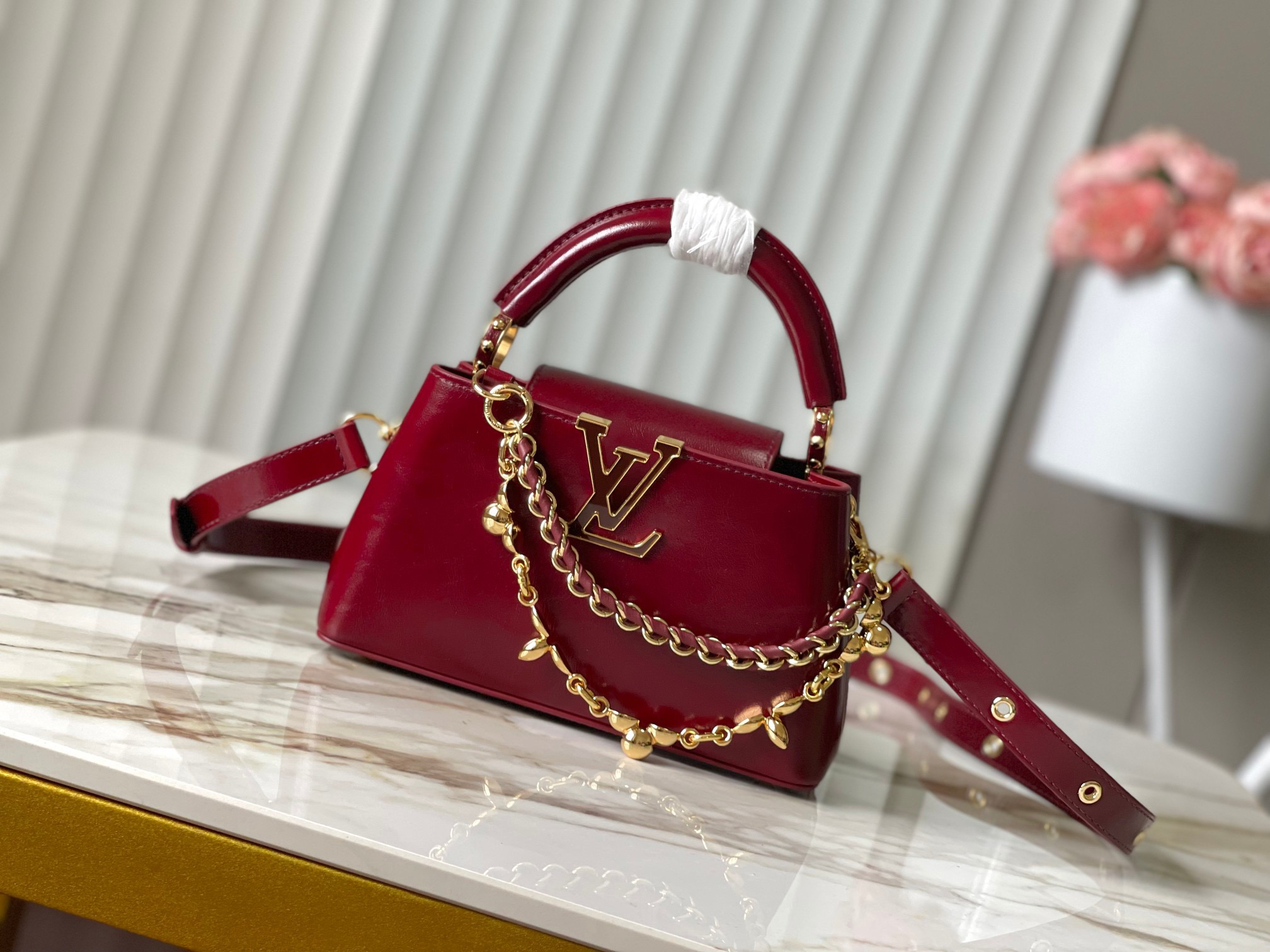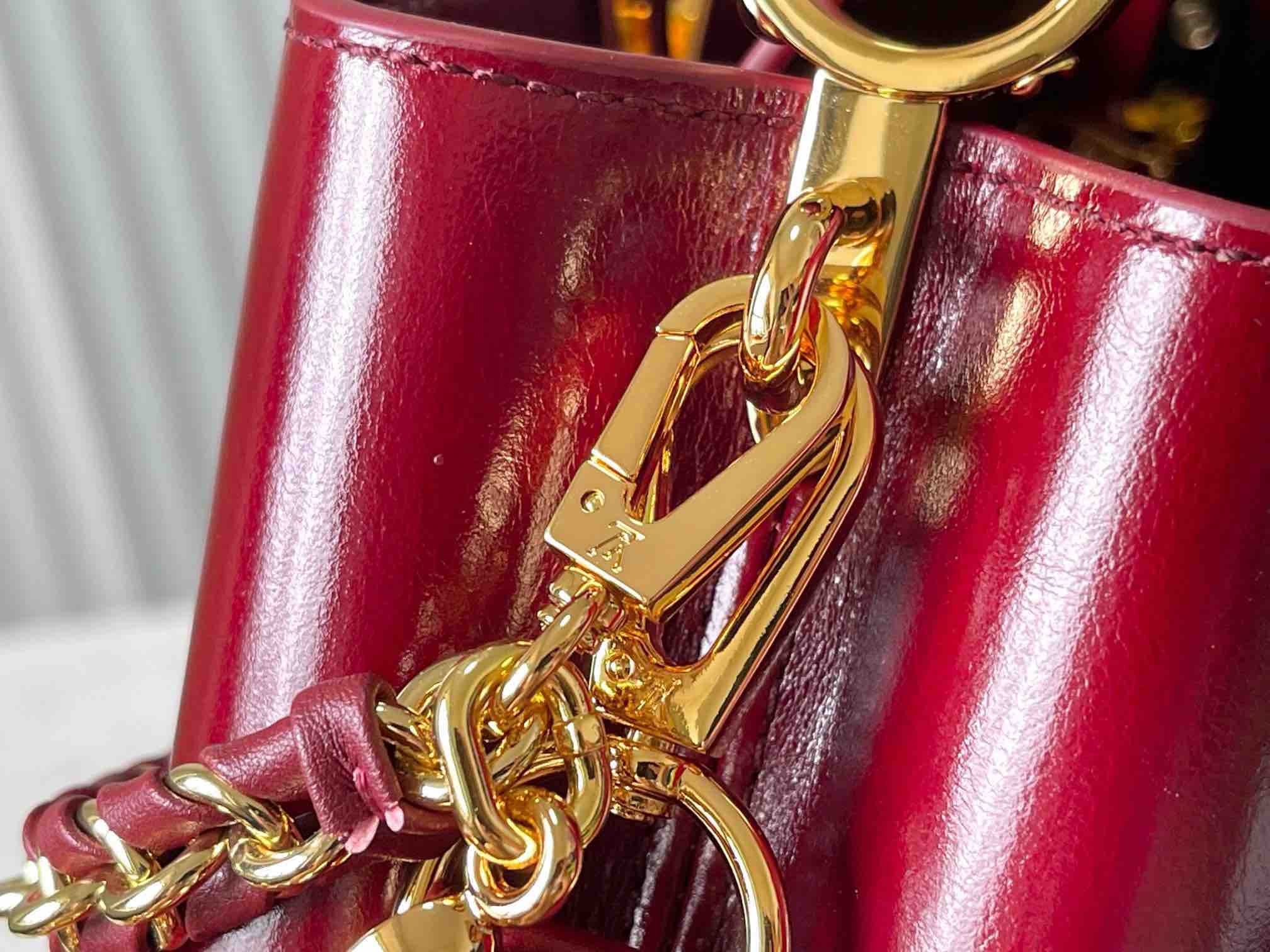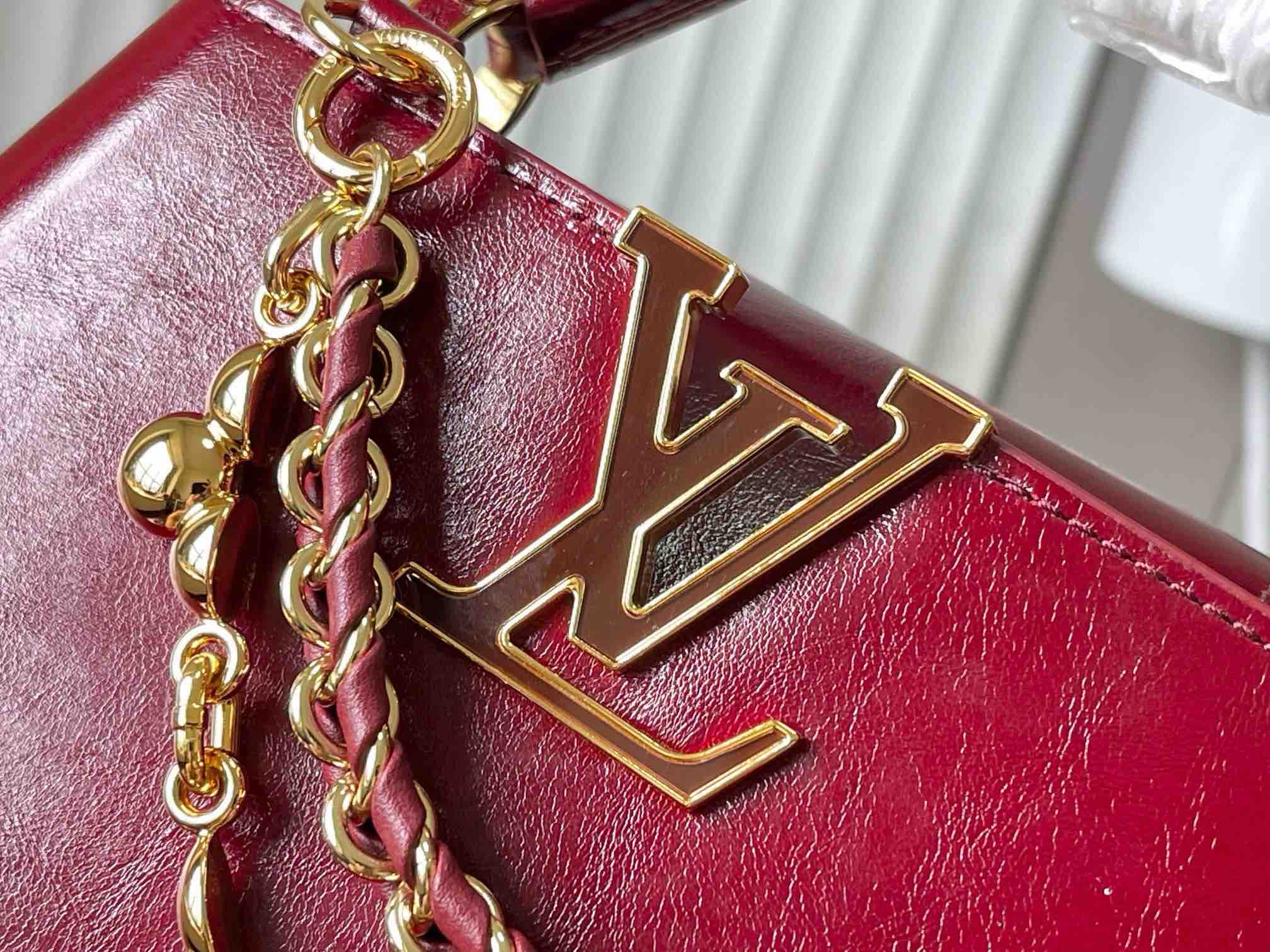 秋冬特惠💰1700 渠道级LV 新品 te级LV 动态芯片M25473/M48865酒红油蜡二合一 本款Capucines East-West 手袋令皮革巧现褶皱质感 娓娓道出新季潮流风尚 牛皮革饰边勾勒流畅线条 LV字母与可拆卸链条闪烁金属莹泽 宽敞内里满足不同收纳需求 多种背携方式尽显功能巧思。Size : 22 * 12 * 8 CM
