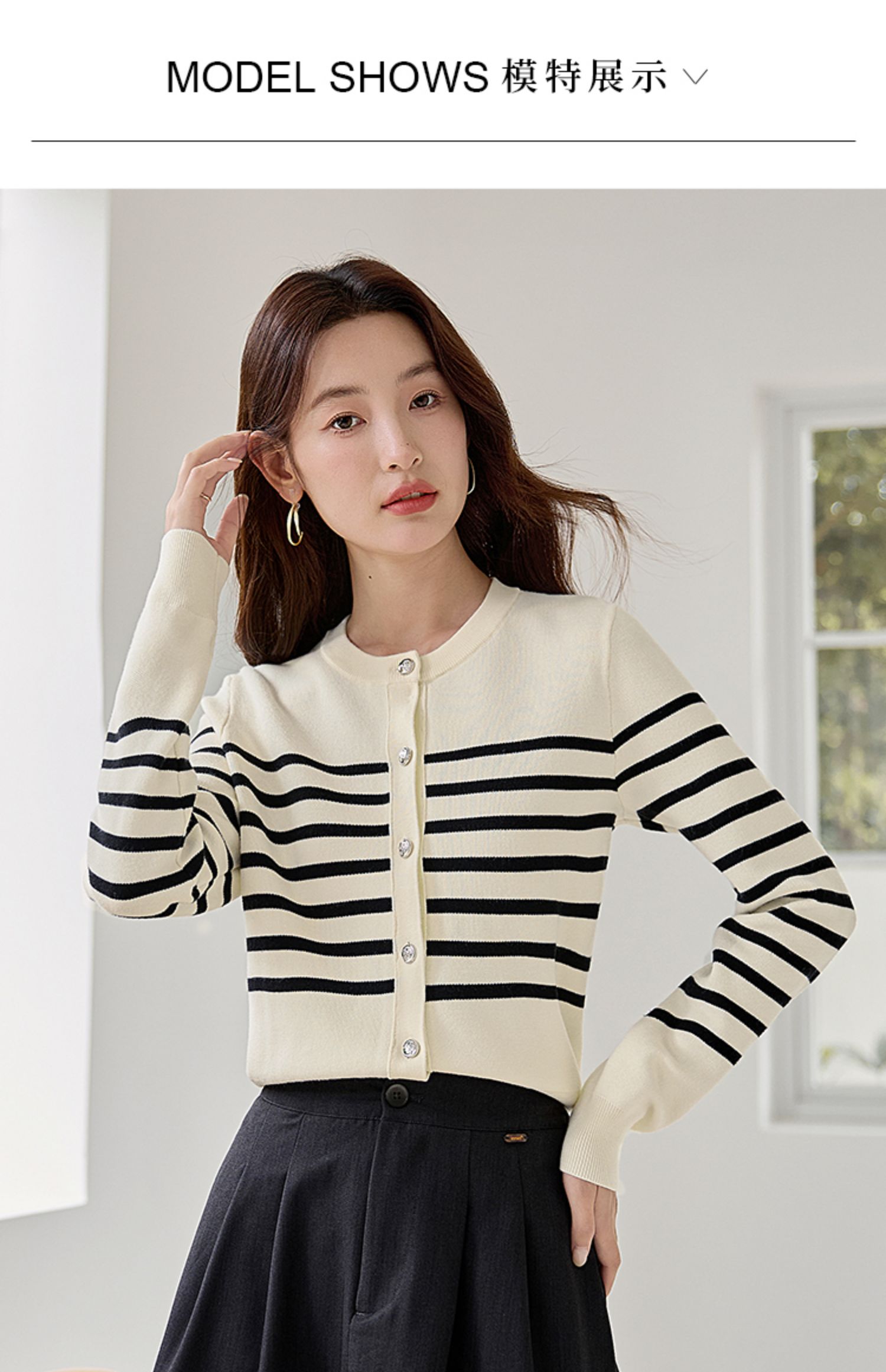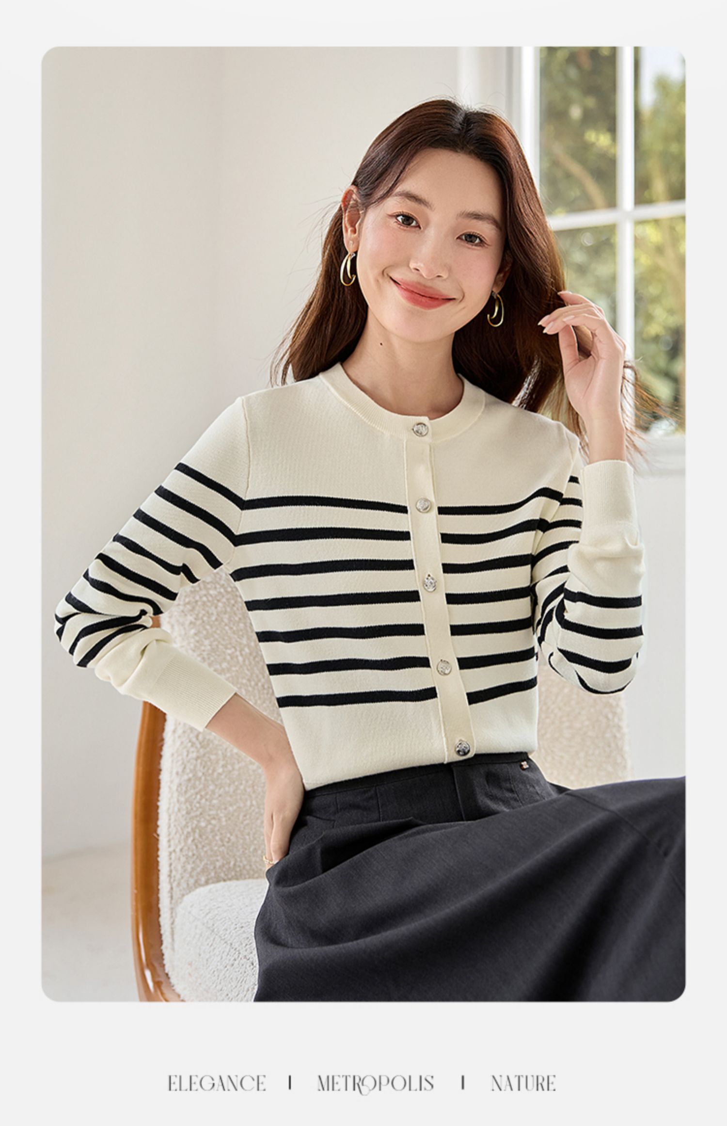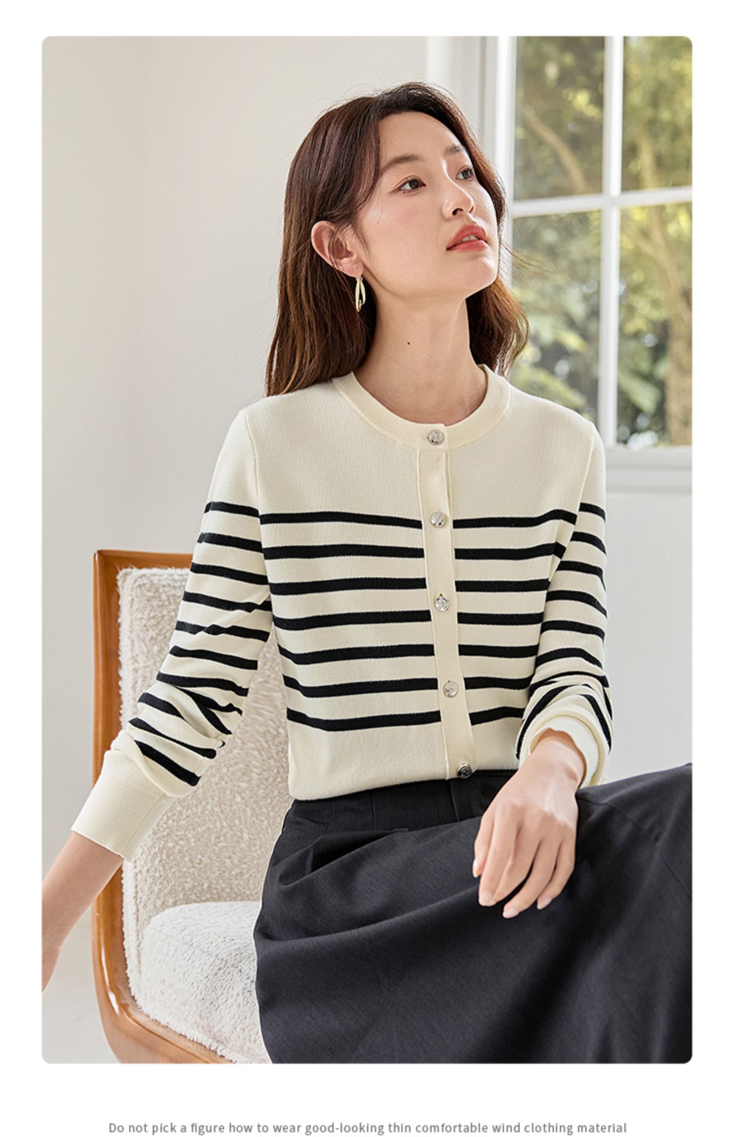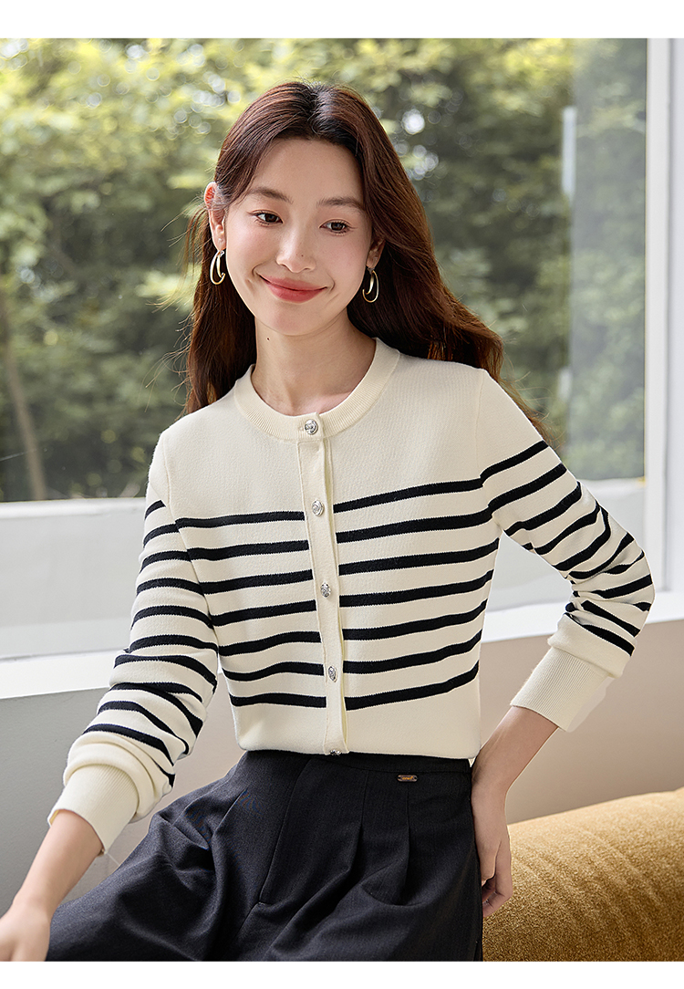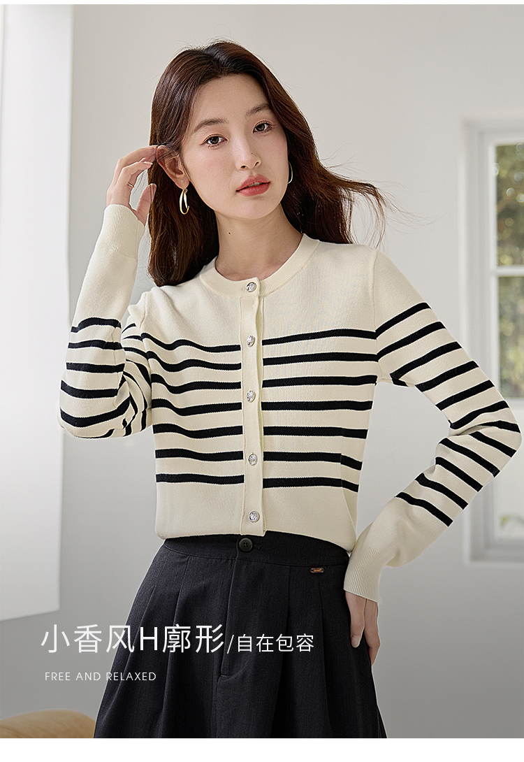【年终特卖】熙世界小香风条纹针织开衫2025年秋季新款休闲圆领法式复古上衣