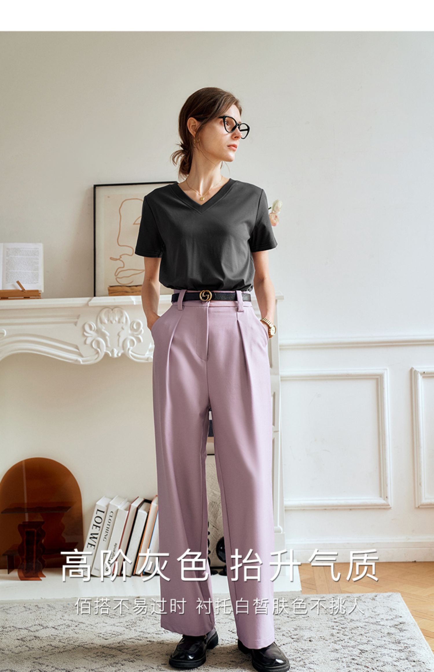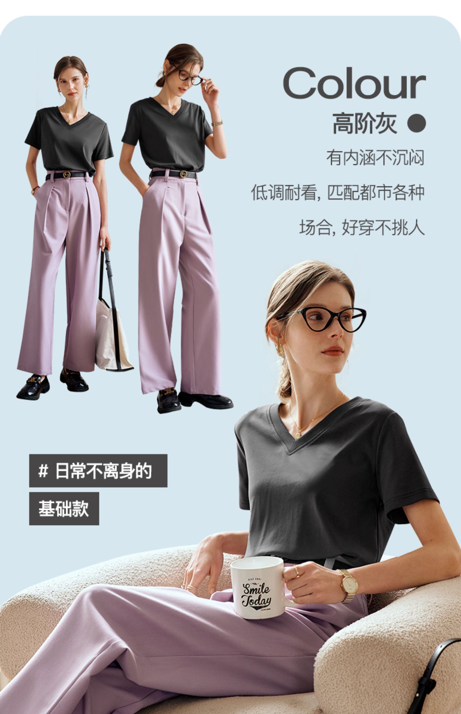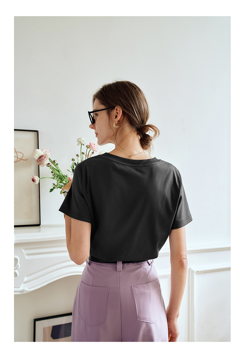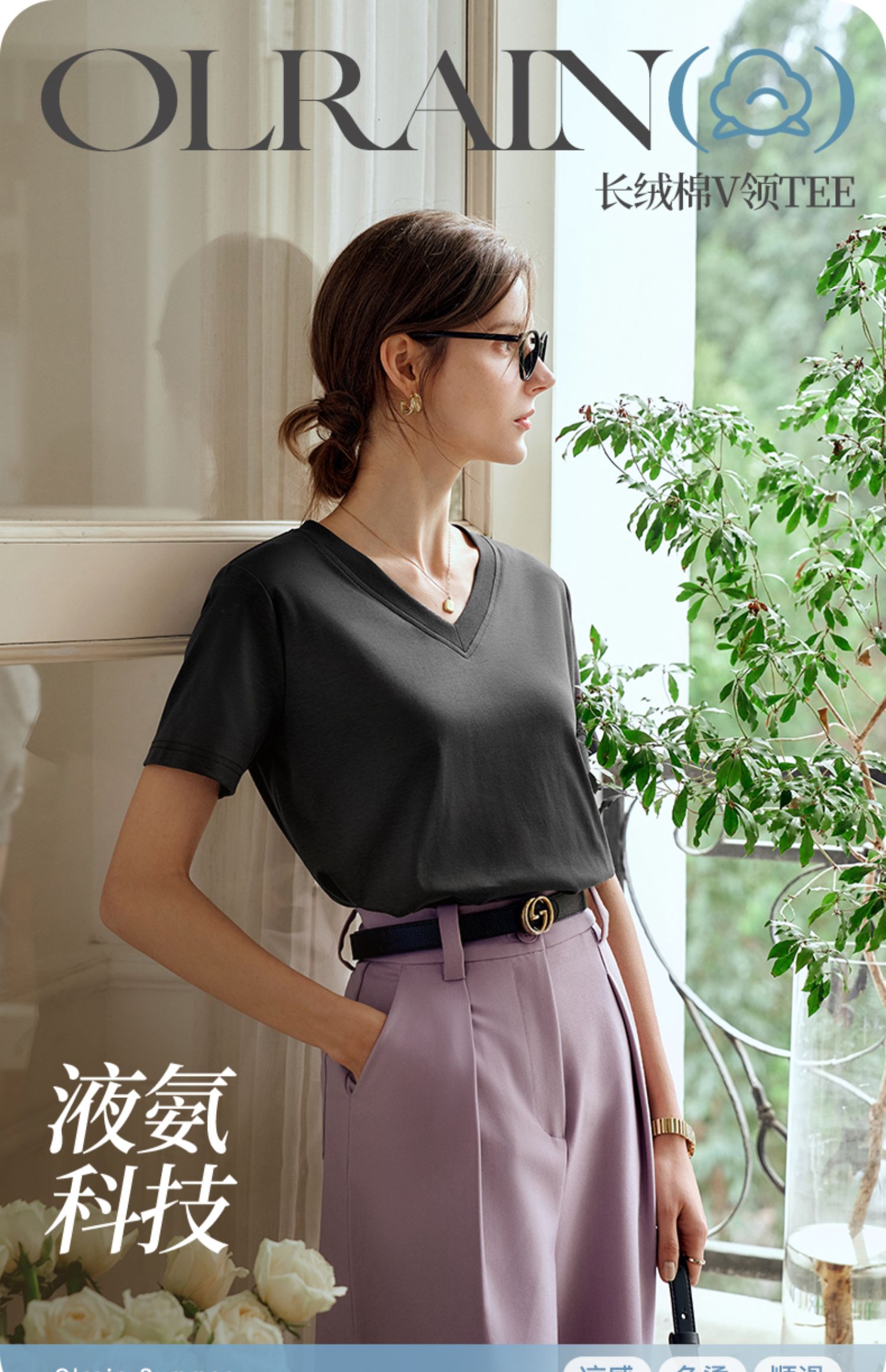OLrain欧芮儿灰色短袖T恤女夏季2024年新款时尚V领百搭正肩上衣