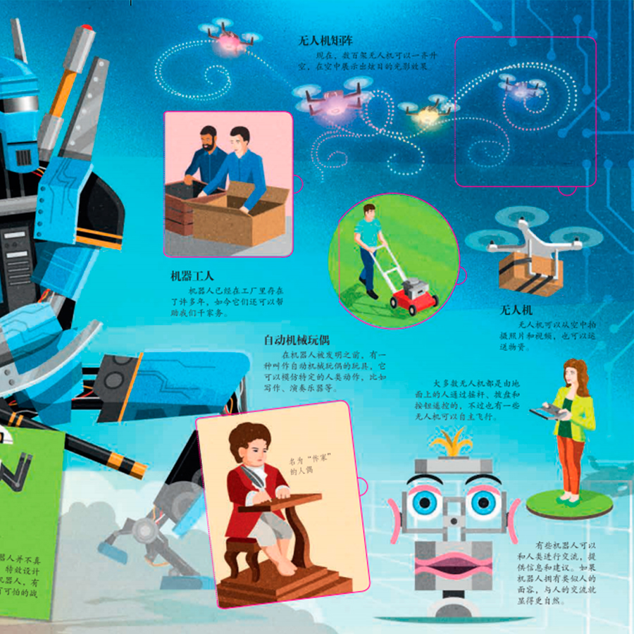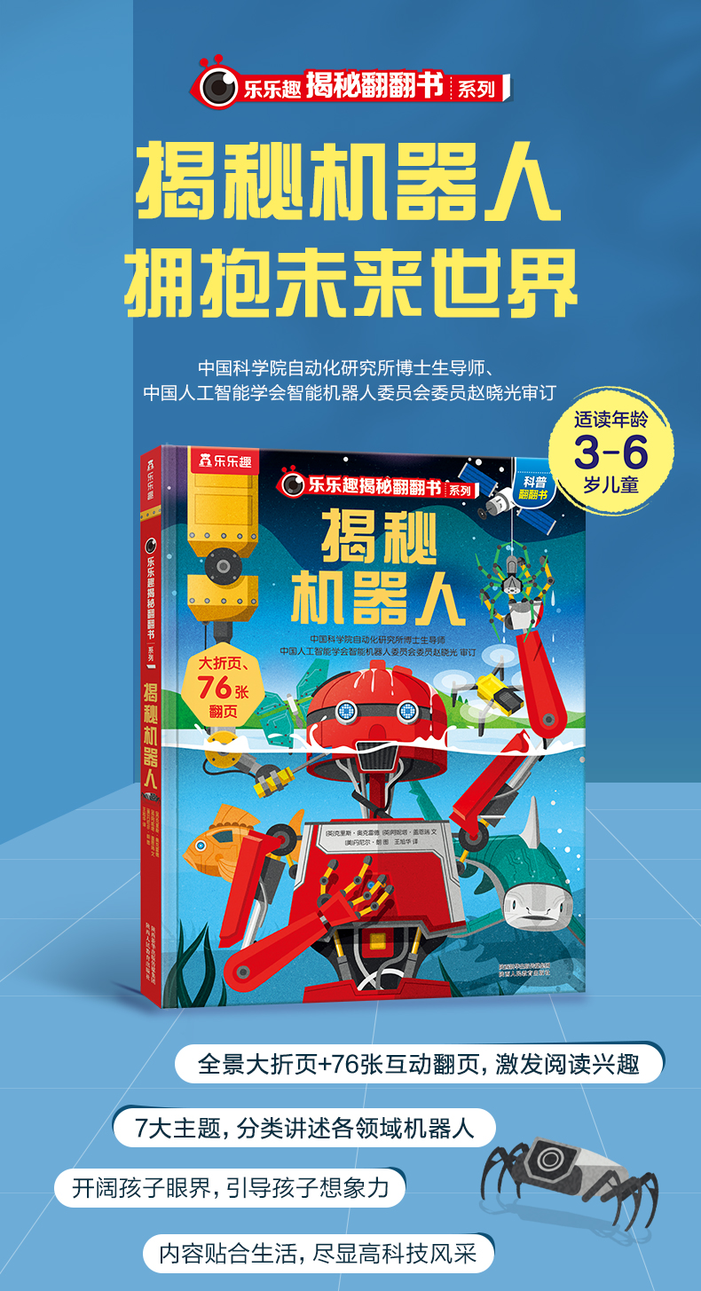 乐乐趣揭秘翻翻书系列《揭秘机器人》讲述有关机器人的科普知识。本书文字生动,插画精美,含有2个大折页和76个翻页,介绍了全世界70余个功能形态各异的机器人,充分满足孩子们探索世界的好奇心。翻页下面隐藏着有趣的机器人科普知识和趣味故事,让孩子在阅读时手脑互动,增长智慧。