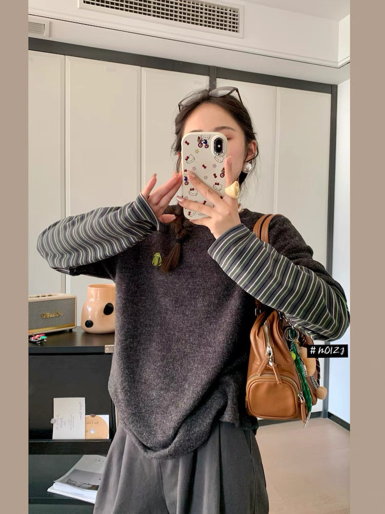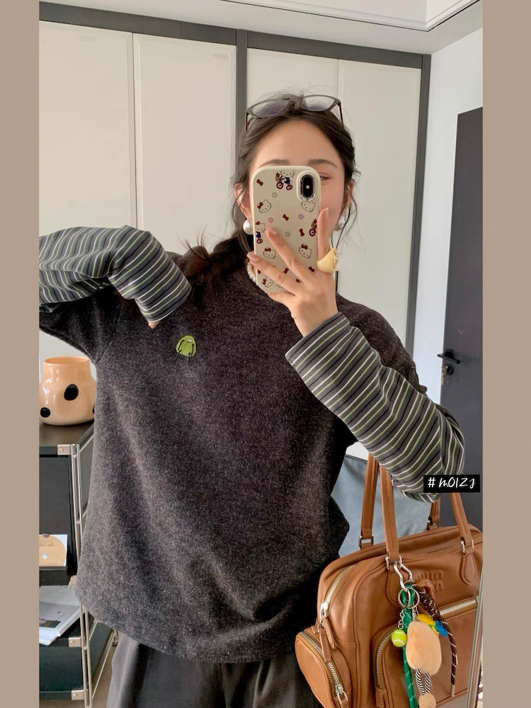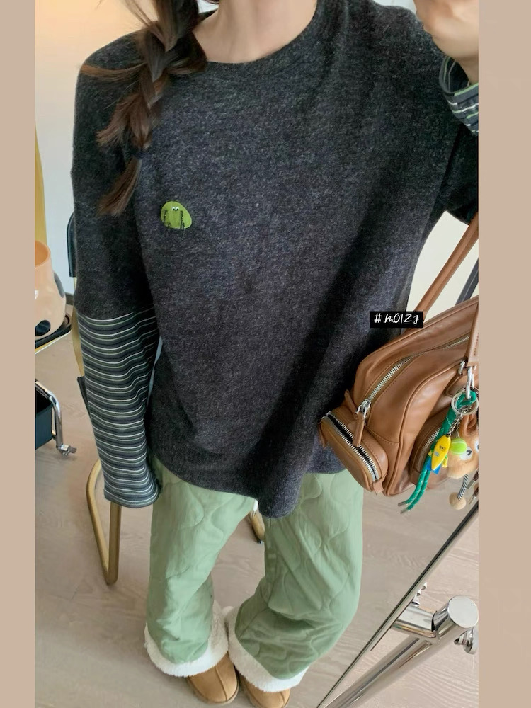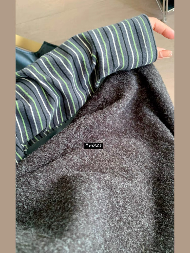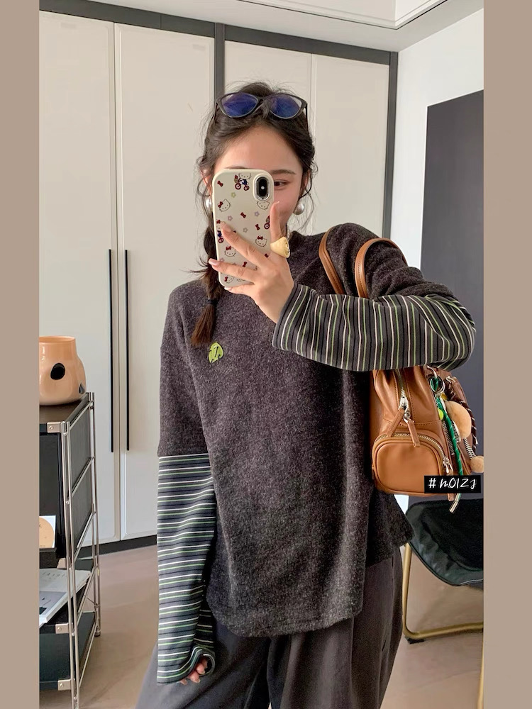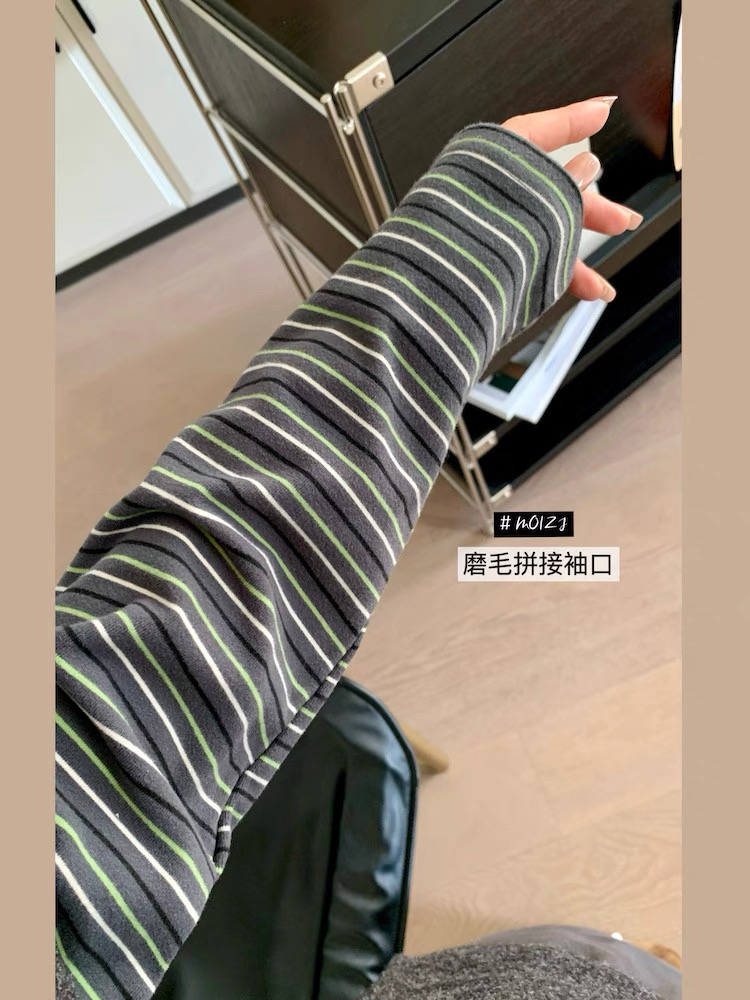 兔毛绒感黑灰色主体+条纹袖的拼接,
