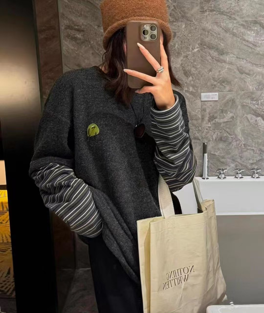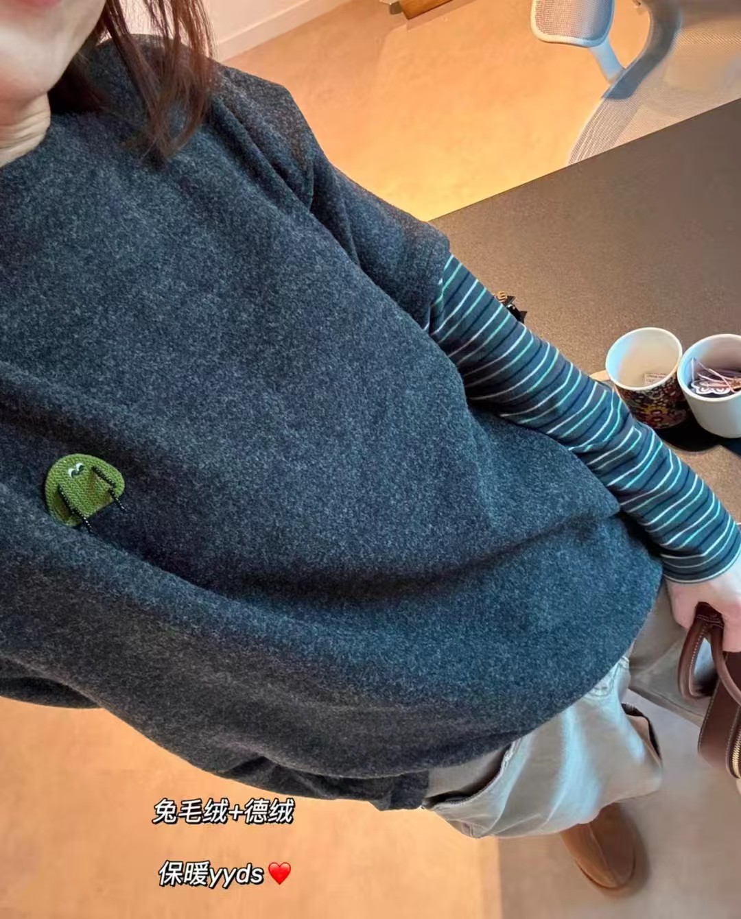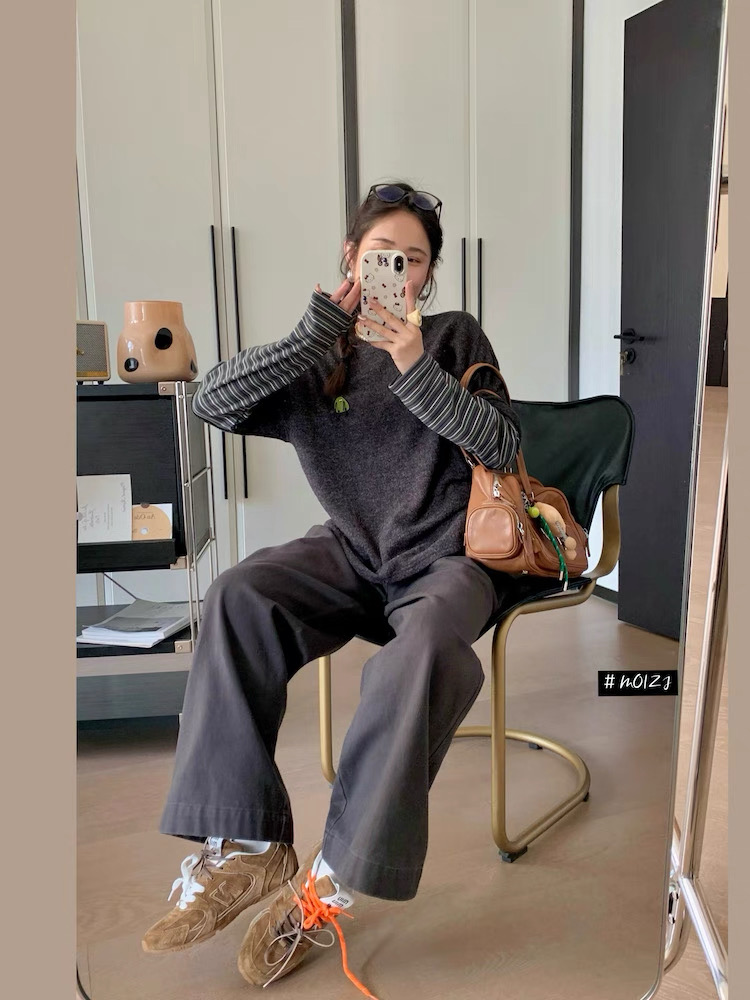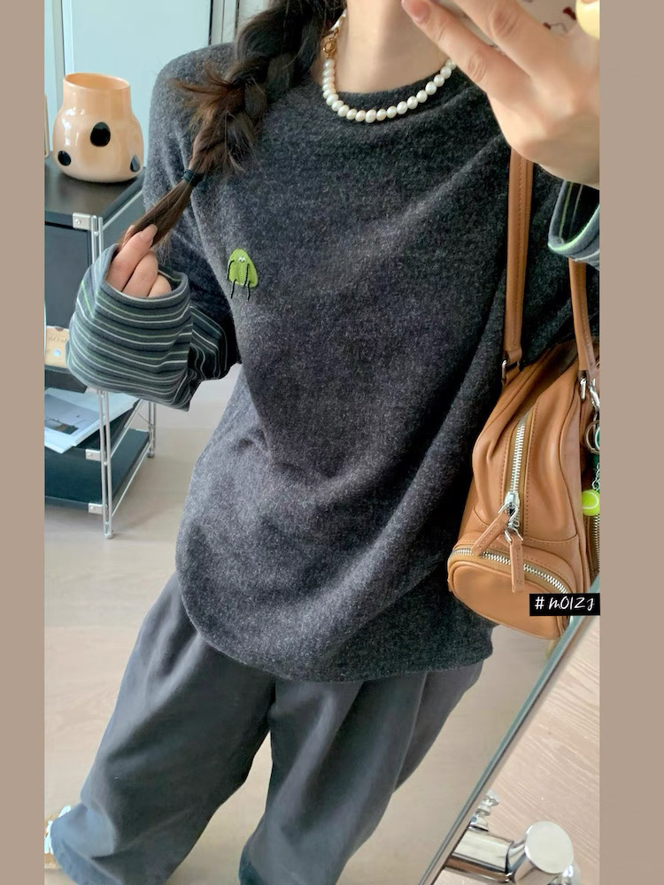 兔毛绒感黑灰色主体+条纹袖的拼接,
