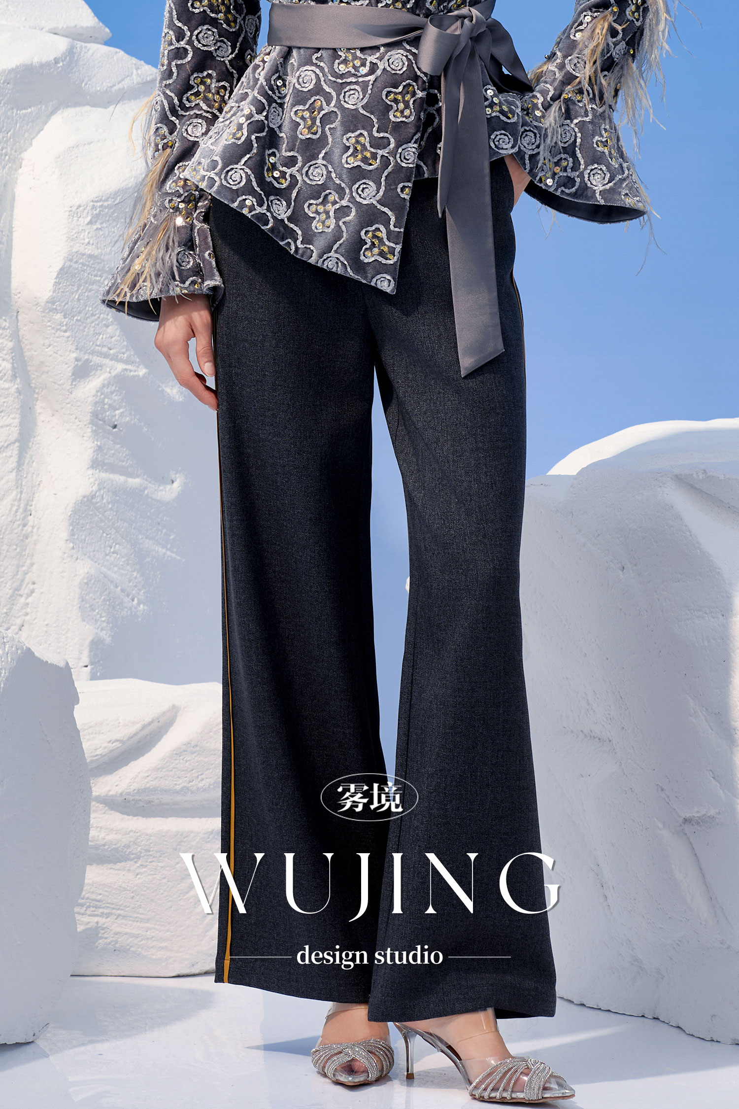 4202041 灰金片羽 进口亮丝斜纹裤子 雾境