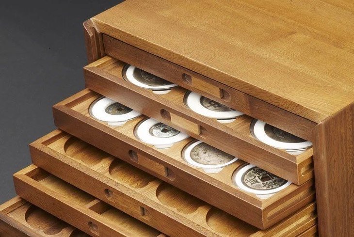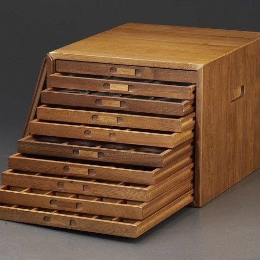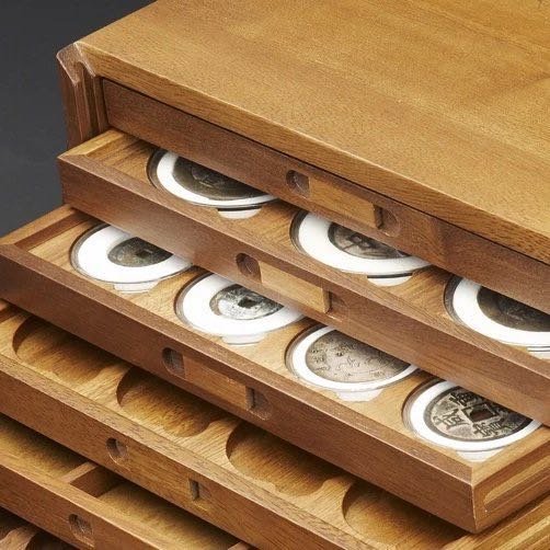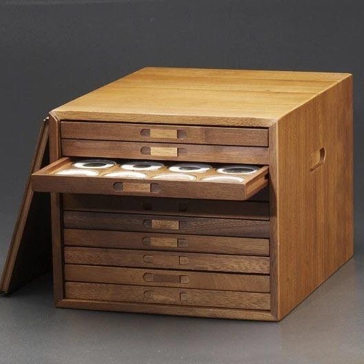 十层黑胡桃木钱币收藏箱,钱币收藏之重器!好的收藏箱本身就是一件艺术收藏品。采用缅甸黑胡桃实木制作,原创设计,结构与做工进一步提升与改良,箱体内藏暗榫结构,箱门四角加有固定榫,做工精细典雅,更持久耐用!尺寸:长35cm*宽27.5cm*高23.5cm,箱体带防护净重14KG.托盘高2cm,托盘正面留有标签栏,D型托盘内格可以活动取出,更加人性化!一箱多用,分类、收藏、展示、收纳,内配10拉格(52圆盒,71圆盒,90圆盒,PCGS盒,NGC盒,PCCB大布币盒,D型方格托盘等12种样式,每层可放数量请看图例),可自由配置各种理想内格组合,真正市场上难得的好收藏箱!费工耗时出精品,材料与人工成本在不断的攀升,后期收藏价更高,箱内不包括塑料盒等配件!