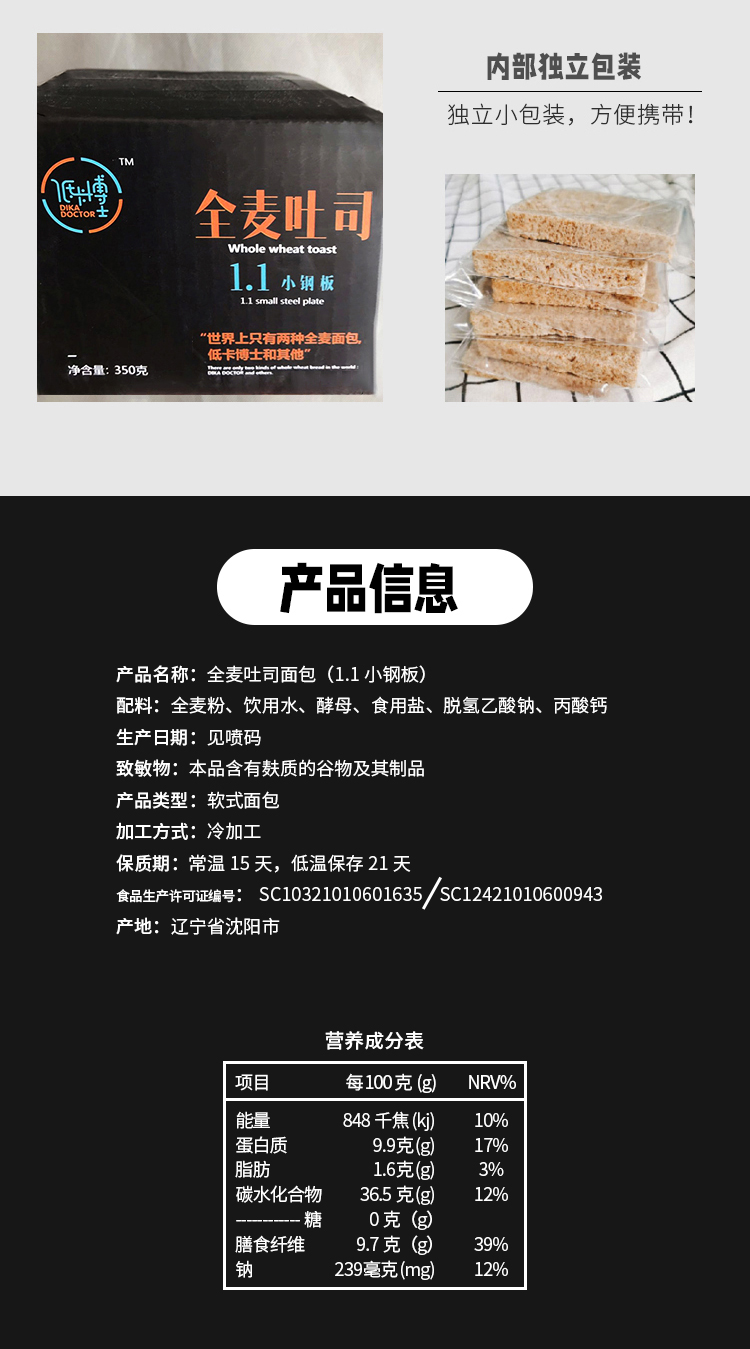 【6片/12片/18片】低卡博士 全麦面包小钢板1.1 A-3392