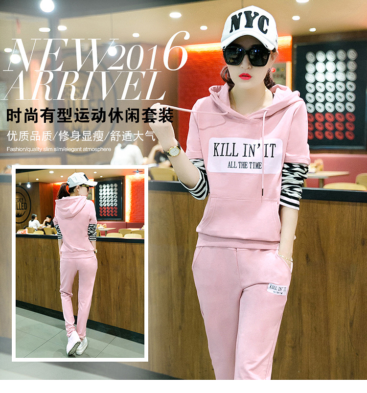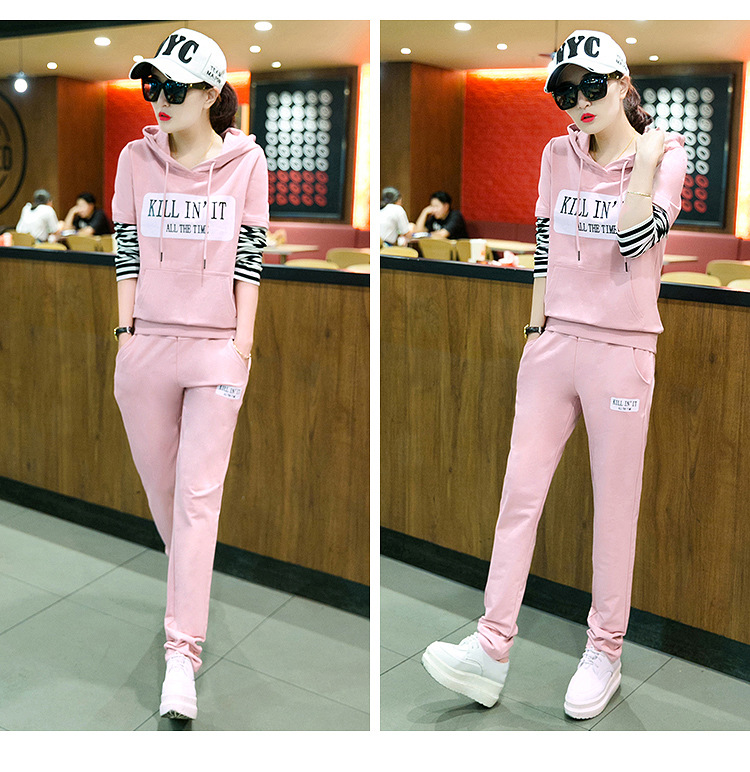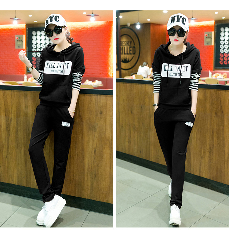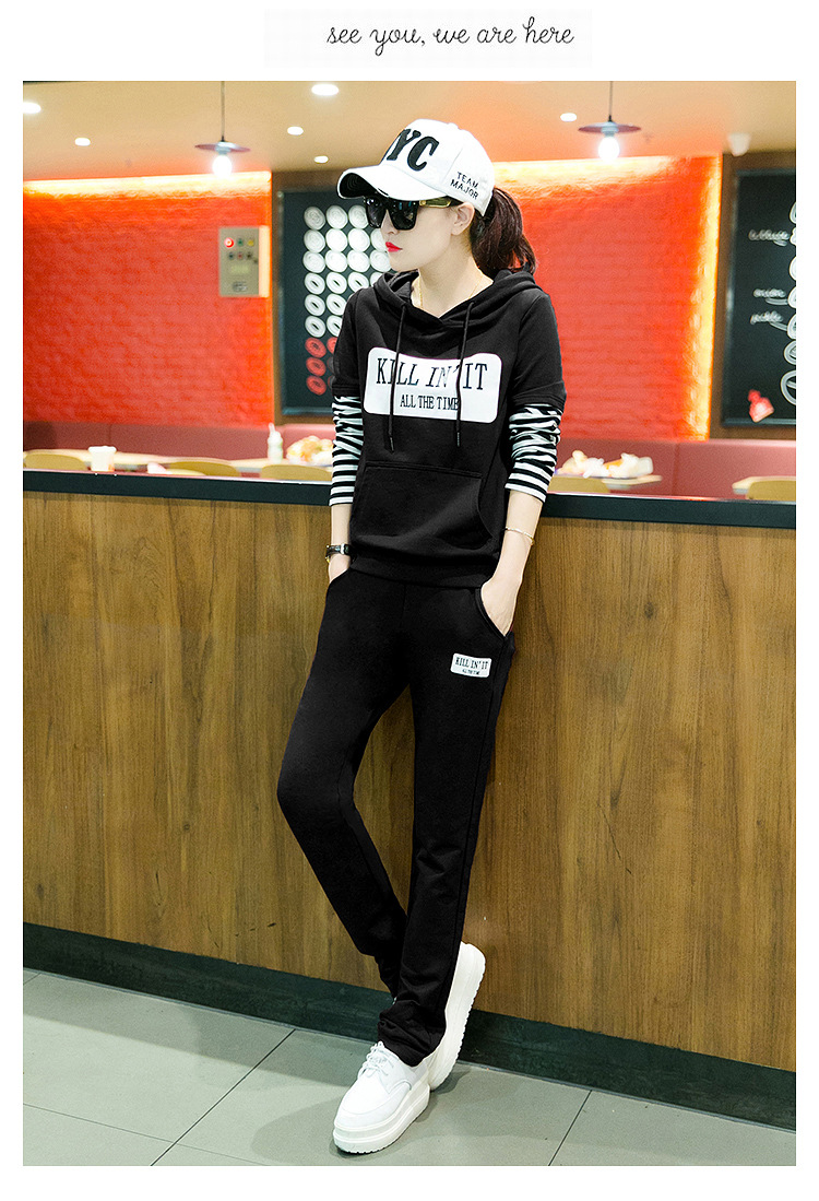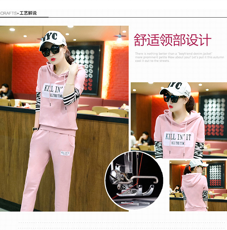【套装女】秋季新款时尚韩版拼接条纹跑步卫衣休闲运动服两件套