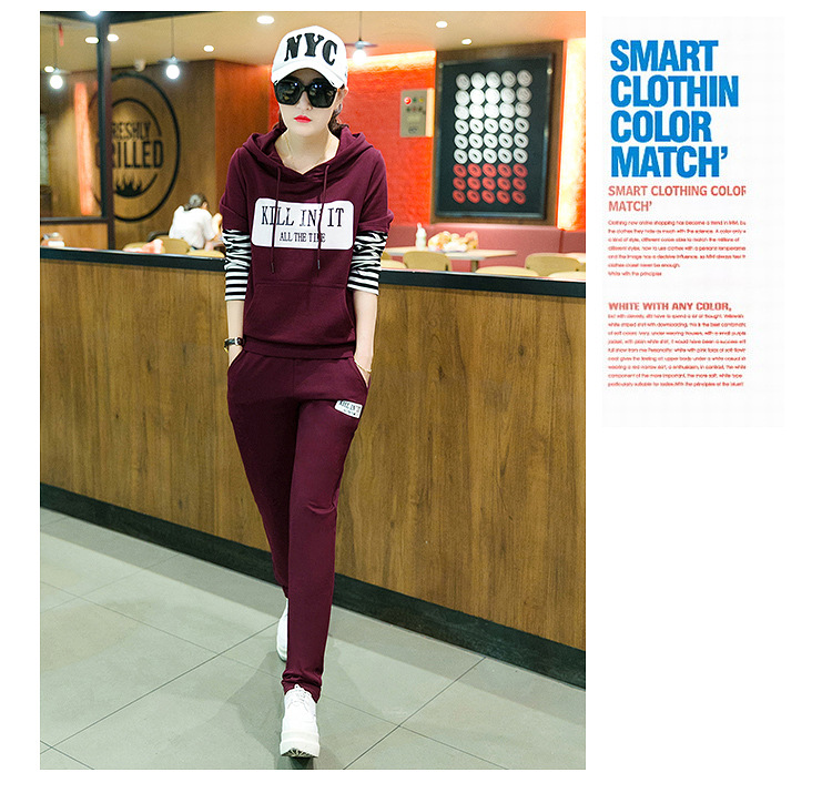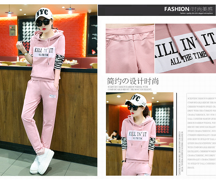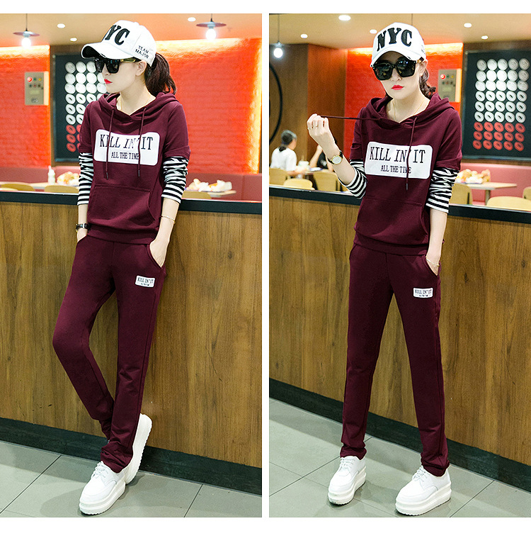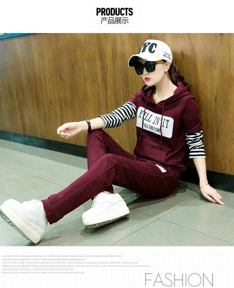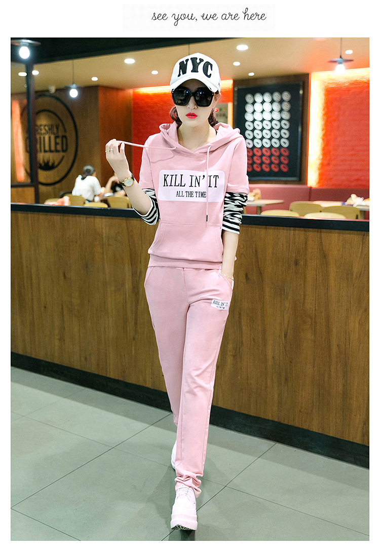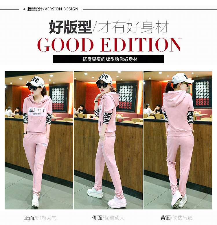 【套装女】秋季新款时尚韩版拼接条纹跑步卫衣休闲运动服两件套