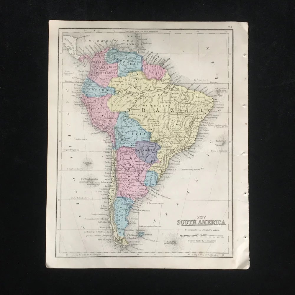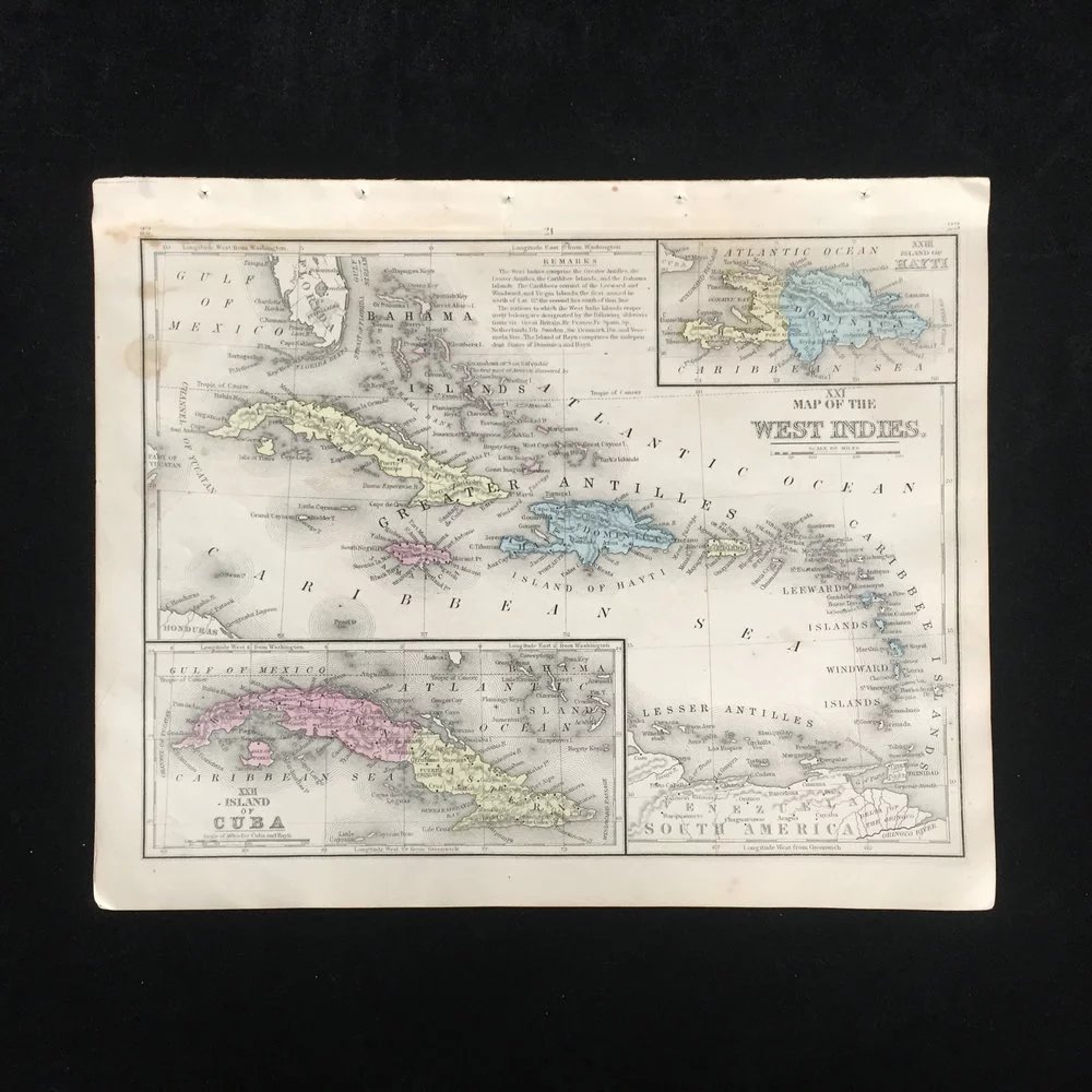 约1860年西印第安与南美洲双面老地图出版年:约1860尺寸: 30*24cm内容清晰,有受潮的形成的黄斑存在,年代感比较强
