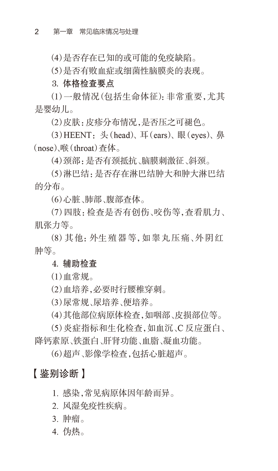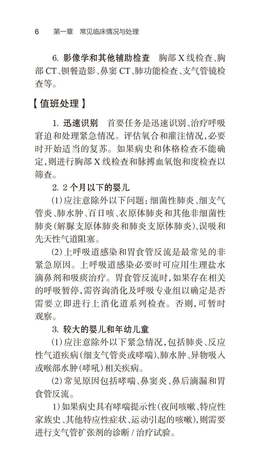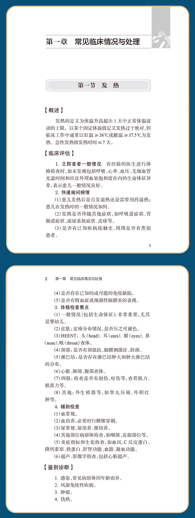第一章 常见临床情况与处理/ 1 第一节 发热 / 1 第二节 咳嗽 / 4 第三节 喘息 / 7 第四节 呼吸窘迫 / 9 第五节 发绀 / 15 第六节 咯血 / 20 第七节 呕吐 / 24 第八节 腹痛 / 27 第九节 腹胀 / 30 第十节 腹泻 / 33 第十一节 胸痛 / 38 第十二节 腰背痛 / 42 第十三节 过敏 / 45 第十四节 昏迷 / 50 第十五节 头痛 / 55 第十六节 惊厥 / 63 第十七节 血尿 / 68 第十八节 便秘 / 72 第十九节 鼻出血 / 75 第二十节 呕血 / 78 第二十一节 低血压与休克 / 81 第二十二节 高血压 / 88 第二十三节 低体温 / 95 第二十四节 尿潴留 / 99 第二十五节 晕厥 / 101 第二十六节 心力衰竭 / 105 第二十七节 呼吸衰竭 / 112 第二十八节 急性肾功能不全 / 118 第二十九节 糖尿病酮症酸中毒 / 124 第三十节 输血反应 / 125 第二章 异常辅助检查结果与处理/ 129 第一节 血小板减少 / 129 第二节 贫血 / 132 第三节 中性粒细胞减少 / 139 第四节 高钙血症 / 143 第五节 低钙血症 / 148 第六节 高钾血症 / 151 第七节 低钾血症 / 154 第八节 高钠血症 / 157 第九节 低钠血症 / 162 第十节 呼吸性酸中毒 / 166 第十一节 代谢性酸中毒 / 168 第十二节 呼吸性碱中毒 / 173 第十三节 代谢性碱中毒 / 174 第十四节 低血糖 / 177 第十五节 室上性心动过速 / 180 第十六节 室性心动过速 / 187 第十七节 心室颤动 / 190 第十八节 房室传导阻滞 / 194 第十九节 凝血障碍 / 198 附录/ 208 附录1 儿童生命体征正常值及体表 面积计算 / 208 附录2 Glasgow 昏迷评分 / 210 附录3 儿童复苏流程 / 211 附录4 常见急救操作 / 215 附录5 国家免疫规划疫苗儿童免疫 程序表(2021 年版) / 224 附录6 常用药物剂量 / 226