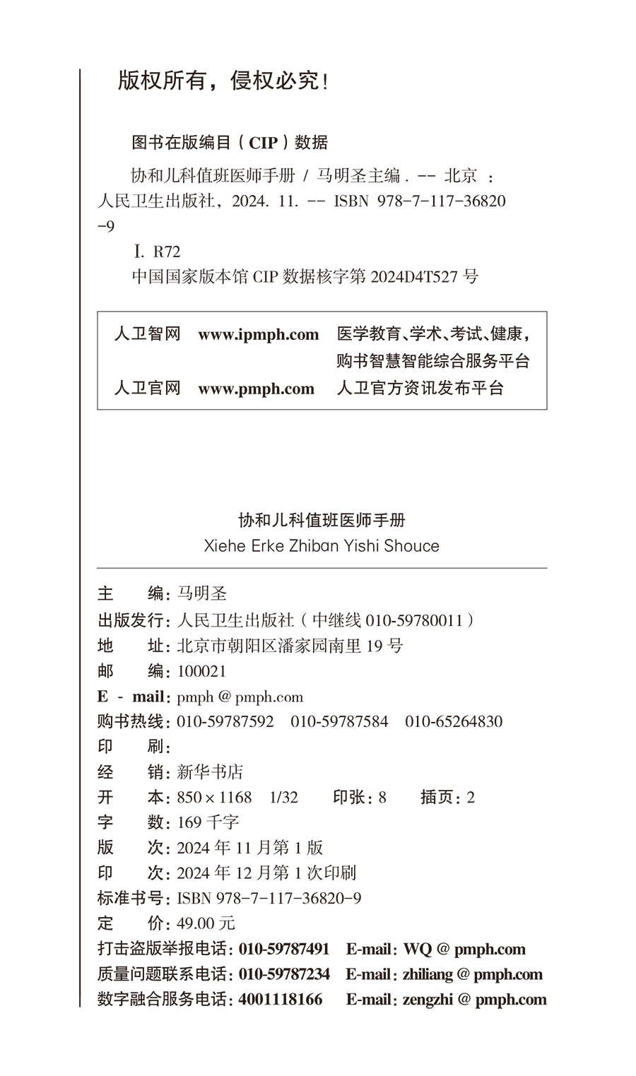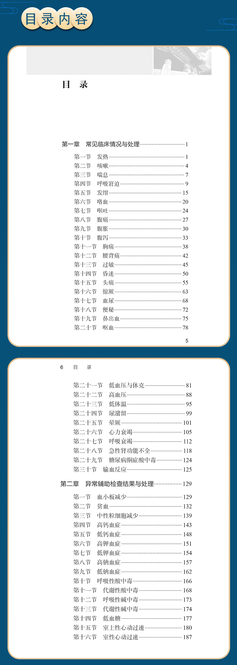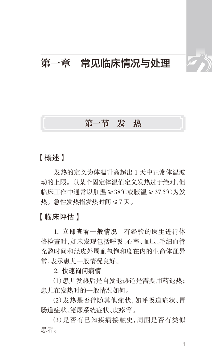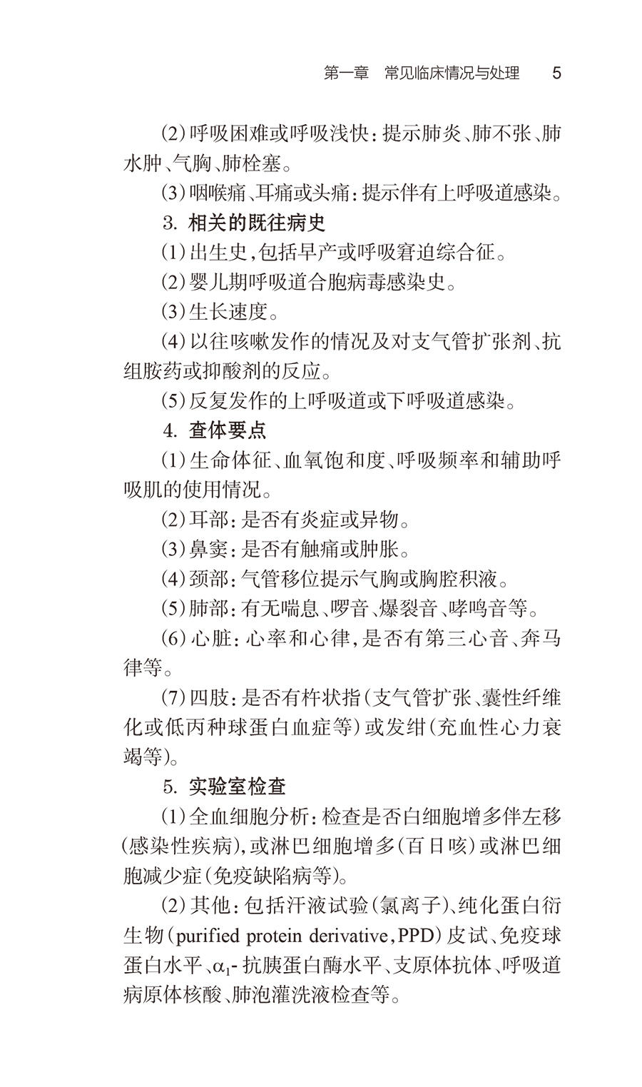 第一章 常见临床情况与处理/ 1 第一节 发热 / 1 第二节 咳嗽 / 4 第三节 喘息 / 7 第四节 呼吸窘迫 / 9 第五节 发绀 / 15 第六节 咯血 / 20 第七节 呕吐 / 24 第八节 腹痛 / 27 第九节 腹胀 / 30 第十节 腹泻 / 33 第十一节 胸痛 / 38 第十二节 腰背痛 / 42 第十三节 过敏 / 45 第十四节 昏迷 / 50 第十五节 头痛 / 55 第十六节 惊厥 / 63 第十七节 血尿 / 68 第十八节 便秘 / 72 第十九节 鼻出血 / 75 第二十节 呕血 / 78 第二十一节 低血压与休克 / 81 第二十二节 高血压 / 88 第二十三节 低体温 / 95 第二十四节 尿潴留 / 99 第二十五节 晕厥 / 101 第二十六节 心力衰竭 / 105 第二十七节 呼吸衰竭 / 112 第二十八节 急性肾功能不全 / 118 第二十九节 糖尿病酮症酸中毒 / 124 第三十节 输血反应 / 125 第二章 异常辅助检查结果与处理/ 129 第一节 血小板减少 / 129 第二节 贫血 / 132 第三节 中性粒细胞减少 / 139 第四节 高钙血症 / 143 第五节 低钙血症 / 148 第六节 高钾血症 / 151 第七节 低钾血症 / 154 第八节 高钠血症 / 157 第九节 低钠血症 / 162 第十节 呼吸性酸中毒 / 166 第十一节 代谢性酸中毒 / 168 第十二节 呼吸性碱中毒 / 173 第十三节 代谢性碱中毒 / 174 第十四节 低血糖 / 177 第十五节 室上性心动过速 / 180 第十六节 室性心动过速 / 187 第十七节 心室颤动 / 190 第十八节 房室传导阻滞 / 194 第十九节 凝血障碍 / 198 附录/ 208 附录1 儿童生命体征正常值及体表 面积计算 / 208 附录2 Glasgow 昏迷评分 / 210 附录3 儿童复苏流程 / 211 附录4 常见急救操作 / 215 附录5 国家免疫规划疫苗儿童免疫 程序表(2021 年版) / 224 附录6 常用药物剂量 / 226