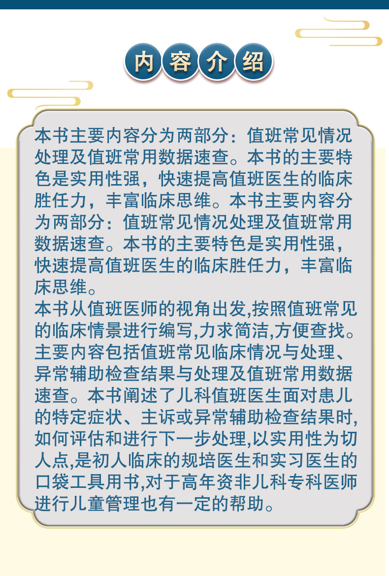 本书主要内容分为两部分:值班常见情况处理及值班常用数据速查。本书的主要特色是实用性强,快速提高值班医生的临床胜任力,丰富临床思维。本书主要内容分为两部分:值班常见情况处理及值班常用数据速查。本书的主要特色是实用性强,快速提高值班医生的临床胜任力,丰富临床思维。