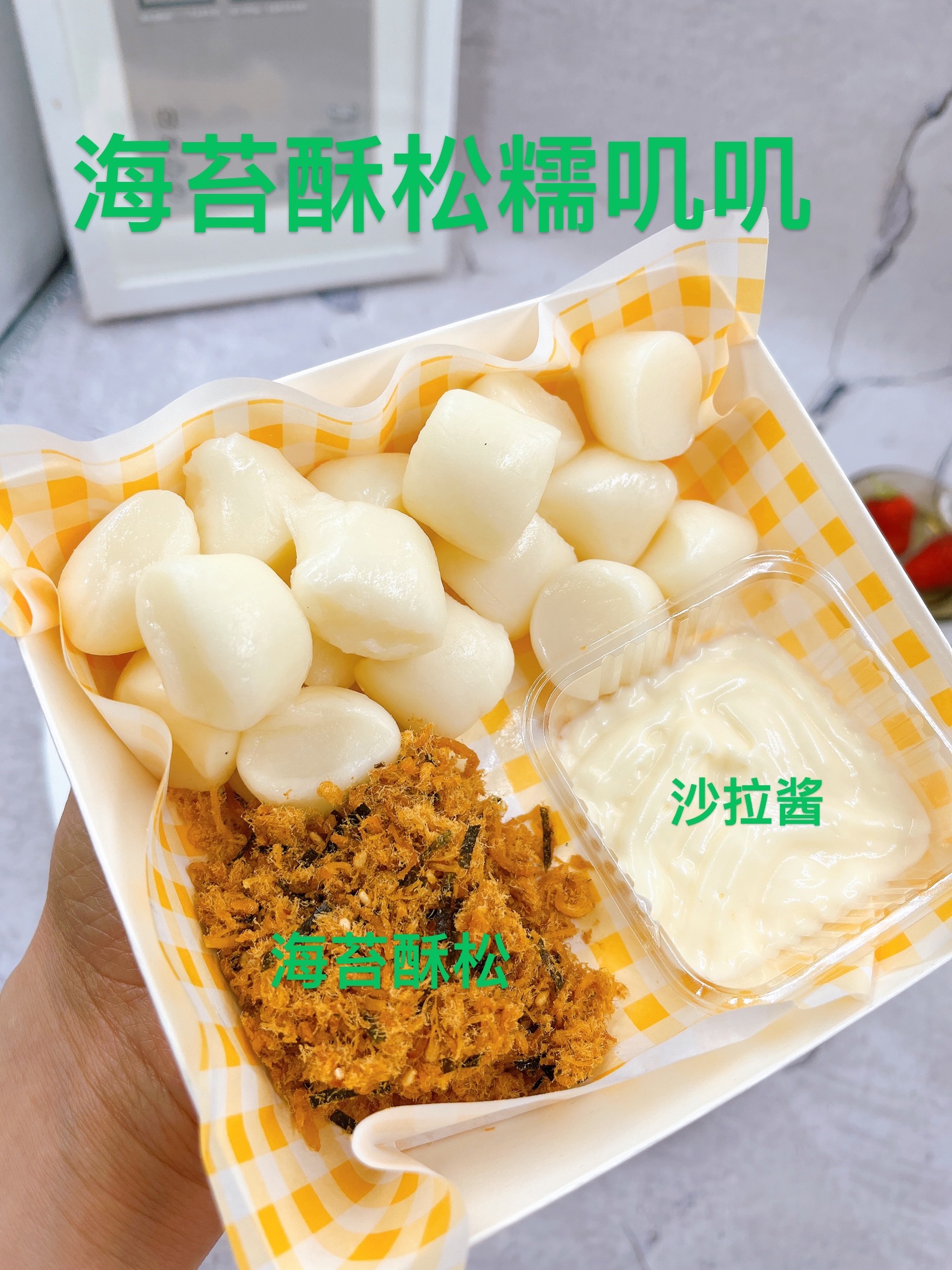 配料:糯米粉、淀粉、牛奶、白砂糖、玉米油、海苔酥酥、沙拉酱