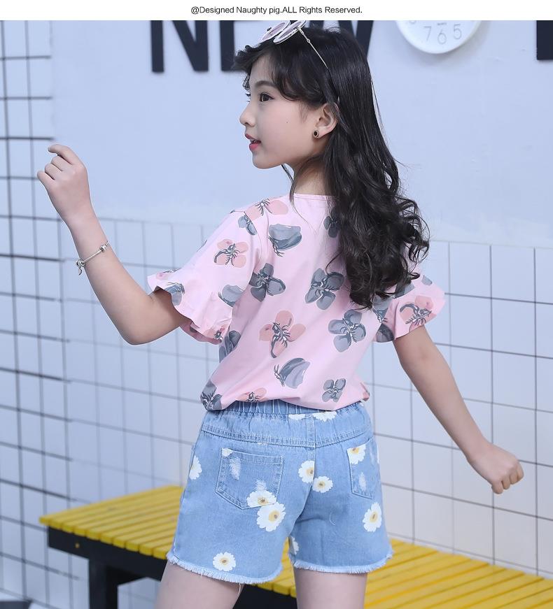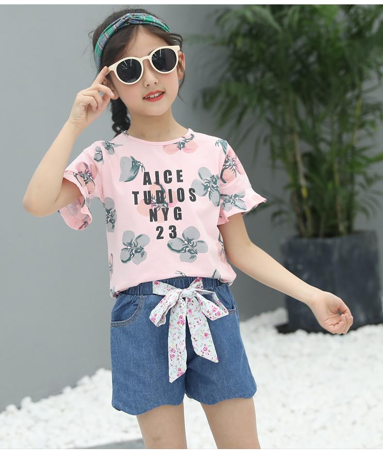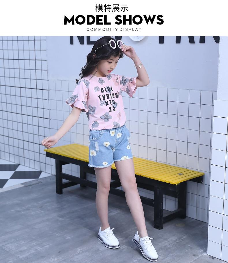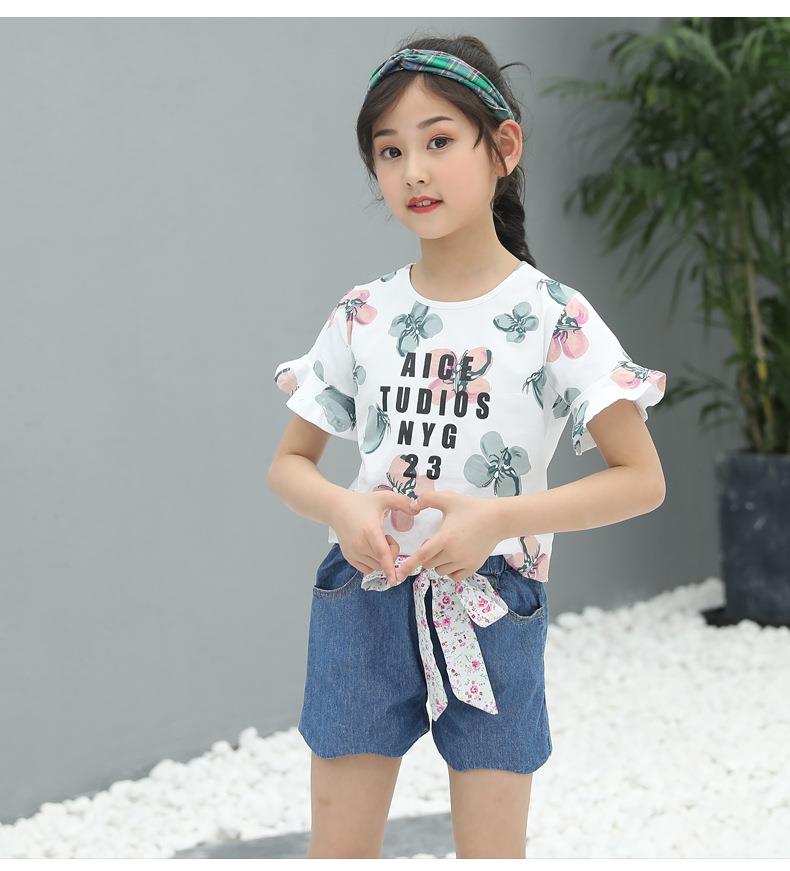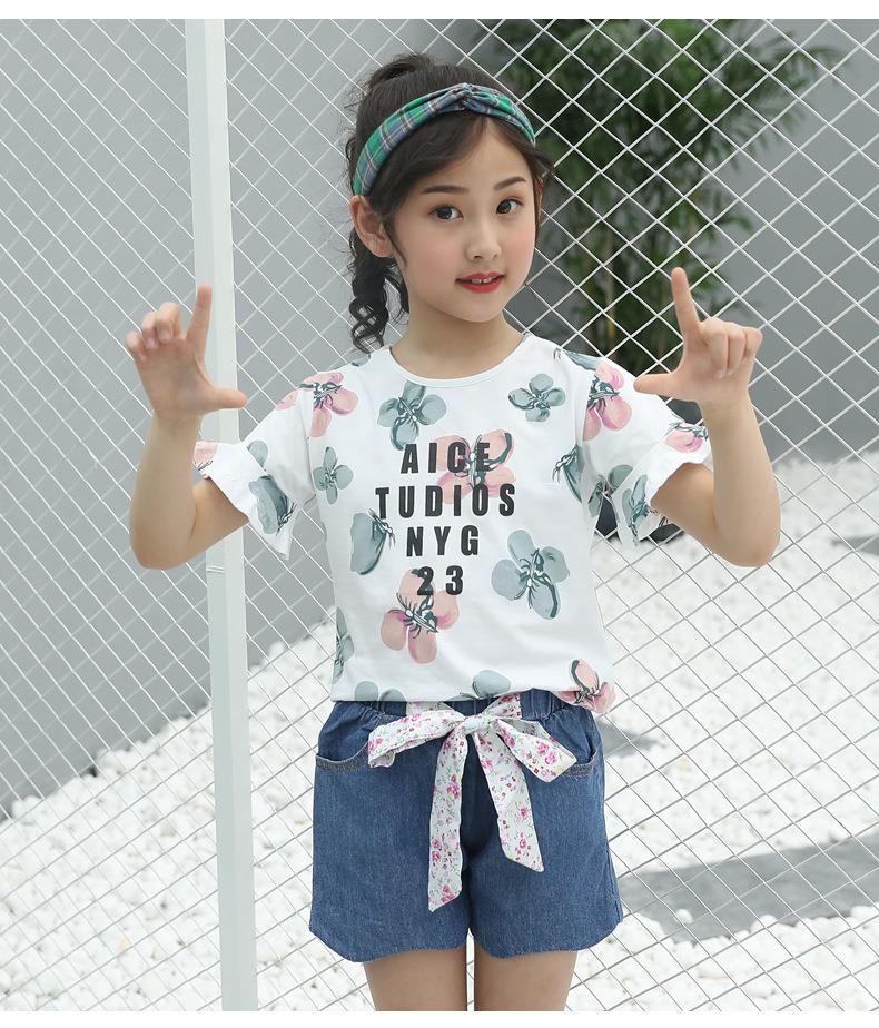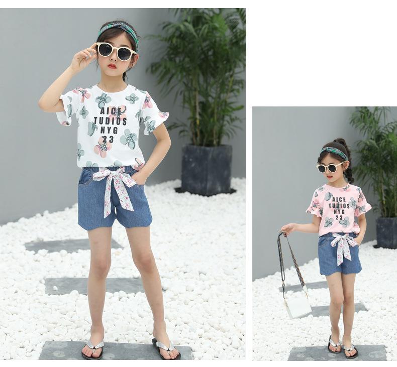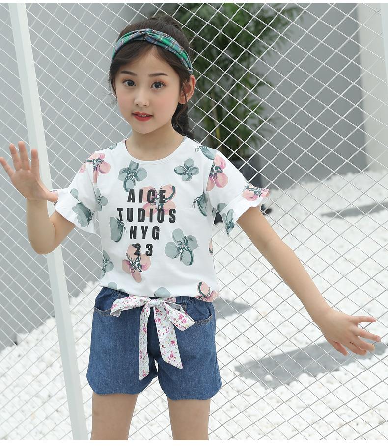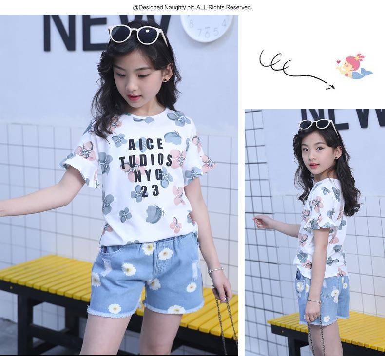 2023新款女童韩版套装中大童短袖T恤短裤夏季童装女童牛仔两件套