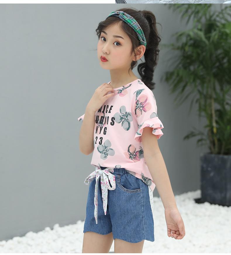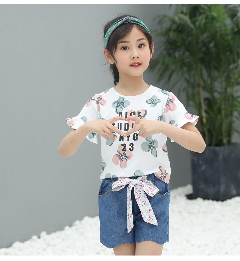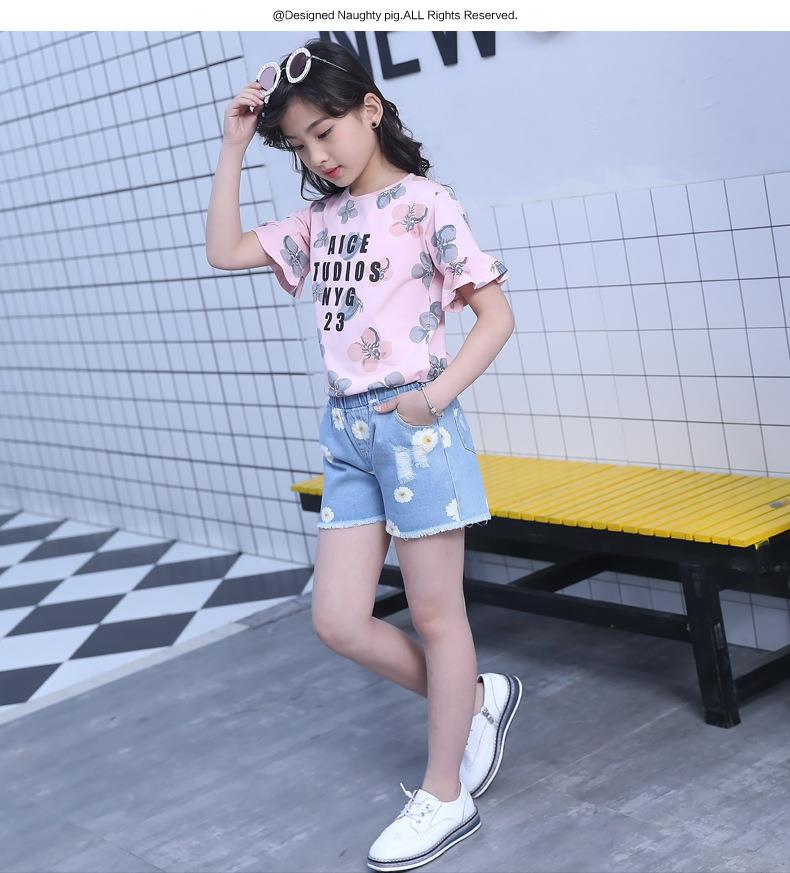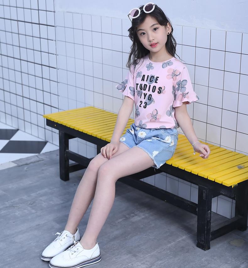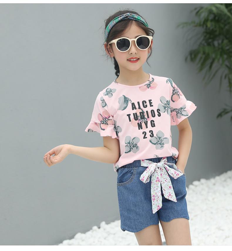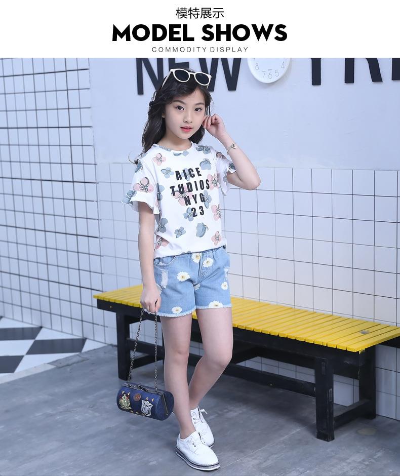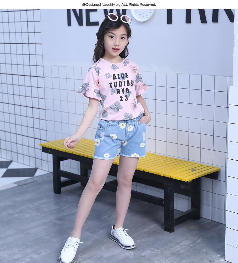 2023新款女童韩版套装中大童短袖T恤短裤夏季童装女童牛仔两件套