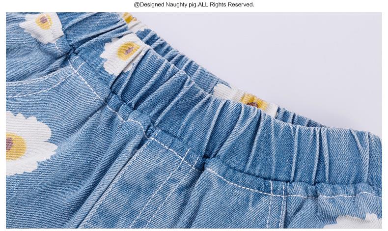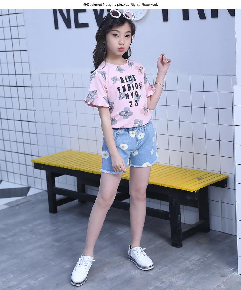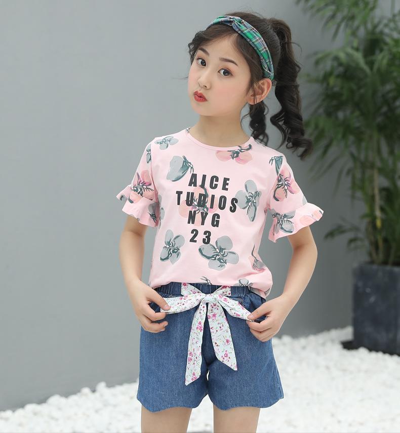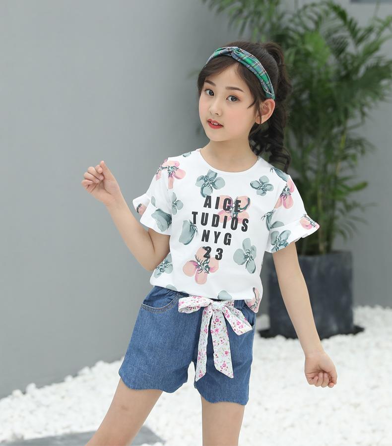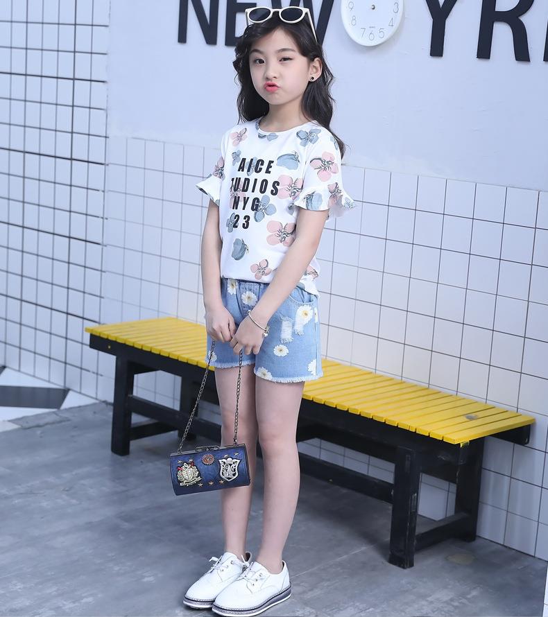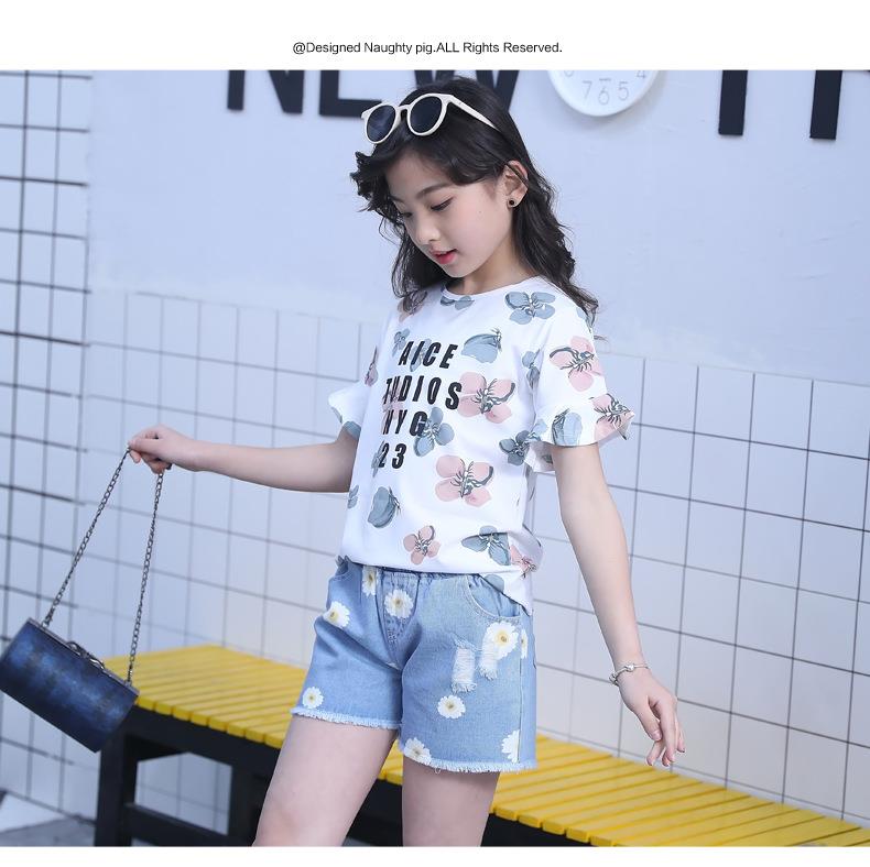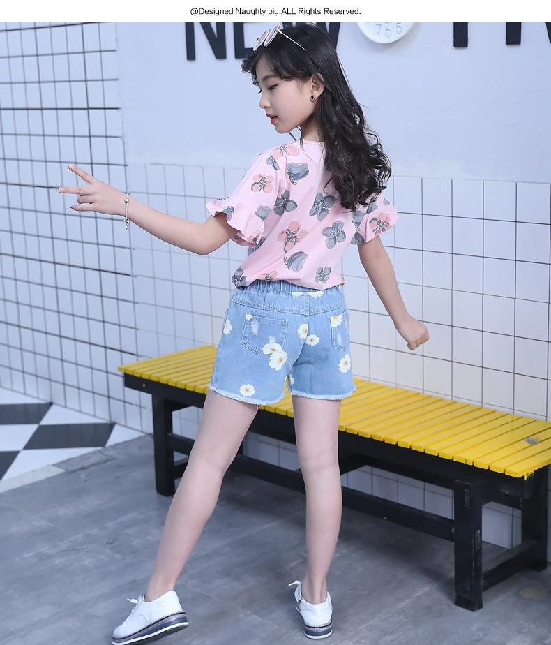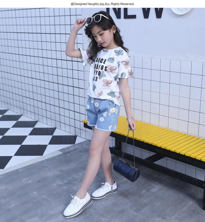 2023新款女童韩版套装中大童短袖T恤短裤夏季童装女童牛仔两件套