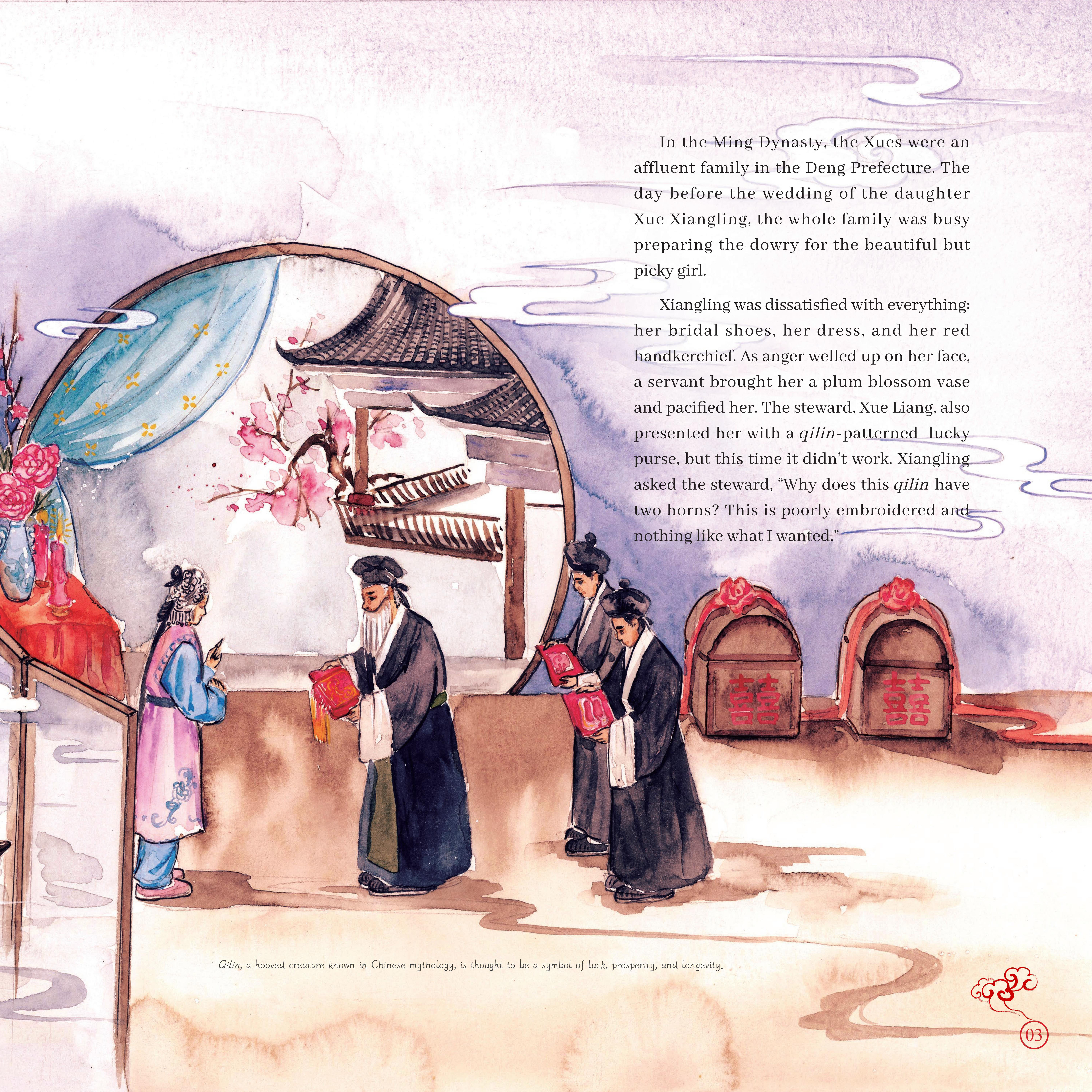 绘本改编自京剧《锁麟囊》。登州富家小姐薛湘灵出嫁,婚期中途遇雨,在亭中暂避,巧遇另一出嫁新娘赵守贞。薛湘灵见赵守贞因身世贫苦凄凉而悲啼,遂以锁麟囊相赠。六年后登州大水,薛湘灵和家人失散,漂流到莱州,入卢府成为卢家儿子的保姆。机缘巧合之下,薛湘灵在卢府的小楼里见到了当年送出的锁麟囊,不觉感泣。原来卢夫人就是当年的赵守贞,她得知真相后,与薛湘灵结为姊妹,并帮助她一家团聚。书后配有相应的剧种知识介绍。书中插图从人物造型到环境布局,从亭台楼阁到一草一木,都细腻传神,充满了古朴优雅的意蕴,使读者仿佛身临“戏”境,具有极强的艺术感染力。