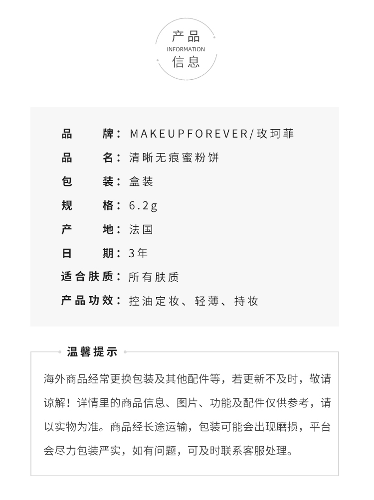MAKEUPFOREVER玫珂菲清晰无痕蜜粉饼定妆控油补妆6.2g
