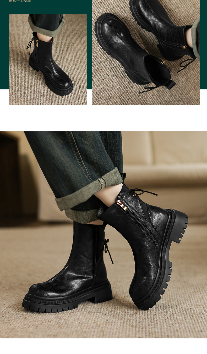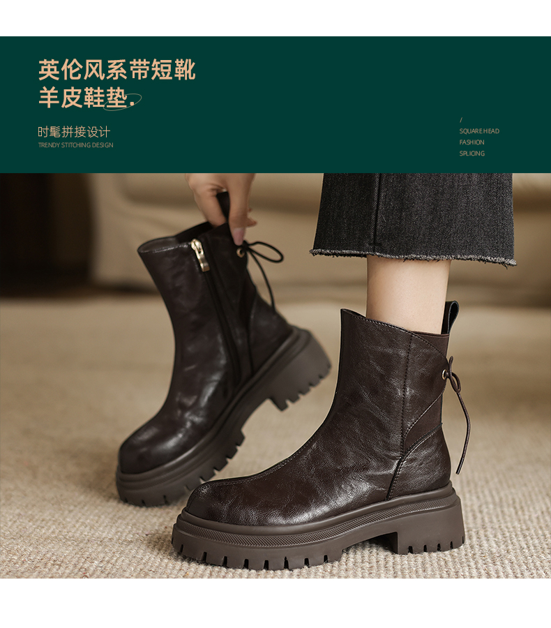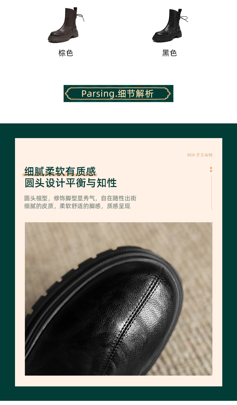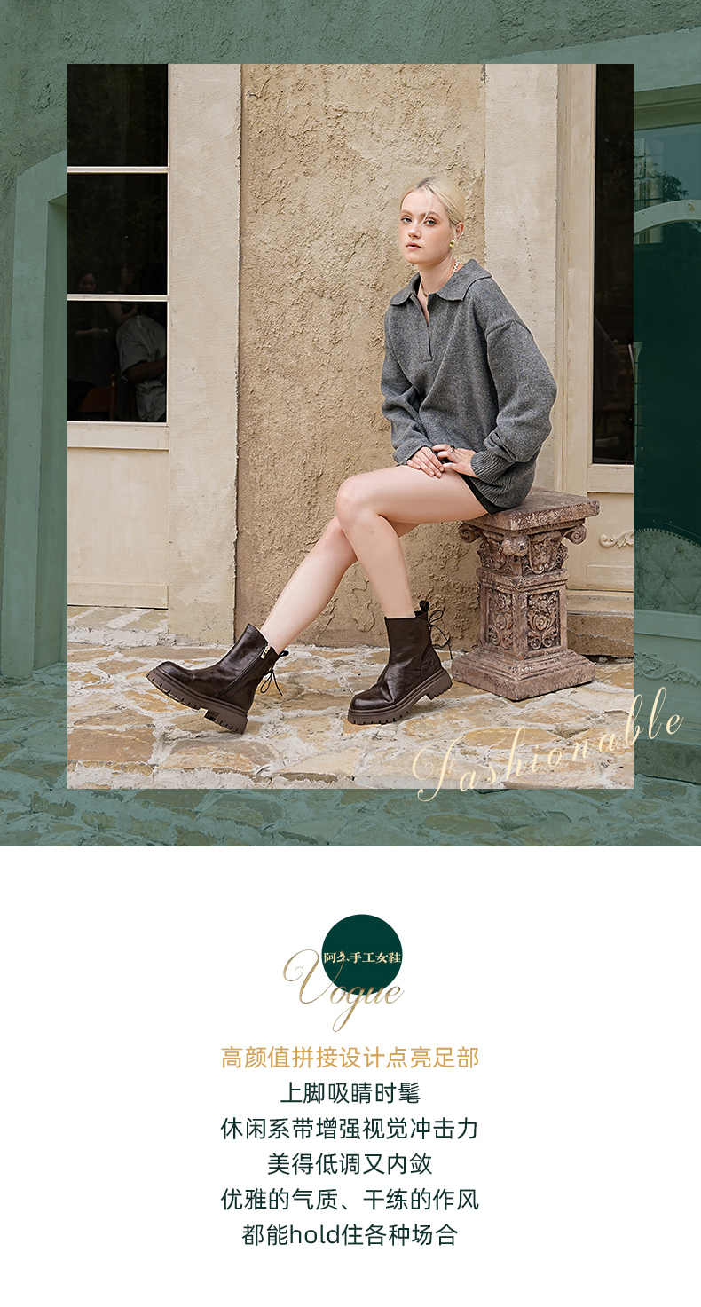 阿么手工女鞋新款拼接后绑带牛皮厚底短靴5CM高级感小众百搭靴子