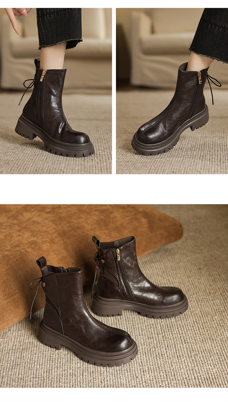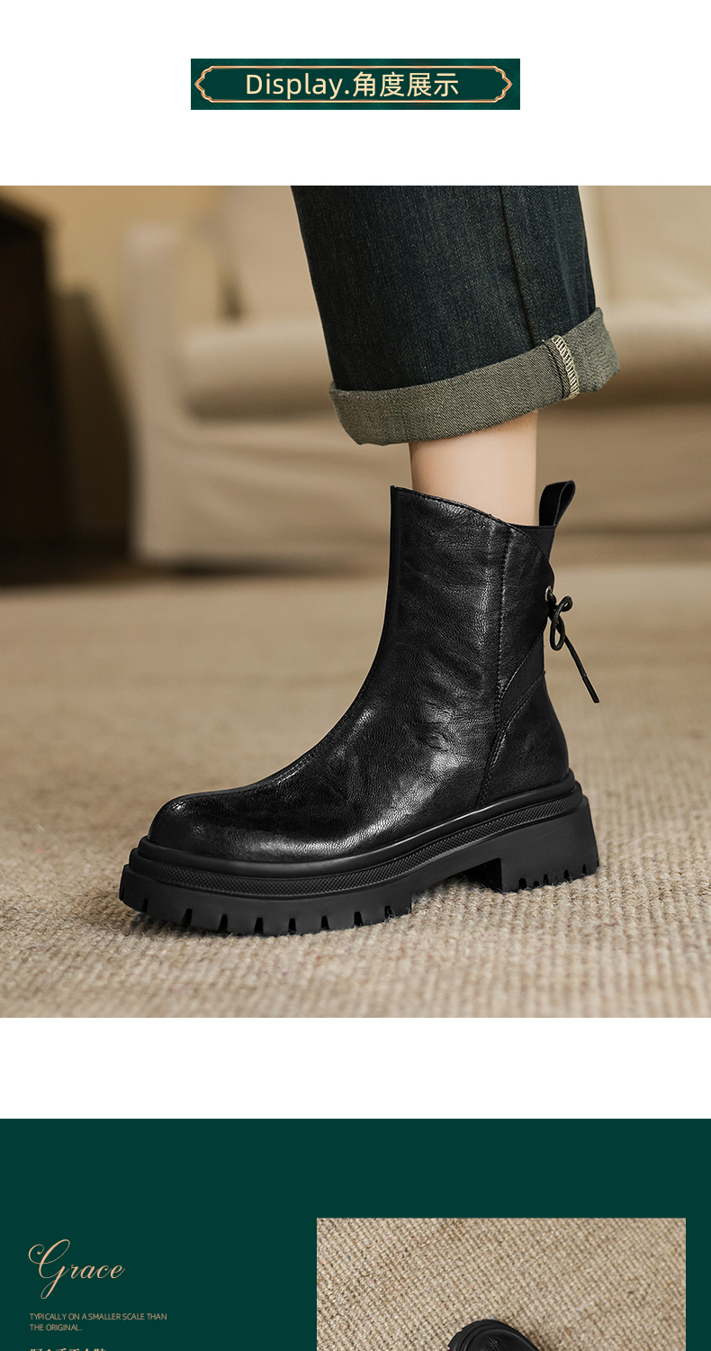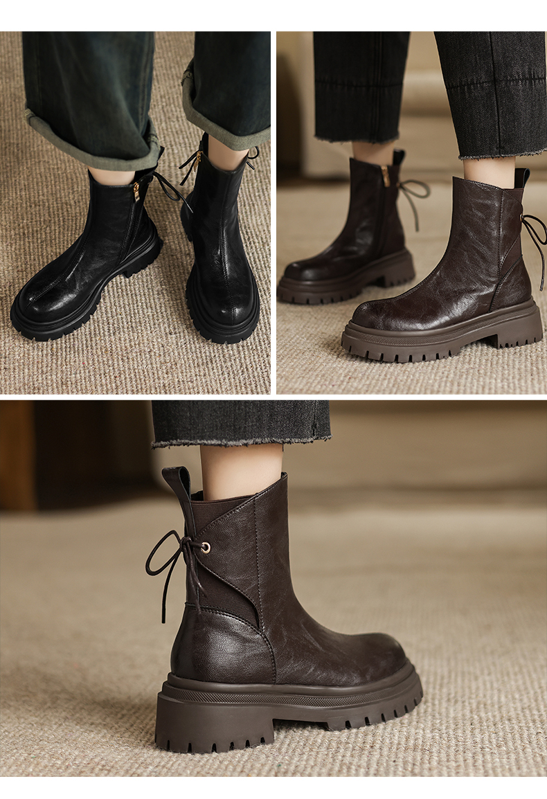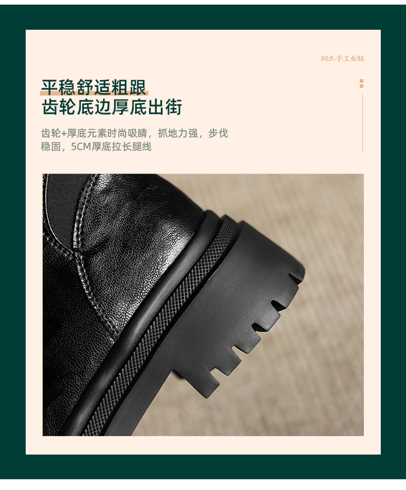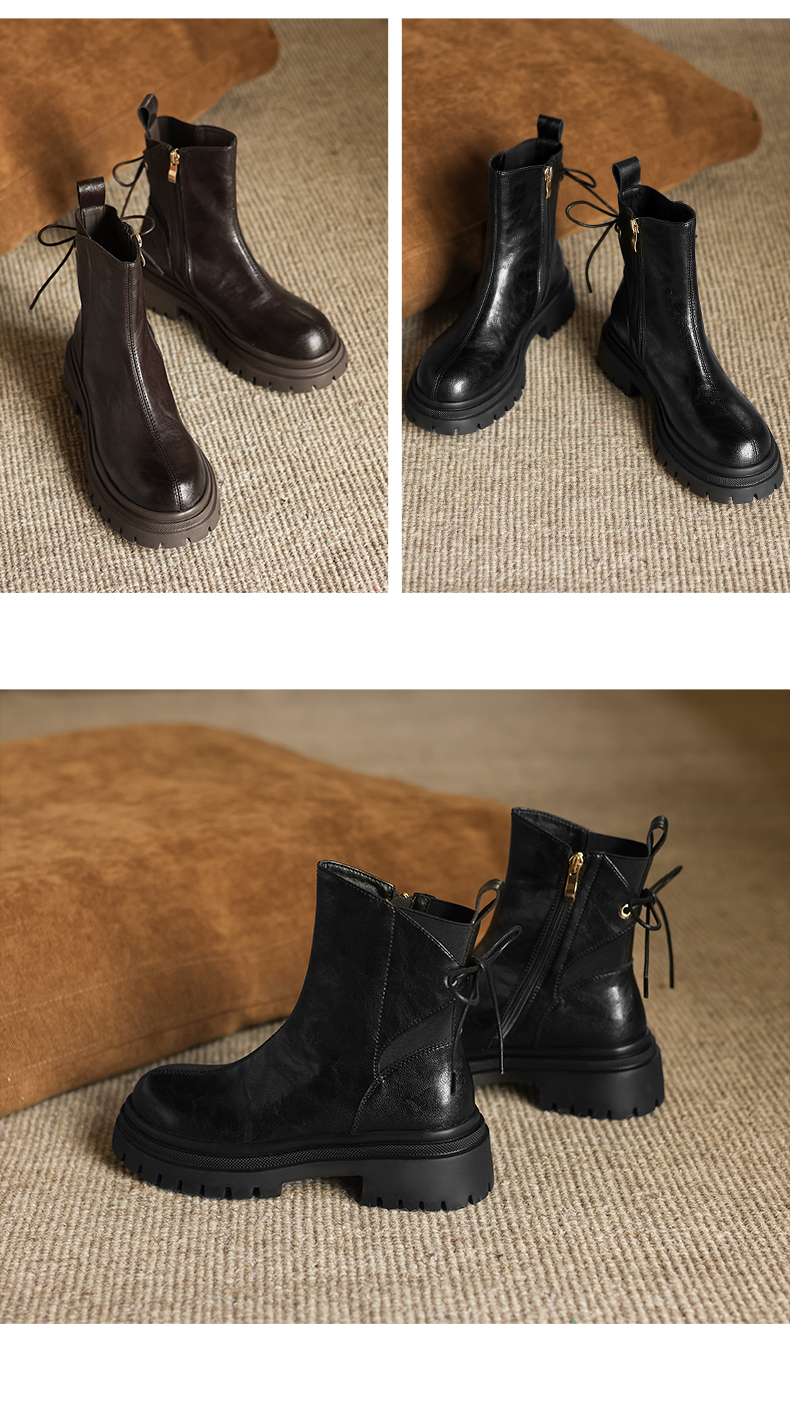 阿么手工女鞋新款拼接后绑带牛皮厚底短靴5CM高级感小众百搭靴子