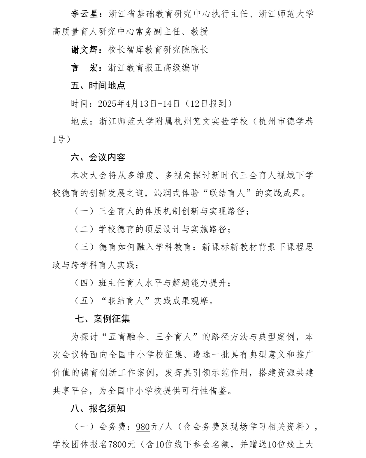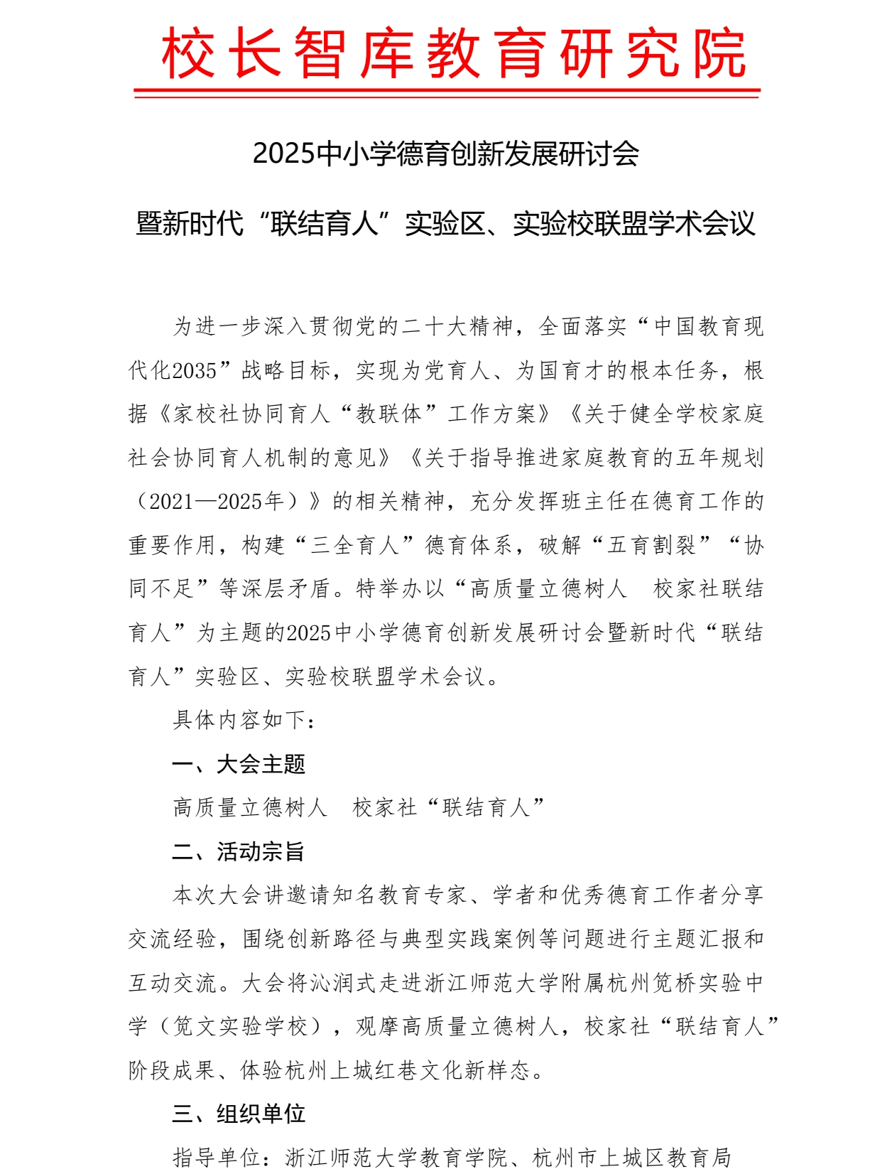 2025中小学德育创新发展研讨会暨新时代“联结育人”实验区、实验校联盟学术会议 高质量立德树人 校家社联结育人 2025年4月13-14日(12日报到)浙江·杭州